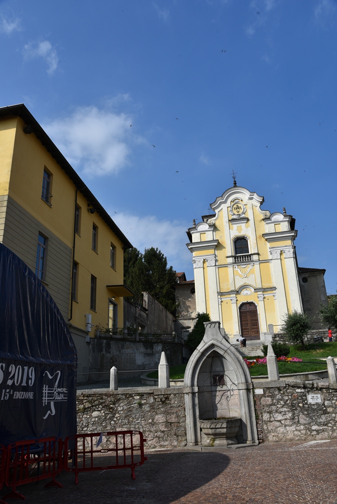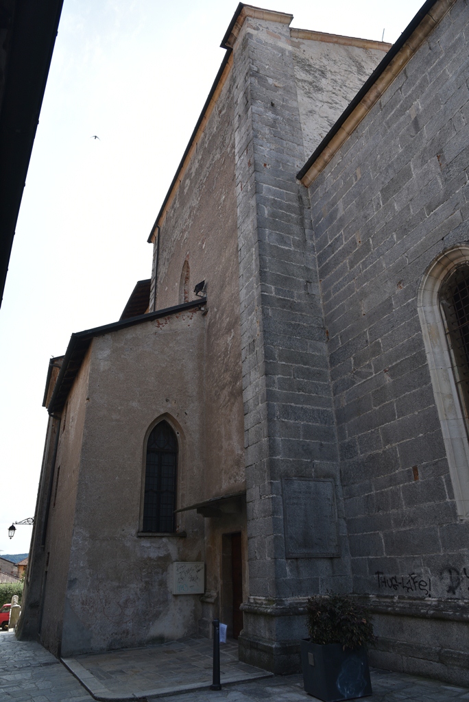 Chiesa a impianto longitudinale a unica navata suddivisa in due grandi campate coperte a ogiva e scandite da sottarchi a pieno centro (il primo entrando) e acuto (il secondo entrando); il profondo vano absidale, con semicupole a spicchi, è illuminato da due lunghe finestre ad arco. La grande navata è marcata verticalmente da semi-colonne con capitello interrotte da una trabeazione che percorre orizzontalmente le pareti a metà altezza: nella zona inferiore si aprono due brevi cappelle su ogni lato, in asse con le lunghe finestre della zona superiore. Lungo la parete sinistra (entrando) e in corrispondenza dell’ingresso laterale si apre uno stretto corridoio concluso da un vano a pianta irregolare che funge da sacrestia. La facciata, definita “tabernacolare” dal Baroni (V. bibliografia), è caratterizzata dallo spiccato verticalismo delle lesene laterali binate, pausato alla trabeazione e ripreso dai tabernacolini su queste insistenti; “il fastigio ricurvo con lo stemma della Compagnia di Gesù conclude la composizione della facciata, decorata molto sobriamente da motivi a stucco appena distesi sulle superfici, di fattura particolarmente raffinata e riconducibile ad ambiente ticinese” (D. Fea Biancolini, in Arona Sacra l’epoca dei Borromeo, Arona 1977, p. 129). Nel campo centrale, delimitato da lesene più piccole delle precedenti e montate in ordine saliente, vi sono il portale , una finestra con balaustra e il già citato stemma gesuitico