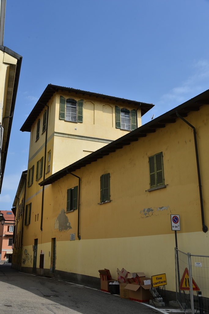 Costruzione a due piani f.t. coperta da tetto a due falde (su ogni manica). L’interno è sviluppato intorno ad un cortile quadrangolare privo di elementi di specifico interesse formale. Alcuni ambienti a piano terra hanno volte a crociera e a botte. Il prospetto esterno su via C. Battisti è caratterizzato dalle grandi arcate del piano terreno – chiuse con grate o con battenti – e dalla teoria di finestre rettangolari del primo piano. Lungo lo stesso prospetto si trova una piccola edicola con cornice in pietra con piccolo fastigio ricurvo e mensole decorate: nello sfondato si notano tracce di affresco. Nel prospetto su via Dei Mulini si aprono alcune finestre rettangolari al primo piano, mentre a p.t. vi è uno stretto ingresso rettangolare con un’apertura immediatamente sopra ad esso e una grande apertura quadrata schermata da grata in ferro