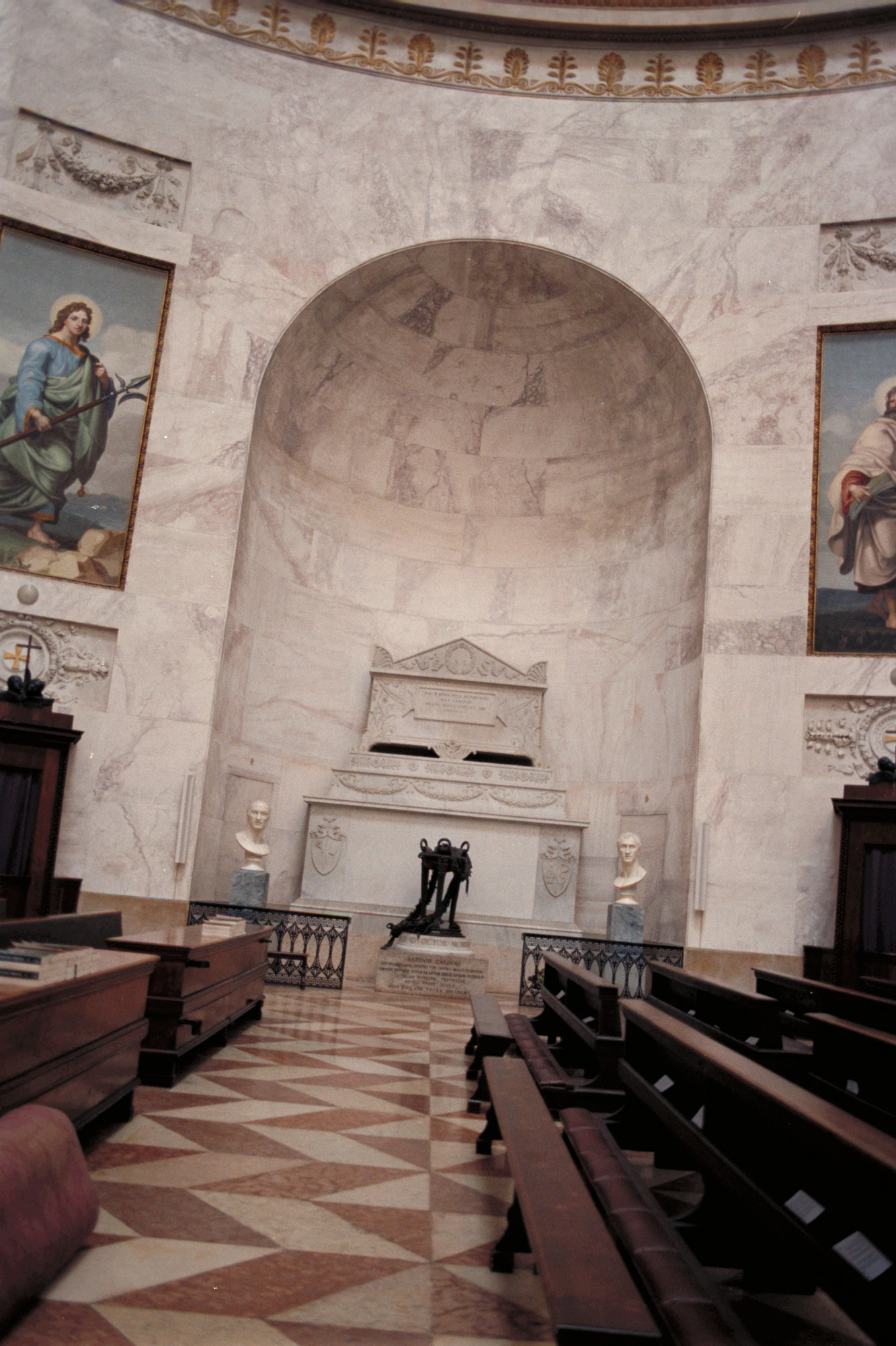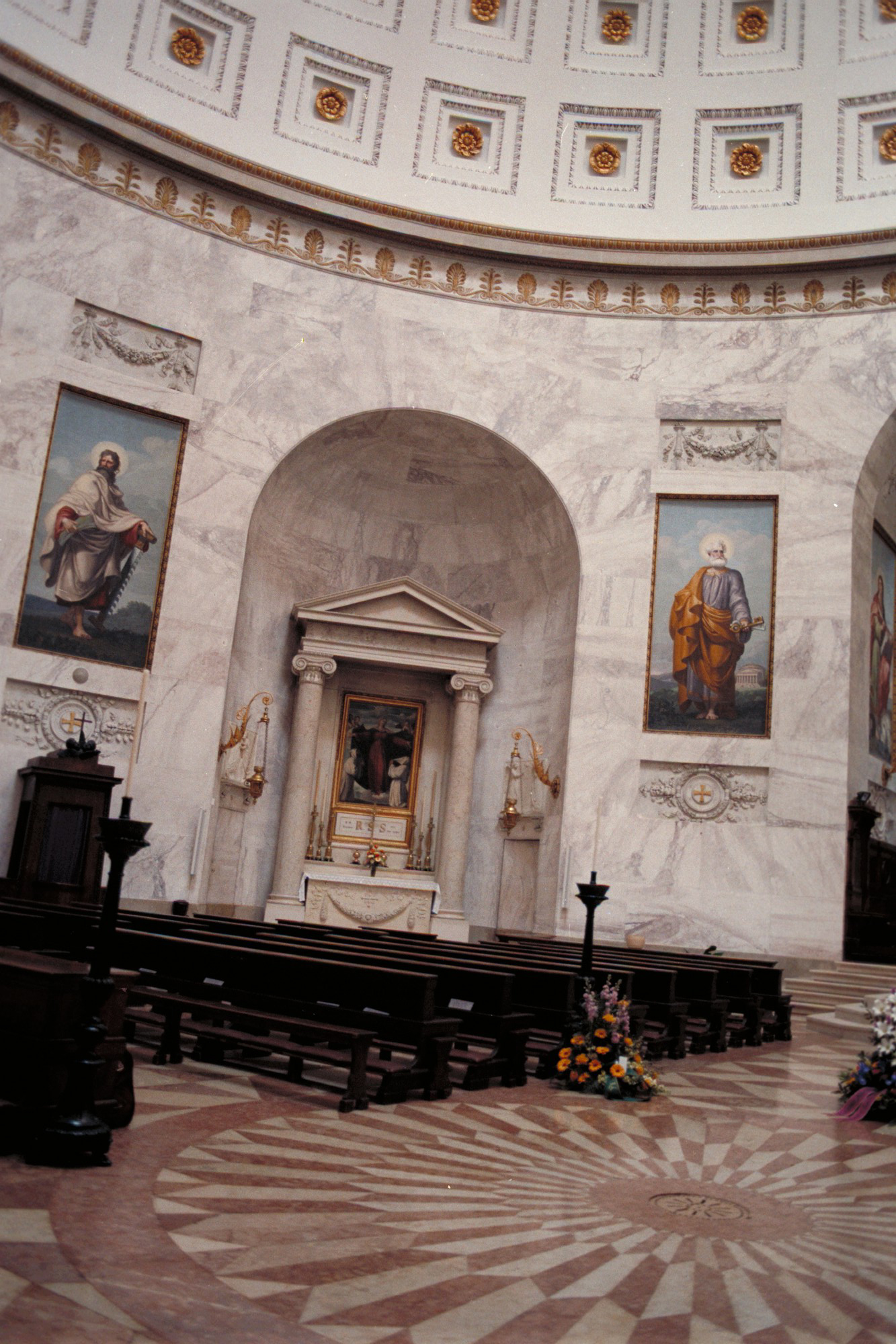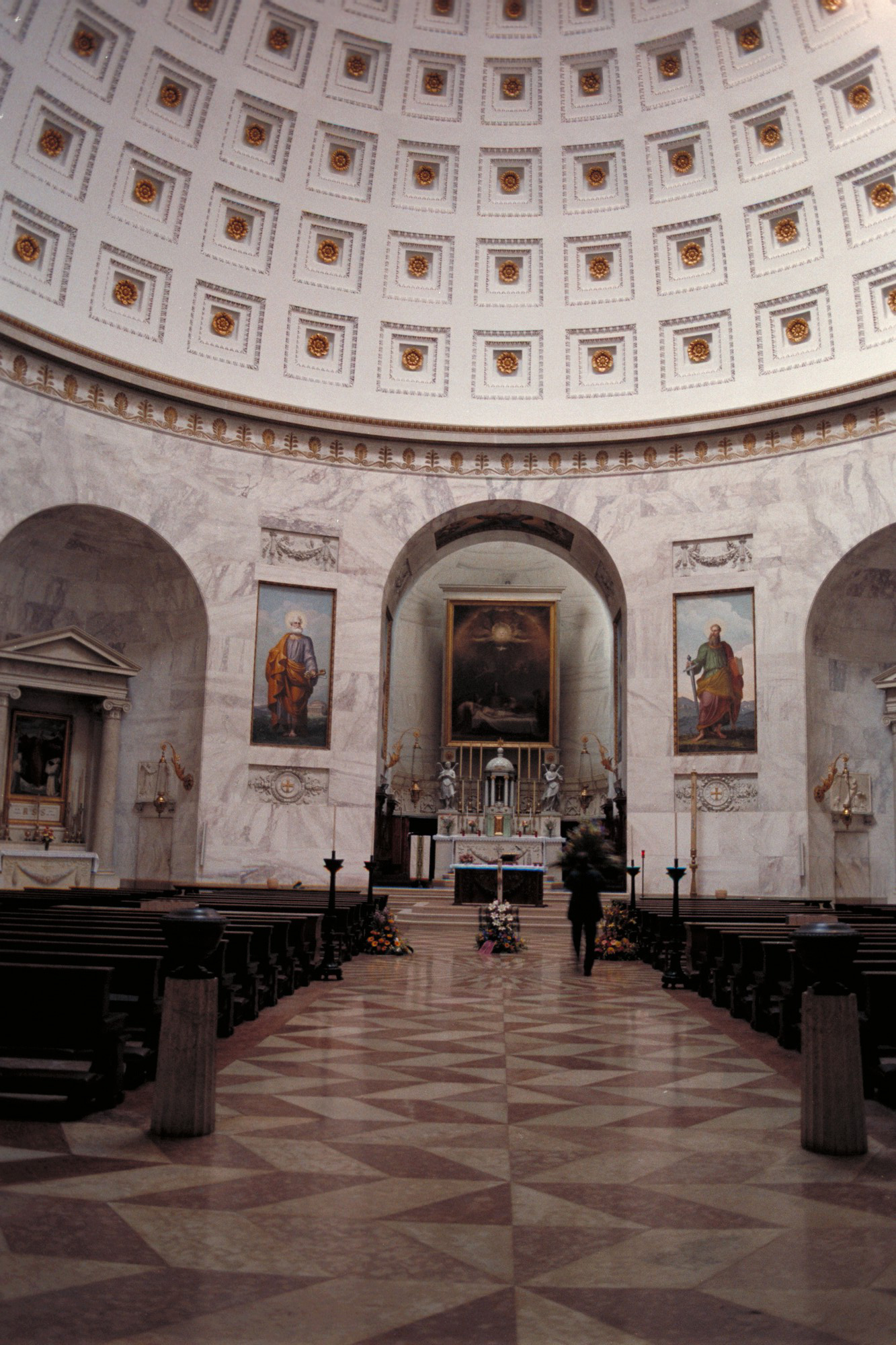 edificio a pianta circolare con pronao a colonne con timpano triangolare sul lato est, coperto a cupola su modello del Pantheon. Internamente l'edif ificio è suddiviso in aula a pianta circolare con entrata e altare lungo l'asse est-ovest e cappelle semicircolari. Dietro l'altare sono ubicate lesacrestie e gli accessi all'organo a livello superiore, tramite scaletta