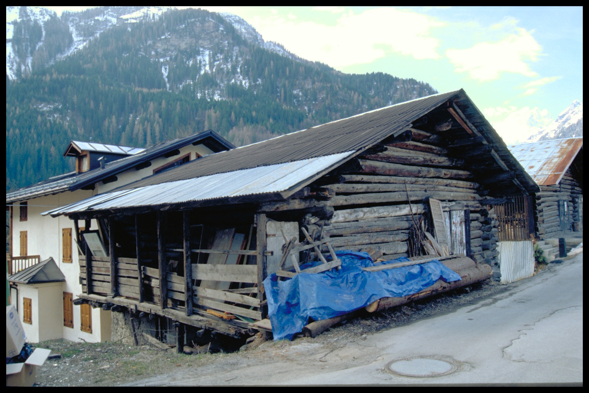 Struttura orizzontale in legno e pietra, struttura verticale in legno e pietra intonacata, tetto in legno a più falde con copertura in lamiera