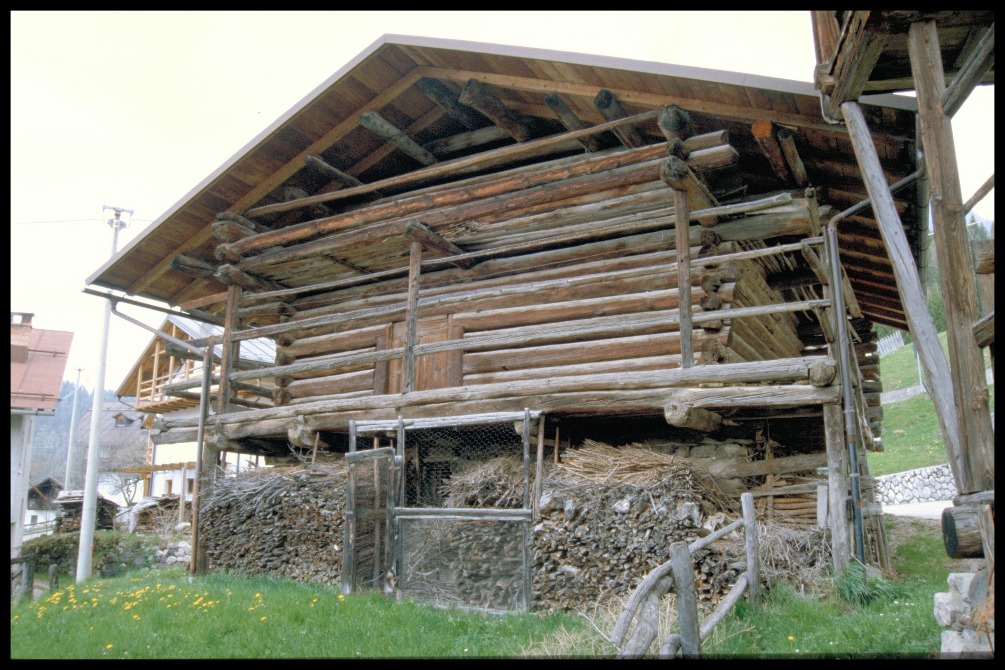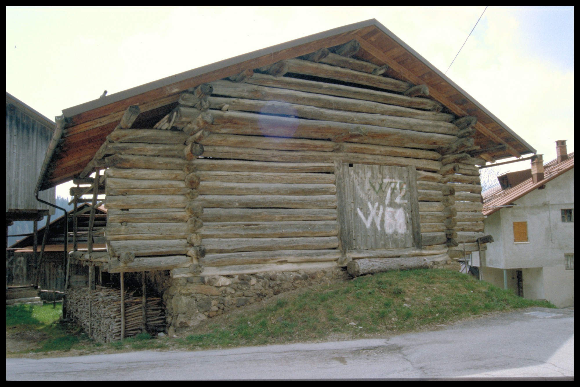 Strutture orizzontale in tronchi di larice, struttura verticale in tronchi di larice, tetto in legno a due falde con copertura in lamiera