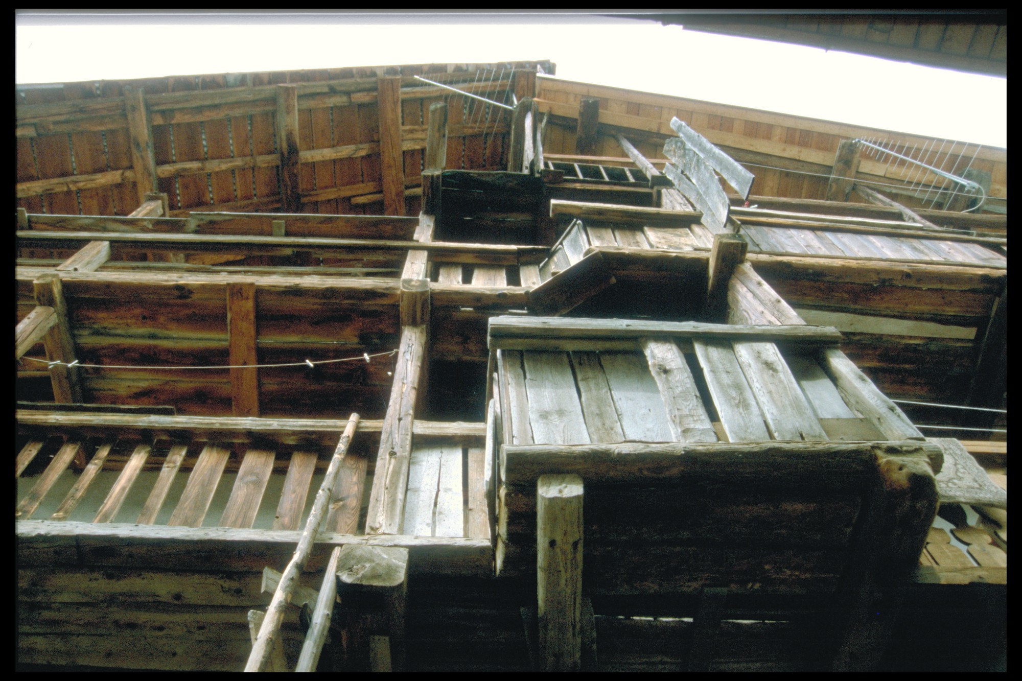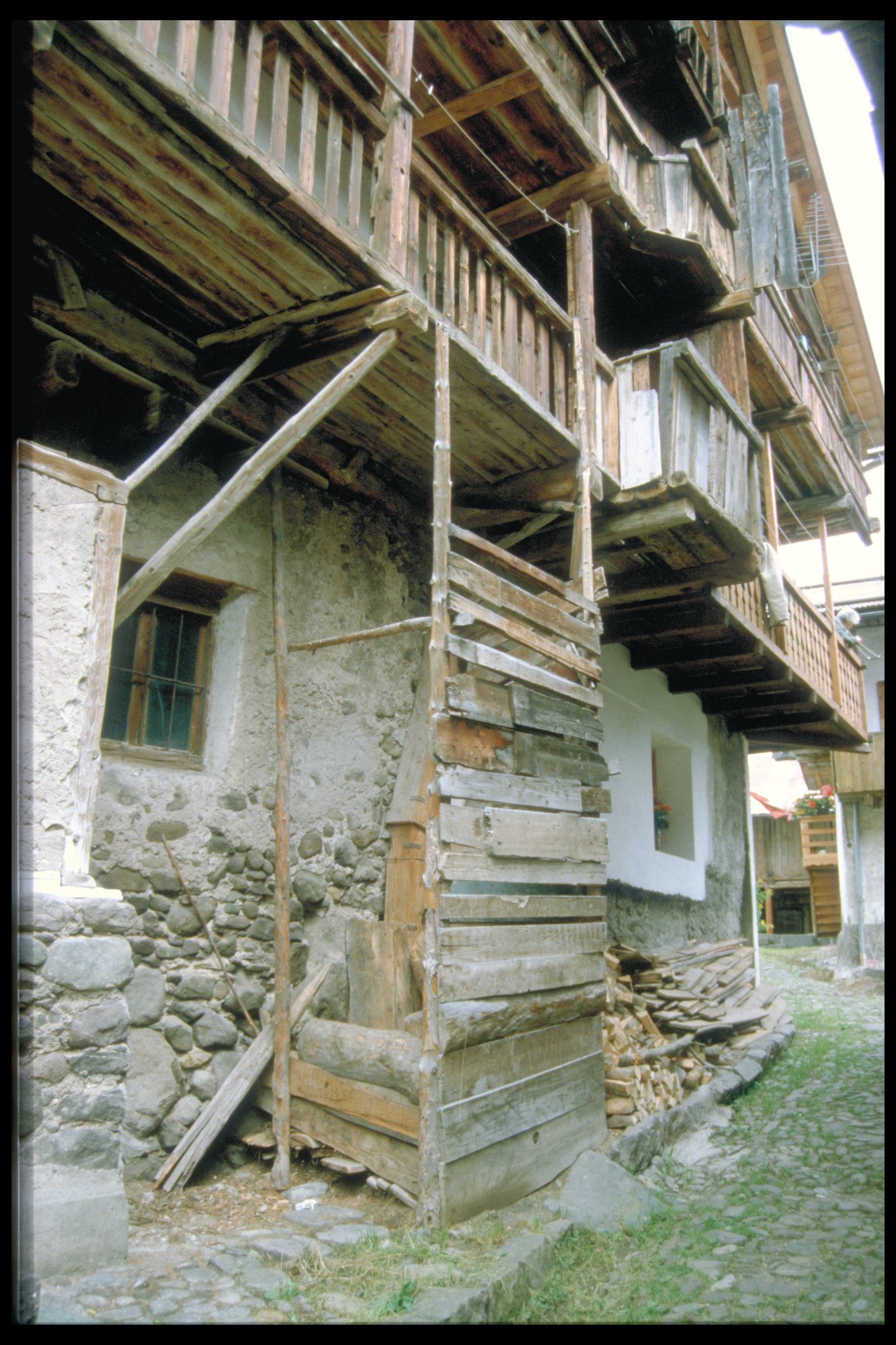 Struttura orizzontale in legno, struttura verticale in pietra e legno, tetto in legno a più falde con copertura in lamiera