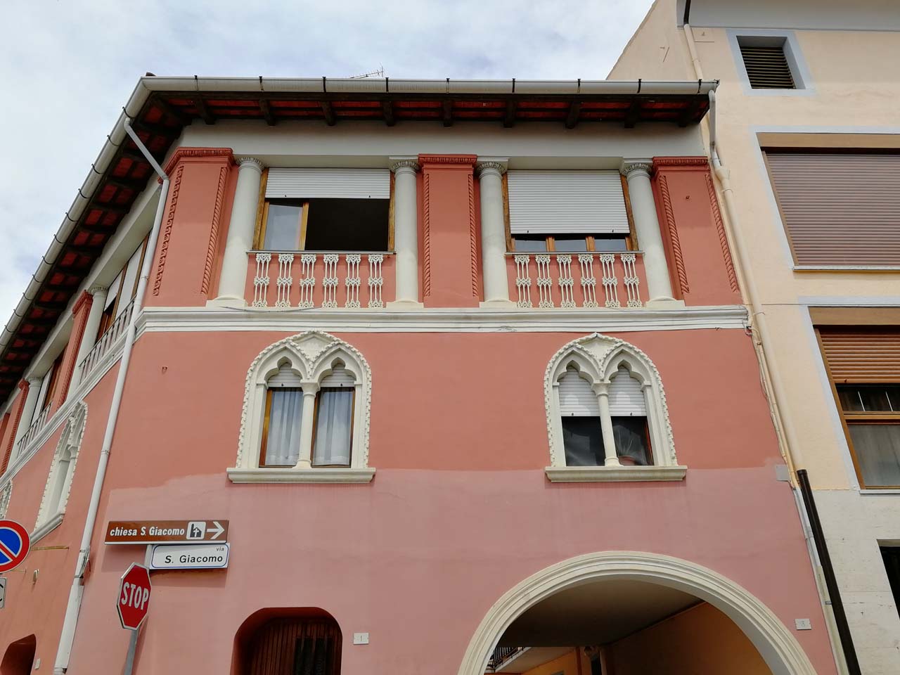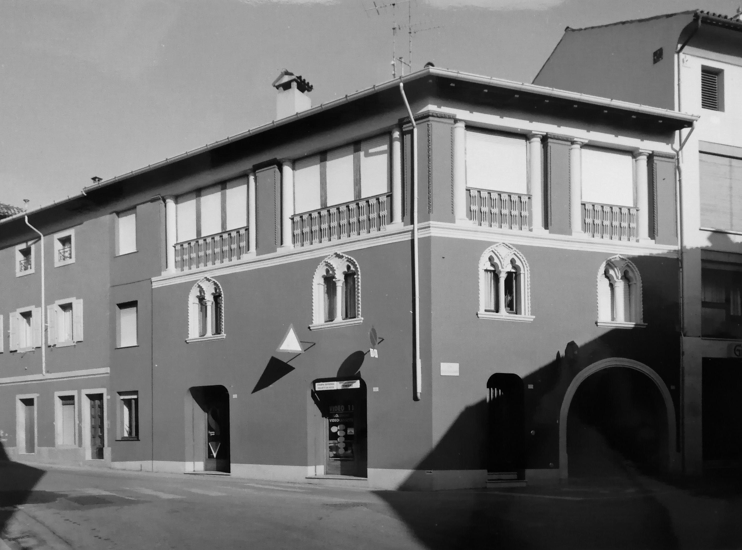 L'edificio è un esempio di architettura eclettica ispirato ad alcuni elementi originali primitivi ed è dato dall'accostamento di diversi elementi stilistici al fine di ottenere un certo effetto scenografico ed ambientale. Realizzato ad angolo tra le Vie Umberto I e San Giacomo, presenta una pianta ad “L” caratterizzata al piano terra da un portico con ampio arco ribassato, al primo piano da bifore trilobate e all'ultimo livello coppie di colonne a delimitazione delle aperture