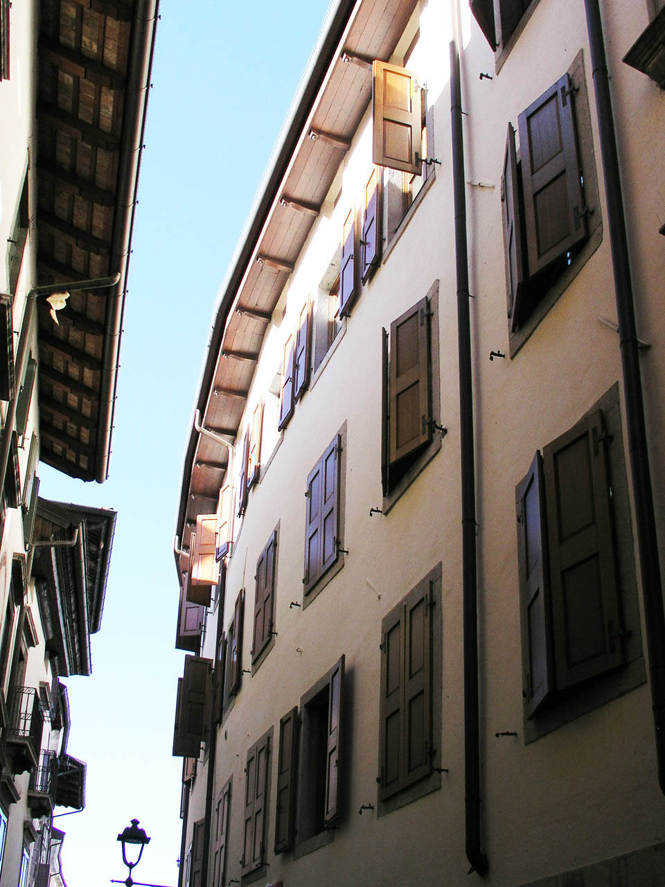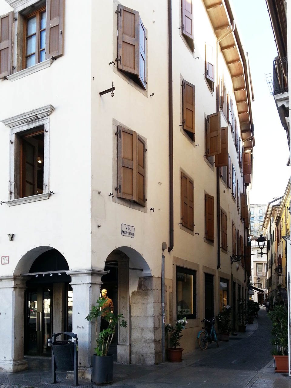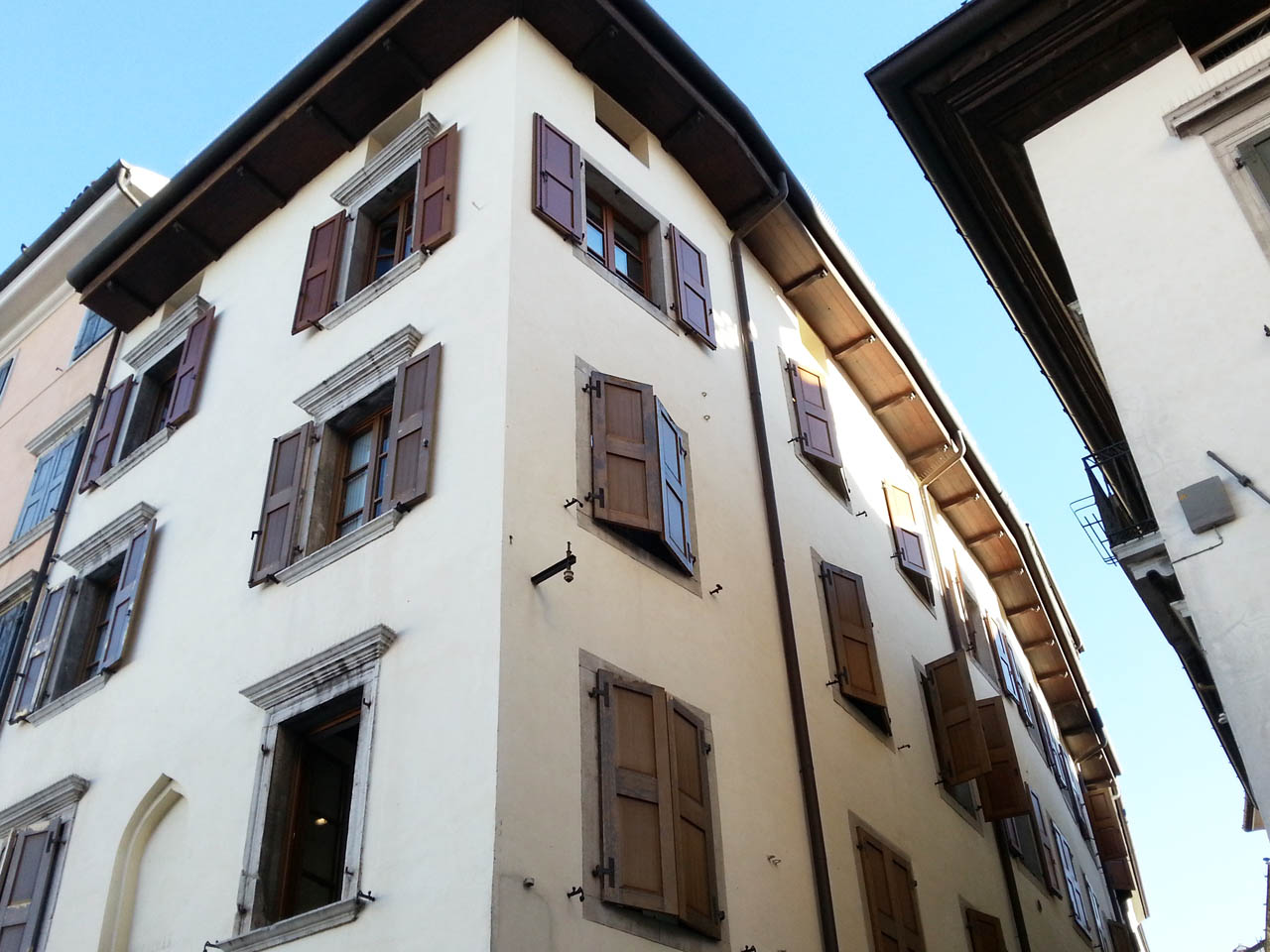 L'edificio, realizzato in muratura mista con facciate intonacate, occupa l'angolo tra Piazza Matteotti e via Mercerie. Il piano terra della facciata sulla piazza è dotato di portico che poggia su quattro pilastri a base quadrata, mentre in via Mercerie, privo di porticato, sono presenti le vetrine delle attività commerciali. A partire dal primo piano, il prospetto su Piazza Matteotti è impostato su due finestre affiancate per piano, per un totale di quattro piani, mentre in via Mercerie su otto finestre affiancate