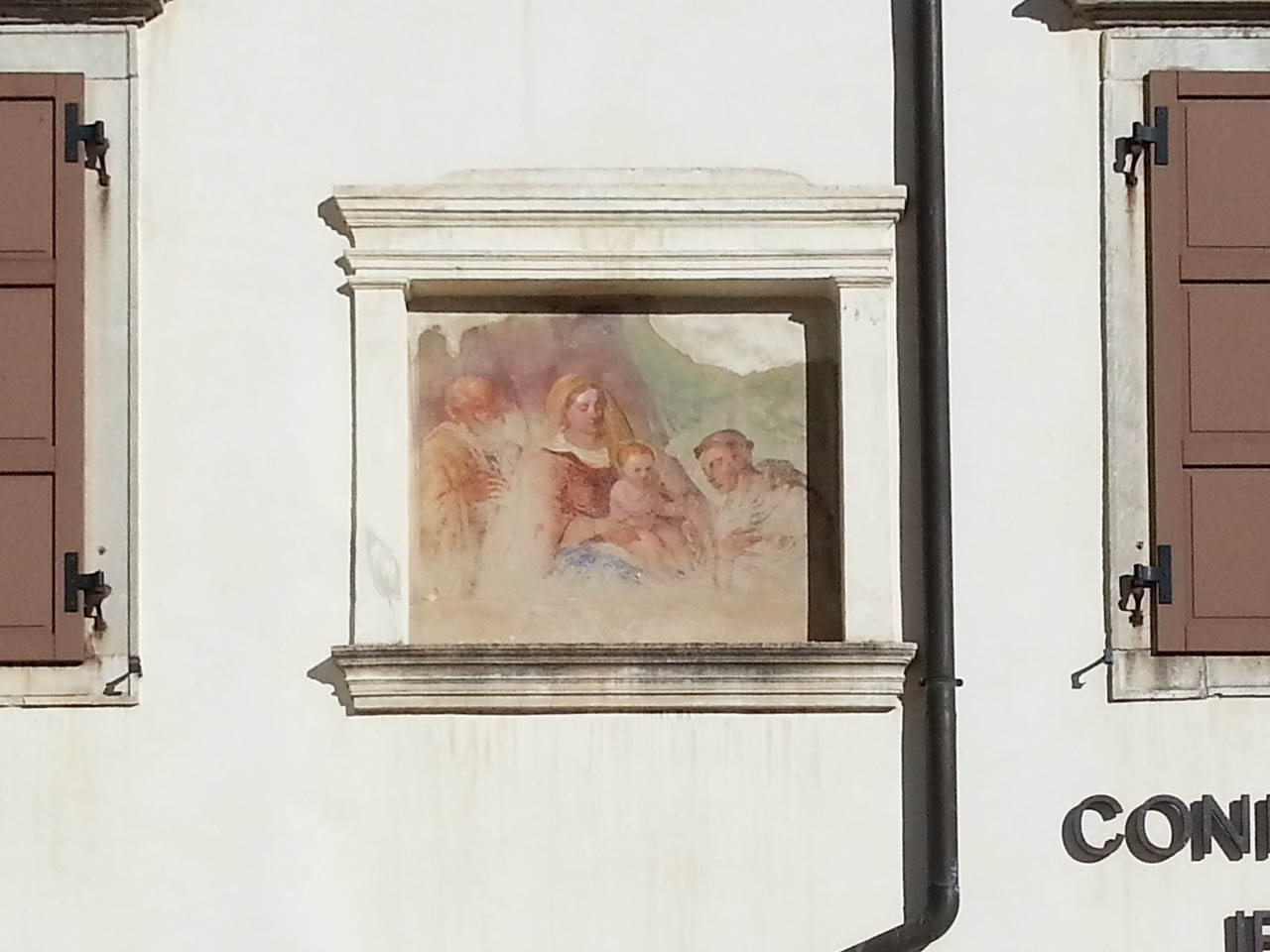 L'edificio, di forma irregolare in muratura mista con facciate intonacate, è posto a ridosso della Chiesa di S. Giacomo. Il piano terra del prospetto principale, affacciato sulla piazza, presenta un porticato sorretto da pilastri a base rettangolare. Al livello superiore una fila di quattro finestre scandisce gli ultimi tre piani. I prospetti posteriori sono molto articolati e si presentano in pessimo stato di conservazione. Il restauro della facciata ha messo in luce gli sguinci di alcune aperture (al centro della vecchia facciata si apriva in origine una trifora) e lacerti di affreschi che mostrano le caratteristiche della tipica decorazione delle strutture architettoniche della piazza, rivestite da vivaci colori. Si notano i resti di losanghe, motivi fitomorfi e un mascherone grottesco