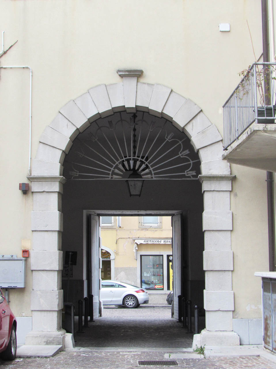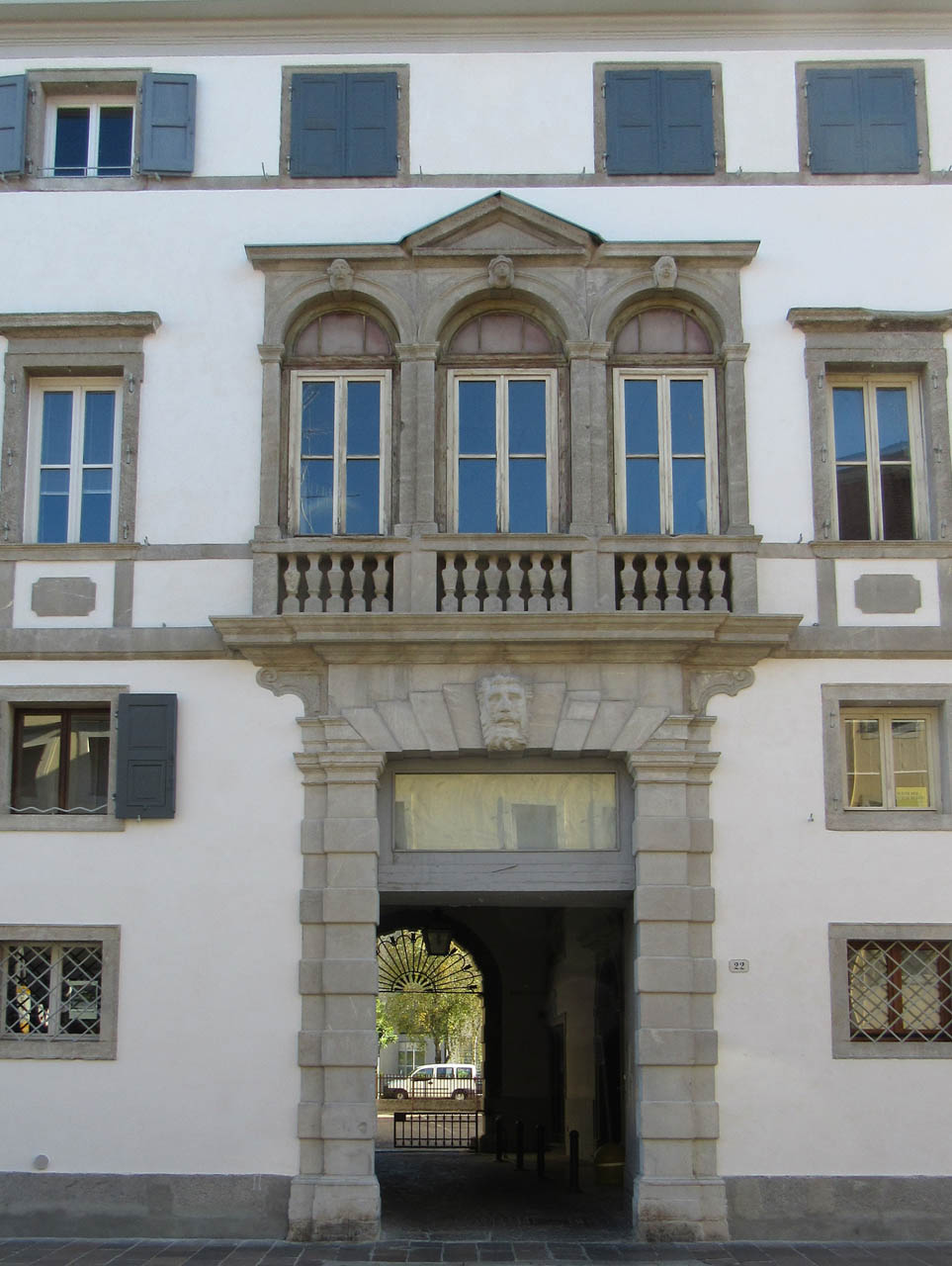 Il Ballerio lo descrive come un palazzo «con facciata di tipo veneto, ma col caratteristico elemento udinese del portale bugnato rettangolare. Si noti la presenza, piuttosto rara a Udine del piano ammezzato». Si erge su tre livelli oltre al piano terra. Elementi caratterizzanti la facciata sono l'ampio portone, con piedritti in conci di pietra lavorati e intercalati con rientranze e sporgenze, e l'architrave costituito da una piattabanda in conci ornata con un rilievo di testa d'uomo al centro. Il portone è sovrastato da un pergolo con artistica balaustra in pietra naturale, abbellito da una trifora con tre lunette semicircolari, completata da una cornice con modanature e timpano. La facciata è delimitata da due pilastri in conci di pietra che arrivano alla cornice tra primo e secondo piano. La linea di gronda è costituita da cornici modanate