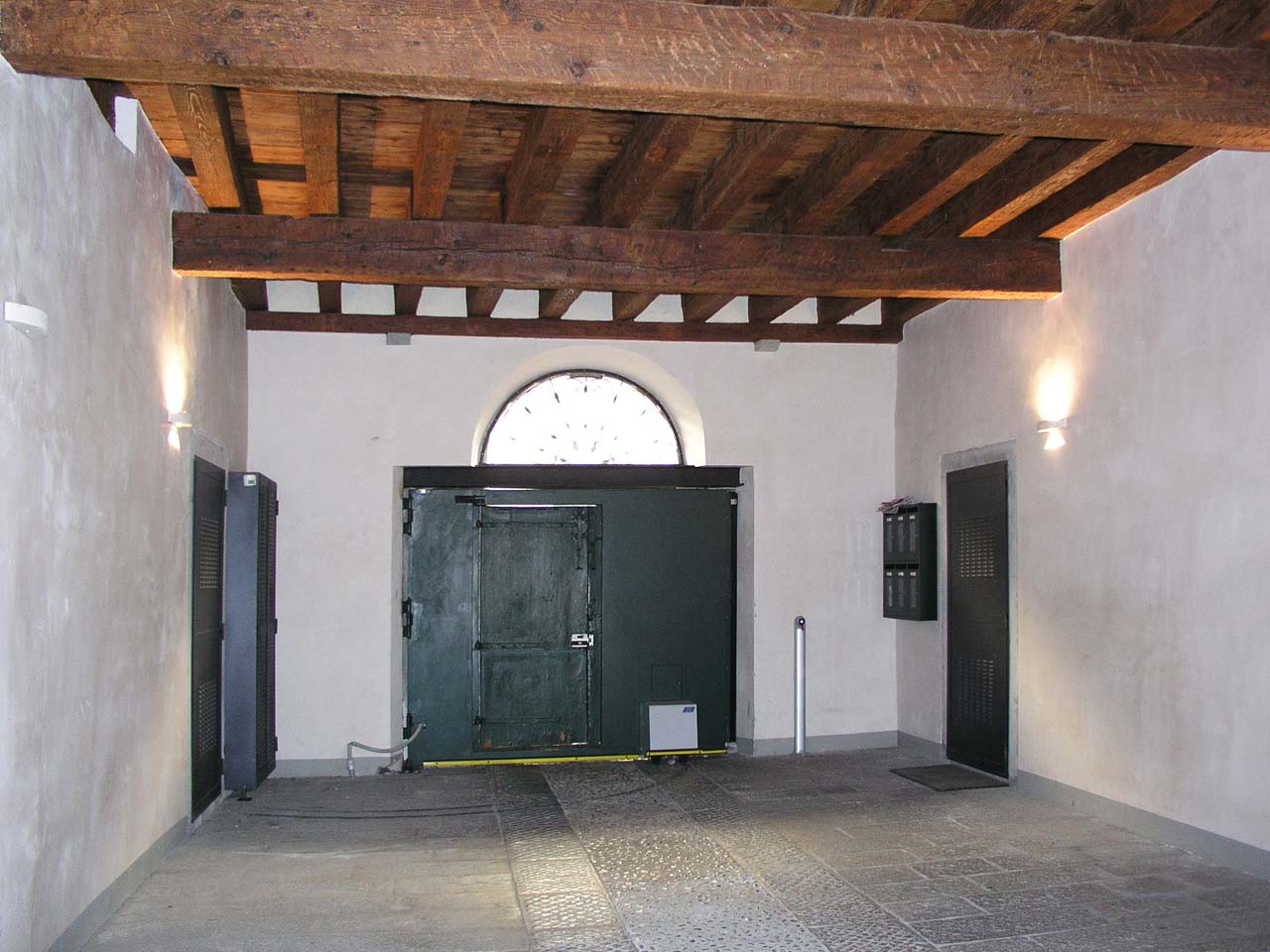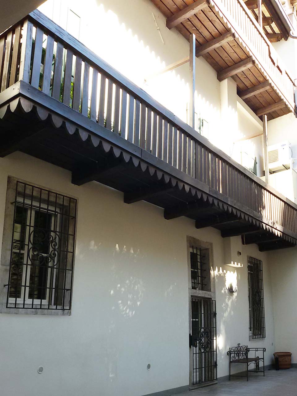 L'edificio, con corte interna, si affaccia su Via Portanuova. La facciata è caratterizzata dall'apparato centrale settecentesco in pietra comprendente il portale a volta fiancheggiato da lesene con capitello e la slanciata bifora con balaustra e lunetta di classiche proporzioni, dalle inferriate con motivo a trina che proteggono le cinque finestre quadrate del piano terra e dalle finestre con balaustrine del primo piano. Il prospetto sulla piccola corte è scandito ad ogni piano da ballatoi con struttura e balaustra in legno