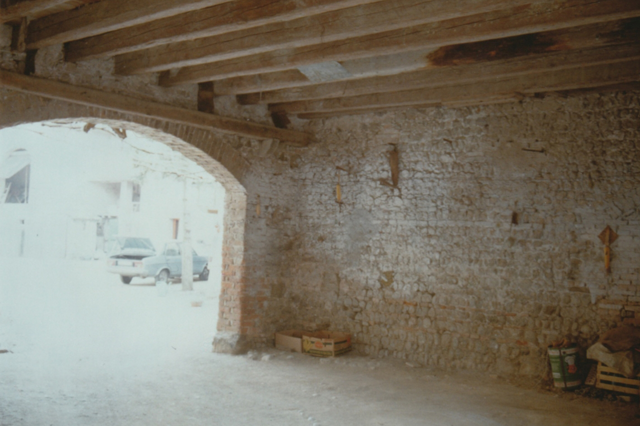 L'edificio è realizzato in muratura portante ed è caratterizzato da un androne passante al p.t. con due ampie aperture ad arco ribassato. Lateralmente un vano conduce alla scala in legno che collega il primo piano. I solai sono in legno a vista per il p.t. mentre al primo pino è chiuso da tavolato dipinto. Al primo piano è presente anche un caminetto con elementi in pietra