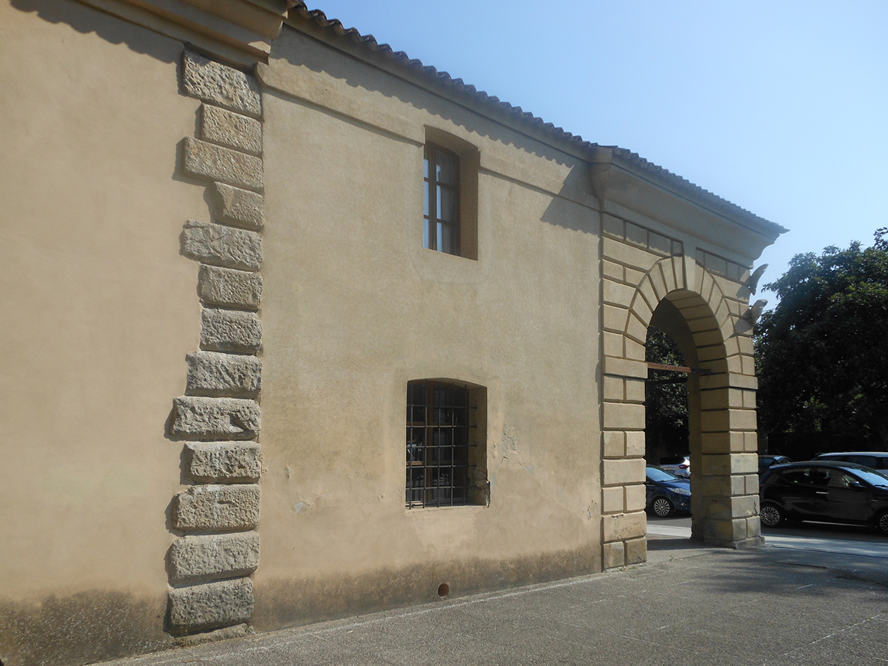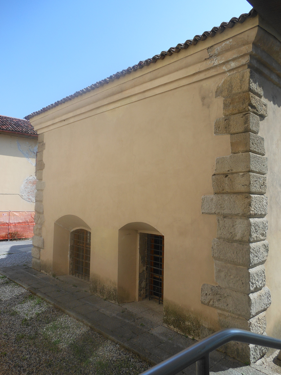 L'edificio è composto di due parti distinte quella posteriore più antica con due finestre ad arco e una porta in pietra. La parte antieriore invece presenta una ampia loggia con archi a tutto sesto a doppia altezza. La struttura è in murature intonacata con finitura a bugnato gentile. Un tetto a tre falde in legno con tavelle chiude la loggia. Il pavimento è realizzato in cotto posato a spinapesce