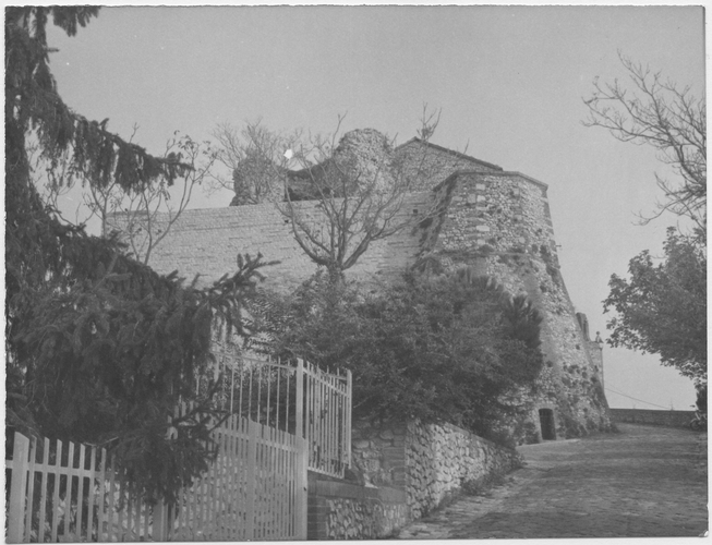 Sul versante occidentale dell'attuale accesso è situata una torre a baluardo chiamata Torrione della SS. Trinità. Fatto costruire da Sigismondo in pietra e mattoni, è una costruzione a pianta esagonale con muro a sghembo e una porticina in basso che è l'uscita di una scala elicoidale. Proseguendo sulla via di accesso si entra nel recinto del rudere di un'antica porta "ai tempi di Sigismondo Malatesta difeso da un fossato, oggi riempito". Il primo cortile è formato dal muro di cinta e dal palazzo baronale. A destra il muro di cinta è interrotto da un torrione denominato nei documenti "La guardiola". Salendo una breve cordonata si entra nella sala delle guardie con soffitto originale a travi di legno del XVII Sec. Nella parete sinistra è posta una lapide molto corrosa di Sigismondo Malatesta, datata 1449 e un'altra datata 1597 che documenta un restauro fatto eseguire da parte dei Barberini. Dalla sala delle guardie si accede alla sala delle armi con soffitto a travi originariamente decorato (tracce). Si passa allo studio con soffitto decorato (affresco) e poi salendo alcuni gradini si giunge all'archivio dotato di arredamento dell'epoca. Da qui si passa al salone, oggi museo di reperti archeologici, in passato teatro del castello (costruito nel 1700 e demolito vari anni fa perché inagibile). Del salone si esce all'aperto nel cortile della cisterna con ampio serbatoio sotterraneo a volte in mattoni. All'angolo sul lato riminese si notano le tracce della Torre S. Andrea. Rientrando nella sala delle guardie, subito a sinistra si trova la scala che porta all'appartamento superiore composta da sala da pranzo, stanza da letto e cappellina, tutti con arredi d'epoca e con soffitti a volta. Dalla sala da pranzo si sale alla seconda stanza della torre (unico ambiente originale -mattoni quadrati montati in diagonale)