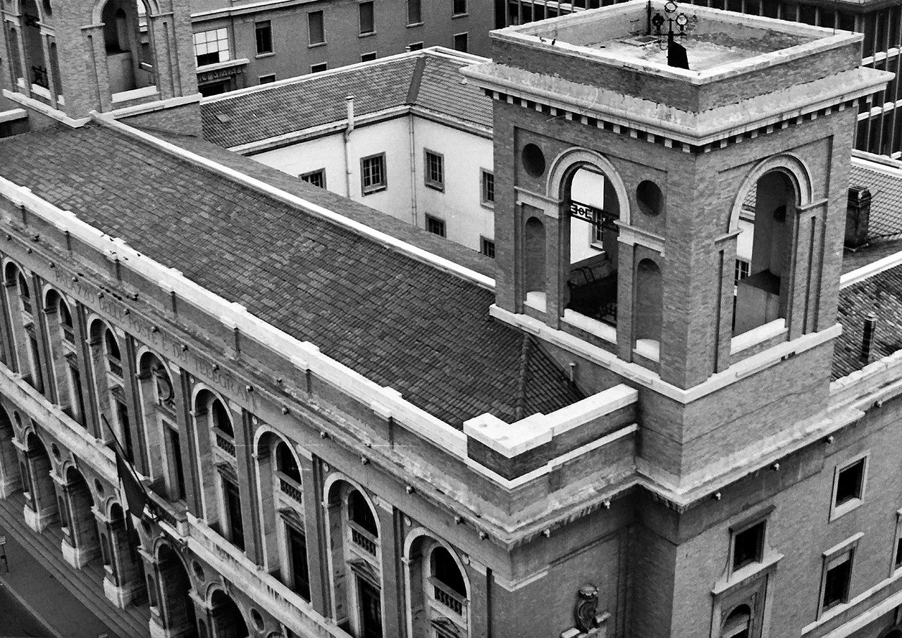 Edificio a sviluppo trasversale con torrette laterali svettanti, copertura piana