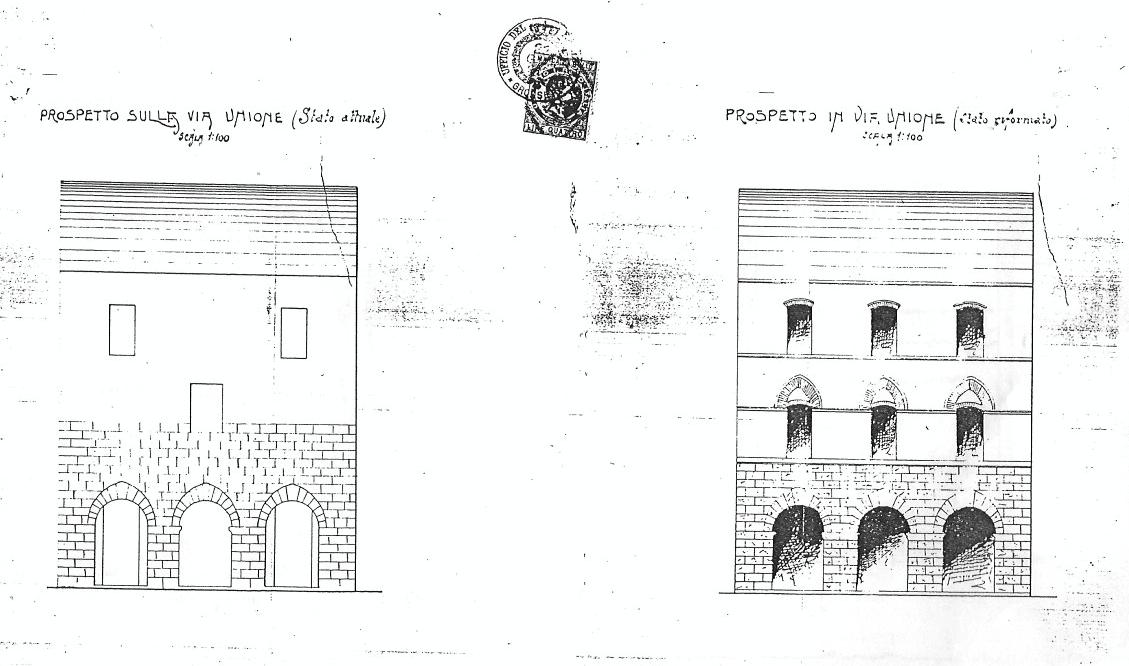 Palazzina a tre piani fuori terra in muratura mista di laterizio ed pietra da taglio con copertura a falde e manto in laterizio a coppi e tegole