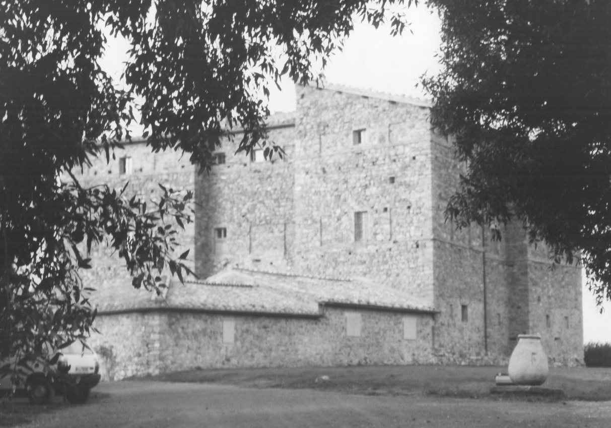 Edifico quadrangolare con torrioni ai quattro angoli; strutture verticali in pietra e laterizio; coperture a tetto a falde con manto in laterizio