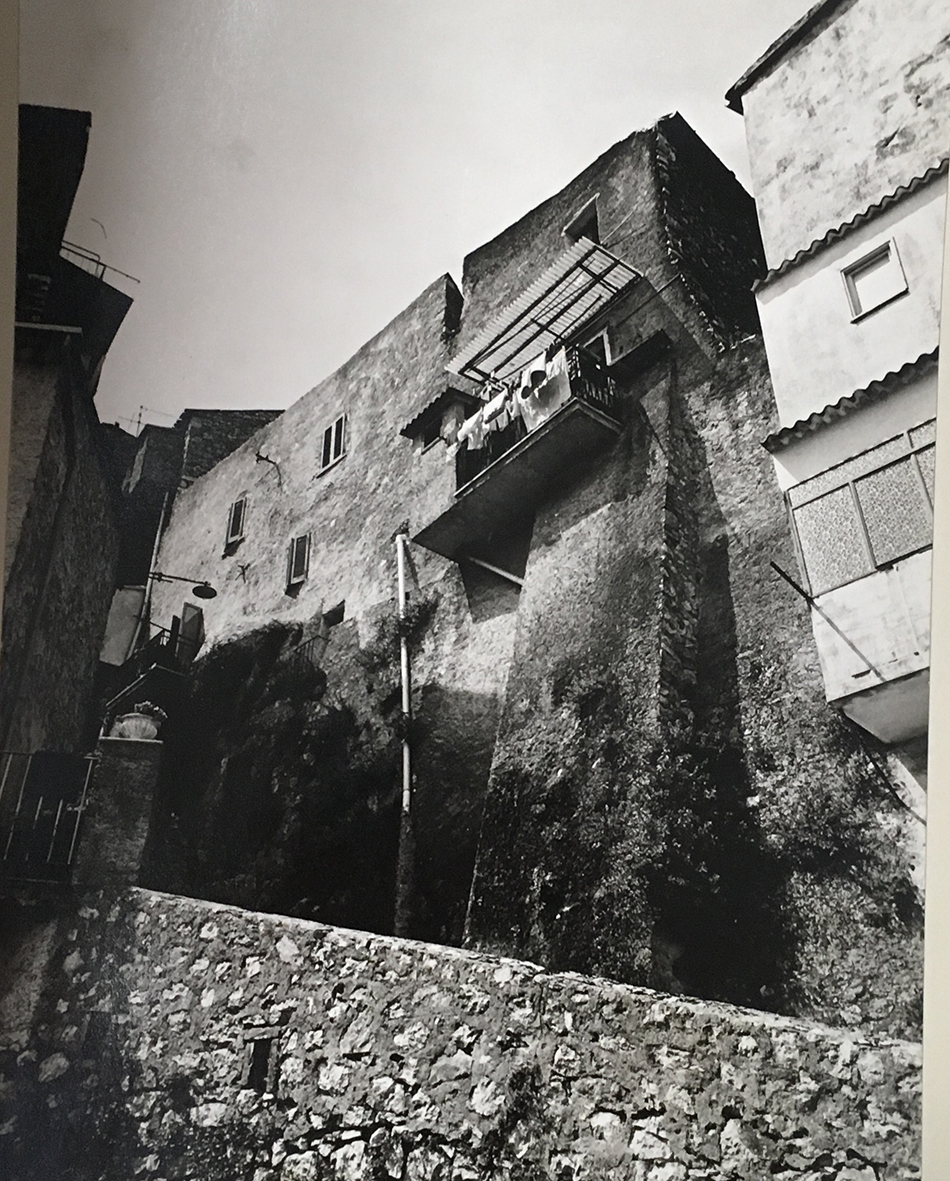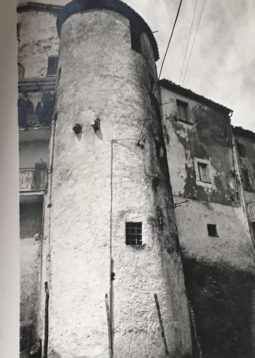 L’edificio pone le sue fondamenta sul perimetro della cinta urbana in prossimità della porta S. Giovanni. L’edifico è composto di più unità abitative impostate sulla cerchia fortificata ed ingloba nell’angolo NE una torre cilindrica. La struttura muraria è in pietrame calcareo con parziale finitura ad intonaco. Il tetto è a due falde e una falda con struttura di legno e manto in tegole. Sul prospetto sul lato est si può dividere in due porzioni. La prima parte per lo più rifinita ad intonaco grezzo si delinea su di una ripida gradinata e si sviluppa su tre livelli, su alcuni portoncini di ingresso. Al 1p c’è un piccolo balcone al 2p due balconi inframezzato da un finestra ed al livello superiore tre finestre rettangolari, questa porzione di facciata termina con un contrafforte in pietra muraria. L’altra parte del prospetto notevolmente rimaneggiata di recente si sviluppa lungo una rampa gradonata e mostra al di sopra un basamento ad intonaco grezzo. Il fonte nord, anch’esso diviso in due parti, di cui la prima poco più alta dell’altra, ha un alto basamento ad intonaco grezzo su cui si apre una piccola apertura rettangolare