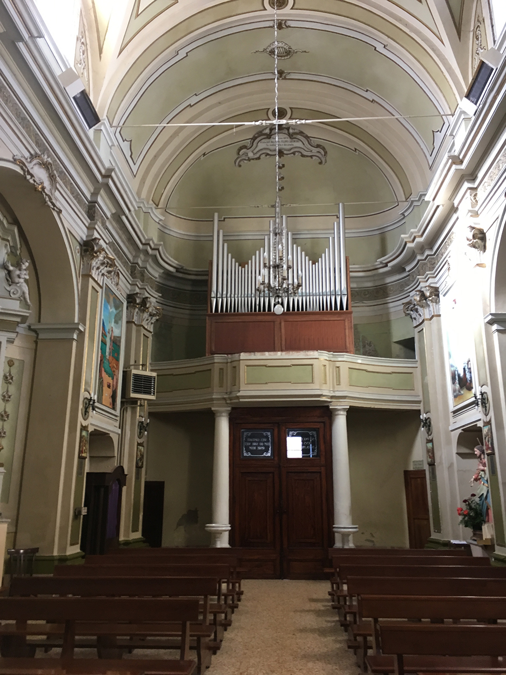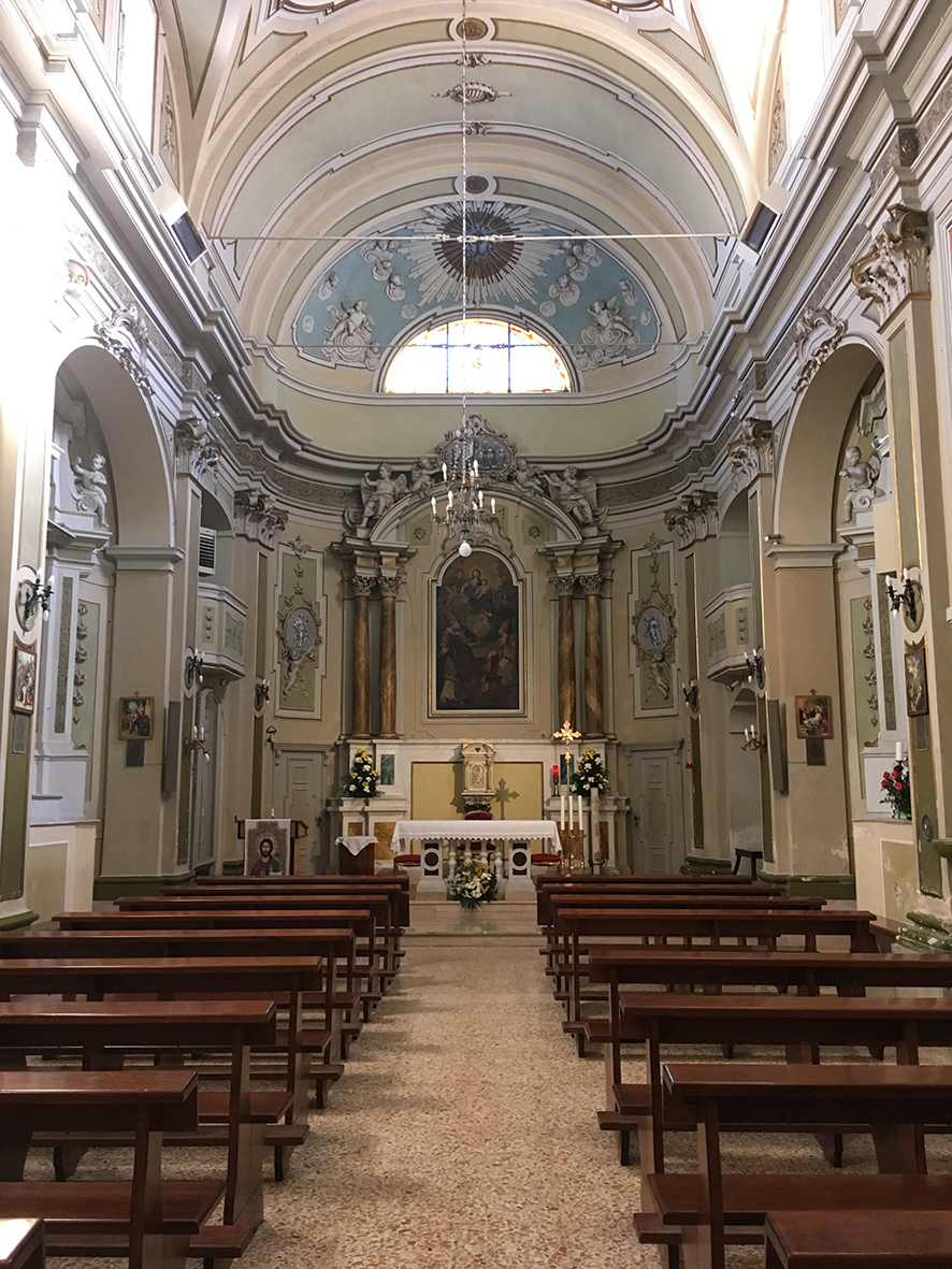 La chiesa presenta pianta rettangolare con campanile annesso sul lato sinistro e sagrestia sul lato dx. La sede della chiesa misura 20x10m. L'impianto, molto semplice, è stato grandemente arricchito da stucchi e fregi in periodo barocco. un semplice foro circolare si apre al di sopra della porta principale e sulla parete di fondo. Ai lati si aprono tre finestre allungate, di forma rettangolare, con arco a tutto stesso strombato. L'ingresso principale rialzato di tre gradini rispetto al livello stradale, si evidenzia per il ricco portale in pietra scolpita con due leoni ai fianchi, cpolonne scanalate e terminate con capitelli corinzi. La parte superiore è terminante da un piccolo cornicione recante una scritta in latino. La porta laterale a fianco del campanile è meno ricca ma più antica e reca anch'essa una scritta in latino. La costruzione è interamente in pietra grezza, compreso il campanile eccetto la facciata e una parte della sagrestia che sono stati intonacati. E' stata aggiunta succes. nel XVIII sec. la casa canonica sempre in pietra intonacata