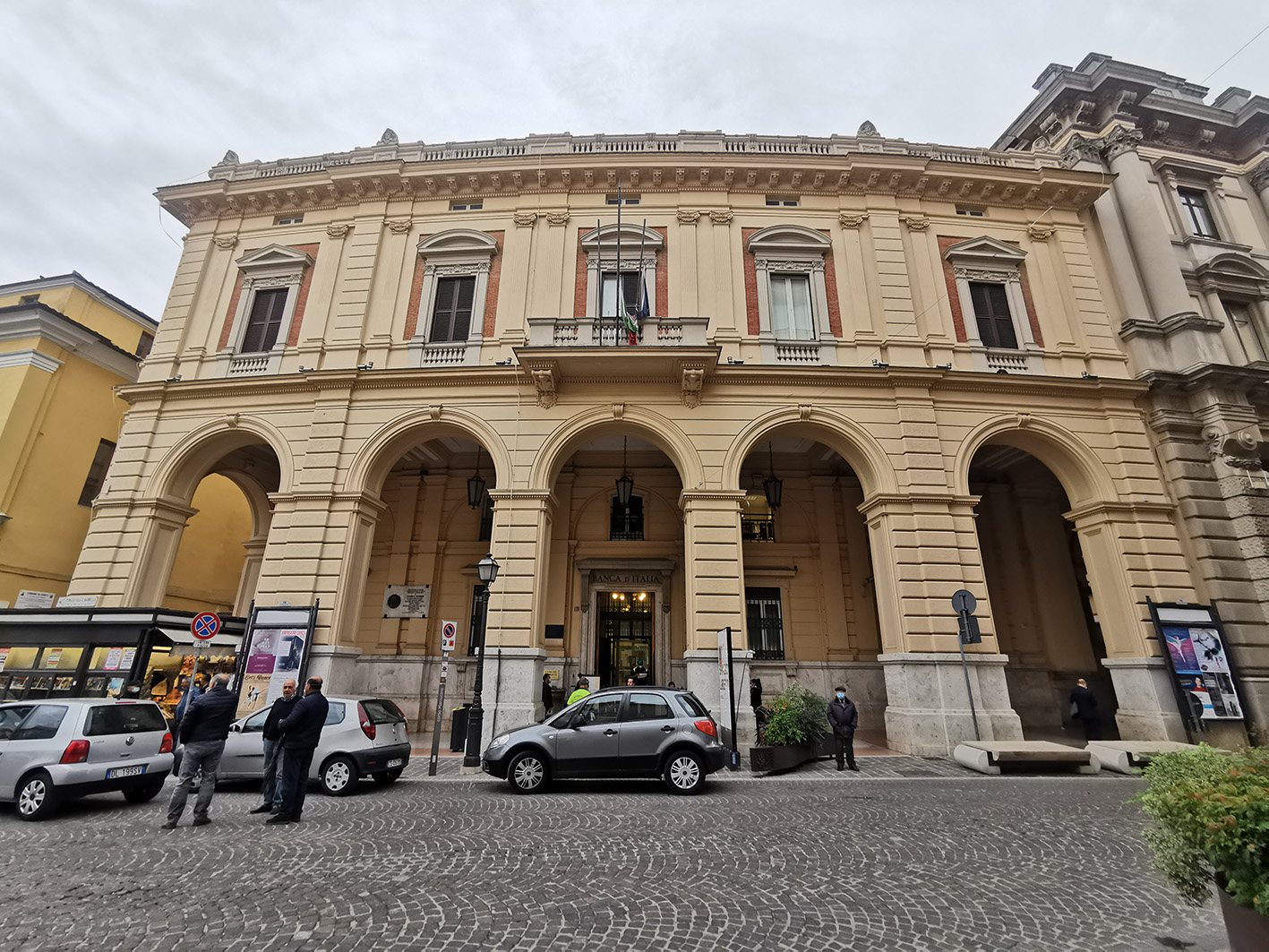 L’edificio presenta pianta trapezoidale con porticato antistante. Il palazzo si articola in cinque livelli: piano seminterrato, rialzato, ammezzato, primo e secondo piano con ampio terrazzo. Al piano seminterrato erano collocati gli uffici della banca e i locali di sicurezza, al piano rialzato gli uffici, al piano ammezzato il locale per il dopolavoro aziendale ed ai due piani superiori tre alloggi di cui l’appartamento del vicedirettore all’ultimo livello. Oggi, il piano rialzato è occupato da uffici comunali. Il piano seminterrato è collegato al piano rialzato tramite una scala ad L collocata in posizione trasversale al prospetto principale. Attualmente l’immobile, dopo la ristrutturazione, presenta un ingresso principale, il frontale, riccamente lavorato in pietra con trabeazione modanata su mensole, primo e storico ingresso della Banca che oltre a dare l’accesso agli uffici ed al pubblico, immette in una scalinata indipendente, a pozzo a pianta quadrata, a servizio degli alloggi e dei terrazzi. Un secondo ingresso agli uffici, realizzato successivamente per il superamento delle barriere architettoniche ai sensi della Legge 13/89 è utilizzato come via di fuga in caso di pericolo. Posteriormente sono presenti due ingressi motorizzati, uno per lo scarico valori, l’altro per la movimentazione dei valori. Il porticato è caratterizzato da un pavimento alla veneziana finemente decorato; mentre, internamente sono presenti ricche pavimentazioni in marmo. Tutti gli ambienti uffici sono controsoffittati per permettere il passaggio degli impianti a servizio della struttura. La sala al pubblico, è l’ambiente di maggiore prestigio; finemente decorata con marmi policromi, è scandita da lesene con capitelli compositi e trabeazione modanata ed è coperta da una volta a vela aperta da un lucernaio cassettonato. L’immobile ha una struttura portante in muratura con elementi in c.a. e profilati in acciaio e strutture a volte al piano seminterrato. La copertura corrispondente all’appartamento del Vice Direttore è a falde inclinate con manto di copertura in coppi; la restante parte piana accessibile, presenta un doppio solaio di isolamento e finiture in monocottura. L'immobile presenta quattro facciate libere con un solo collegamento con l'attiguo Palazzo del Governo. Il fronte d'ingresso, quello più rappresentativo, si affaccia su Corso Marrucino e mostra tutta la ricchezza e l'eleganza dei decori tipici dell'architettura neoclassica, nella costante ricerca dell'armonia e dell'equilibrio delle proporzioni. Tale facciata è composta da un alto portico, con cinque arcate a tutto sesto finemente decorate e fasciate in bugnato, inquadrate da paraste sempre in bugnato poggianti su basi in travertino, che scandiscono anche il livello superiore della facciata, separato da una cornice marcapiano modanata. Un ordine di lesene minore scanalate con capitelli corinzi, inquadra cinque finestre architravate a timpano alternato triangolare-curvilineo, ornate nelle cornici da motivi vegetali e capitelli corinzi e delle quali quella centrale presenta un grande balcone centrale. Una cornice modanata con decorazioni ad ovoli e dentelli su mensole decorate ed un'ampia balaustra prefabbricata in conglomerato cementizio con decorazioni, fungono da coronamento per tutti i prospetti. Il paramento murario è intonacato e tinteggiato, gli infissi esterni tutti in legno. Le aperture al piano seminterrato e quelle del piano terra con cornici modanate, sono dotate di grate di protezione metalliche finemente lavorate a mano. I prospetti su via dei Gesuiti, via Questura e piazza Umberto I sono caratterizzati dai medesimi elementi del prospetto principale (paraste in bugnato, cornice marcapiano, cornicione modanato con balaustra) e con alcune variazioni da aperture rettangolari regolari aperte nel basamento in travertino al piano rialzato; da aperture arcuate singole o due o tre affiancate definite da lesene con base modanata, capitelli, concio in chiave e soglia modanata al piano seminterrato; da aperture rettangolari definite da lesene con capitelli al piano ammezzato; da aperture inquadrate da lesene con capitelli e trabeazione modanata su mensole oppure da arcate singole o due o tre affiancate con lesene o colonnine, capitelli corinzi, concio in chiave e balaustra con colonnine al piano superiore