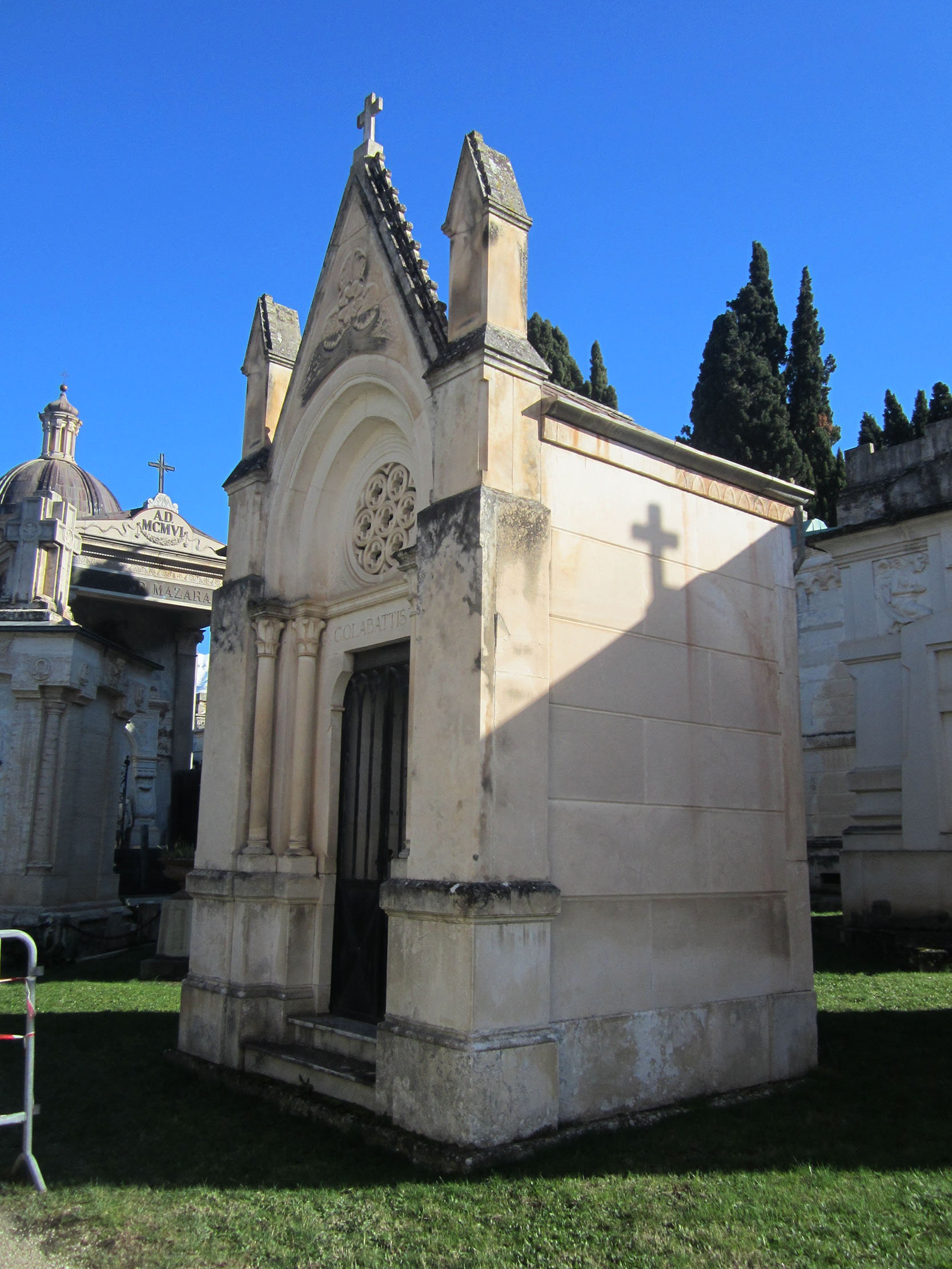 Cappella cimiteriale ad unico livello con loculi interni. La pianta è formata da un volume a pianta rettangolare con tetto a due falde e manto di copertura in coppi e da un’appendice semicircolare collocata in asse sul retro, corrispondente internamente alla zona dell’altare. Il prospetto principale presenta un alto basamento modanato, interrotto da due gradini di accesso sul fronte principale e paraste angolari con pinnacoli. Il portale di ingresso presenta una doppia cornice con colonnine con base modanata su piedistalli e capitelli con fogliame, spigoli interni smussati, architrave con intestazione cappella incisa e archivolto con arco rialzato. In asse con il portale è collocato il rosone con cornice modanata e decorazioni polilobate. Il coronamento è definito da una cuspide con decorazioni circolari, un quadrifoglio con fogliame e una croce sommitale. Cancello a motivi geometrici. Gli altri prospetti presentano un rivestimento a corsi orizzontali ed una cornice con decorazione ad archetti acuti