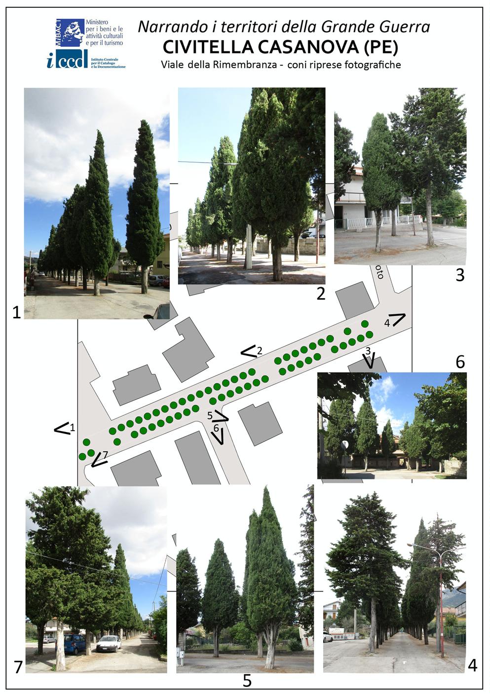Il viale, nel suo tratto originale della lunghezza di circa 150 m, risulta posto in leggero pendio con orientamento Sud-Ovest / Nord-Est e rappresenta la prosecuzione dell'asse viario di Via G. Marconi, parallelo alla Provinciale n. 50, avente inizio dall'incrocio con Via Milite Ignoto e terminante con l'incrocio di Via E. Felsani. L'attuale toponomastica comunale identifica con Viale Rimembranza anche un tratto stradale curvilineo che circoscrive alcune abitazioni affacciate sul viale alberato originario. Quest'ultimo si compone di due filari paralleli di cipressi che scandiscono il viale in tre corsie di uguale ampiezza, pavimentate con asfalto, e tutte percorribili da automobili. Sono presenti attualmente n. 55 cipressi, da ritenersi tutti di impianto originario tranne uno, probabilmente frutto di una ripiantumazione. Lungo i filari sono presenti alcune lacune che indicano l'originaria collocazione di alberi non più esistenti. Da quanto riportato nella lapide commemorativa visibile sulla facciata del Municipio di Civitella (cfr. scheda OA 13 00283009), apposta nel 1920, i caduti della Grande Guerra furono 65; tale dato conferma quindi la perdita di 8 cipressi (v. planimetria). Non si evidenziano tracce di recinzioni. L’integrità del viale come luogo di commemorazione è inficiata da elementi incongruenti, quali pali dell’illuminazione pubblica e delle linee elettriche, nonché dalla stesura indiscriminata di asfalto e dal transito e parcheggio di autovetture