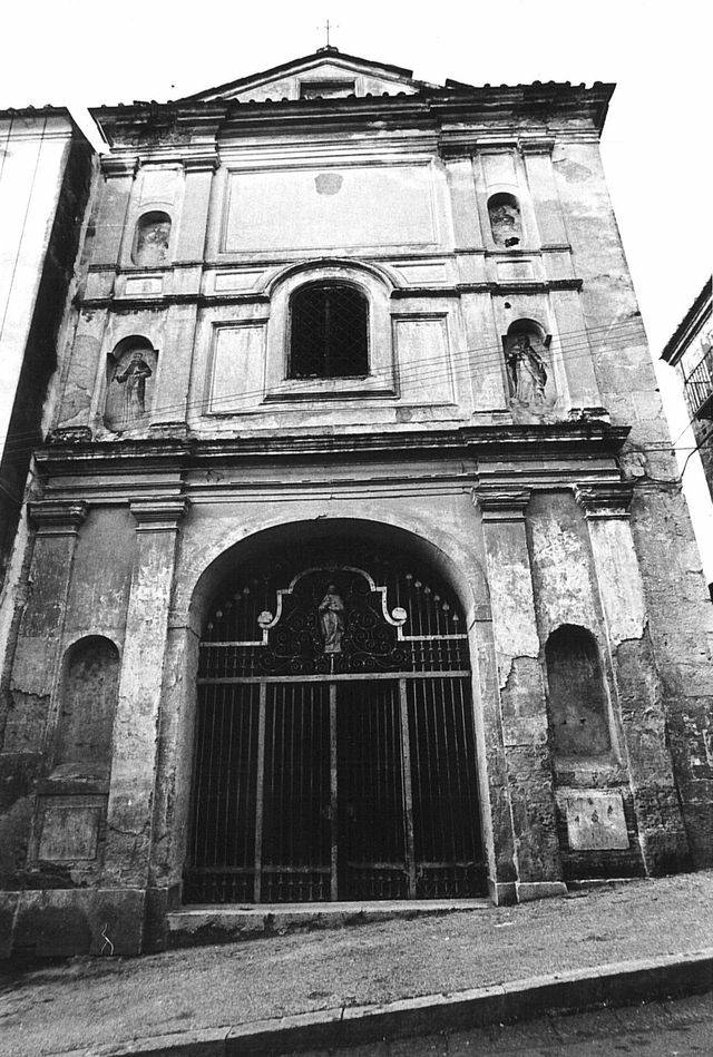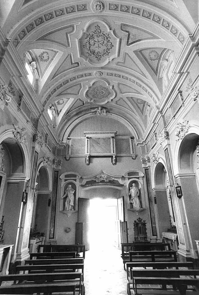 La chiesa, ad aula, ha una pianta rettangolare, preceduta da un pronao sovrastato da un matroneo schermato dal grigliato delle gelosie. La sala è articolata in quattro campate e presbiterio a pianta quadrangolare. La copertura è a botte lunettata realizzata in incannucciate sospese a strutture a capriata. La muratura è in pietra disposta in filari intonacata, la copertura è a doppio spiovente