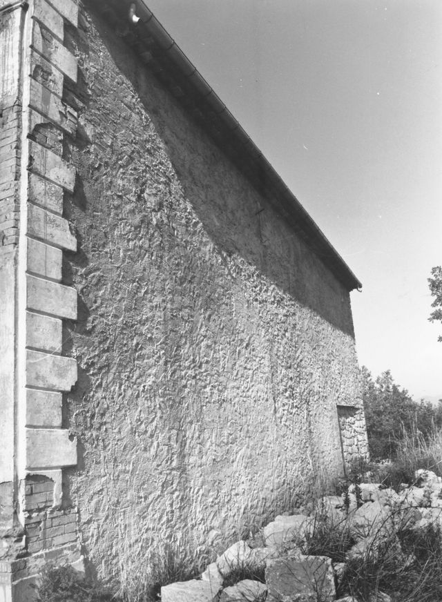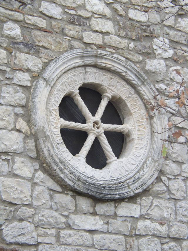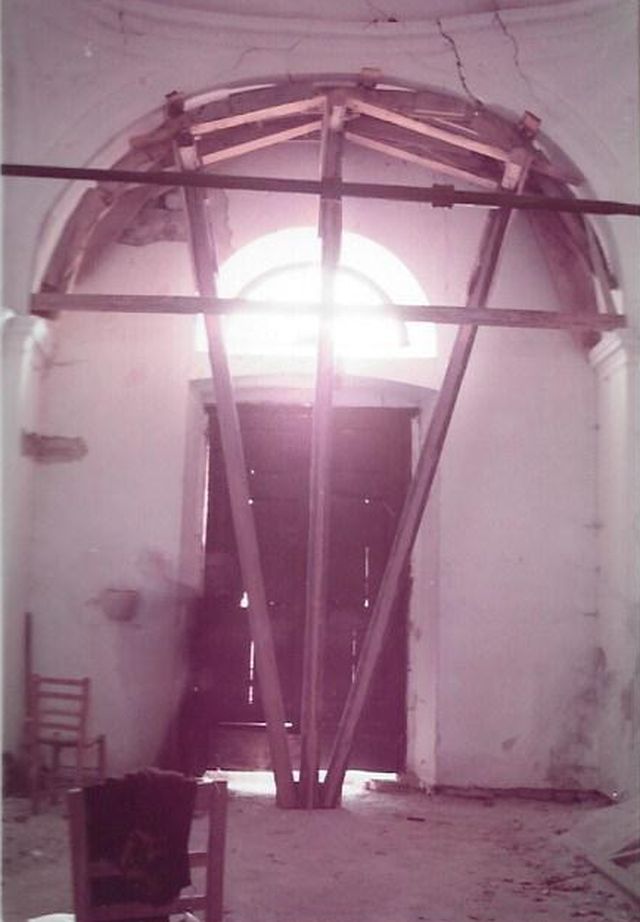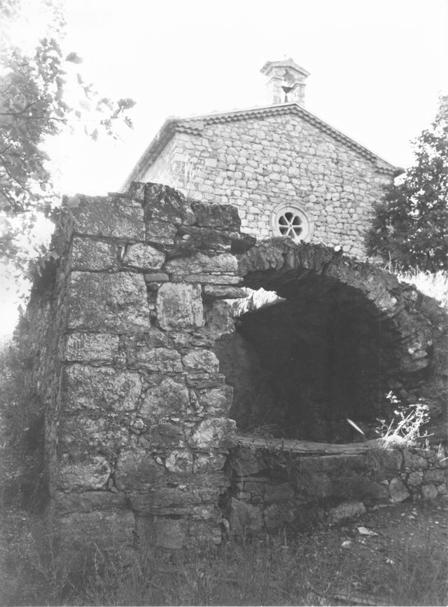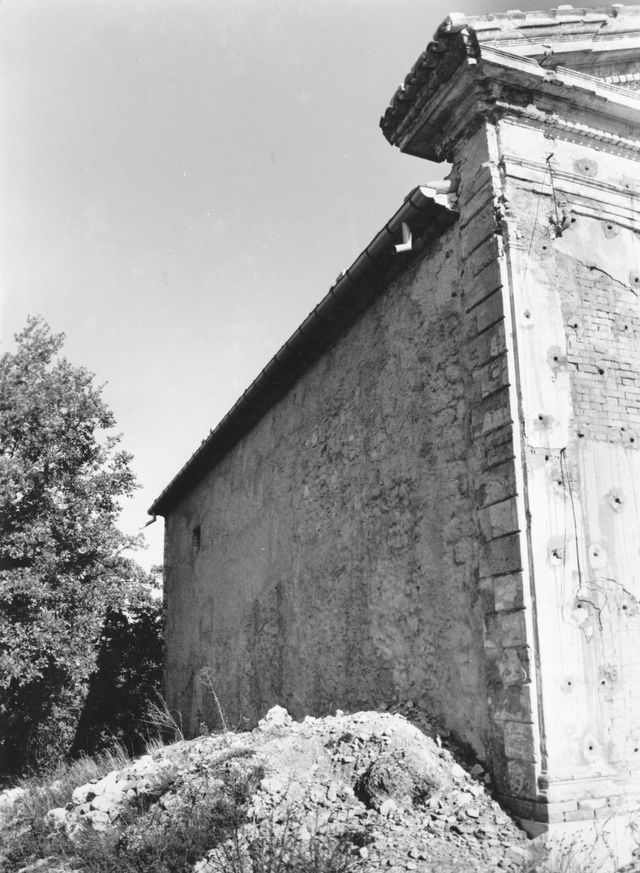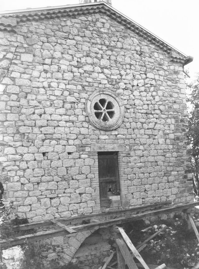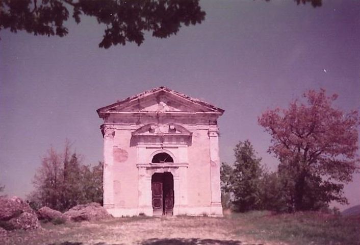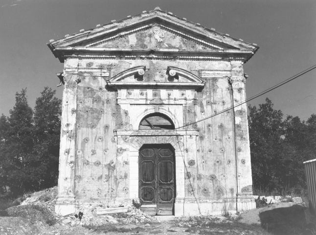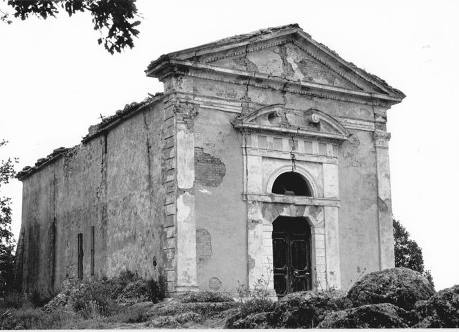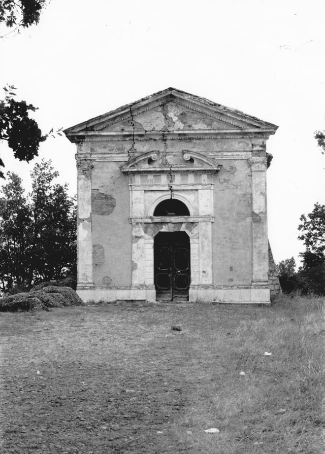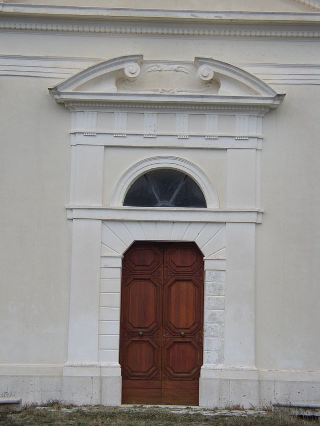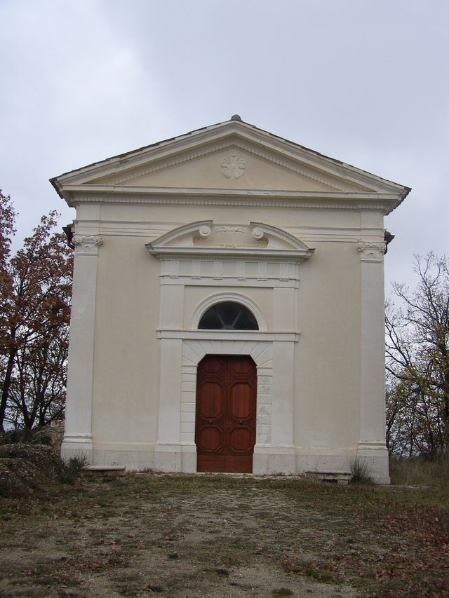 La chiesa in posizione isolata è posta su un pianoro fuori del centro abitato, è a pianta longitudinale ad un'unica navata dove si aprono sei cappelle laterali, tre per ogni lato, la copertura è a capanna. La facciata è delimitata da lesene con capitelli compositi e termina con trabeazione sormontata da timpano. Il portale con apertura sormontata da una lunetta, triglifi, timpano ad ali curve spezzate occupa la facciata fino alla trabeazione. La parte posteriore, in pietra, ha apertura rettangolare e rosone a sei raggi costituito da colonnine decorate