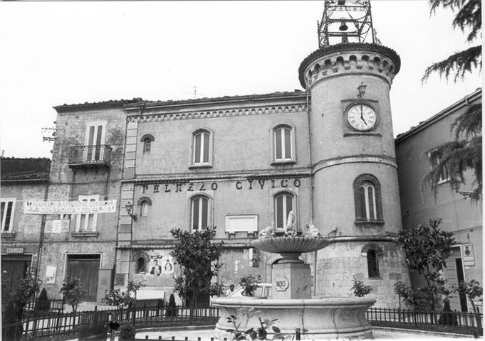 La pianta è di forma trapezoidale e presenta nell'unico spigolo libero un imponente torrione circolare destinato ad accogliere l'orologio pubblico ed in copertura, sorrette da un telaio in ferro battuto liberty, due campane. Il volume della fabbrica è composto da tre ordini. la facciata è intonacata e la copertura è a falde con manto in coppi. Nell'immobile tre unità abitative, una bottega e locali adibiti ad uffici pubblici