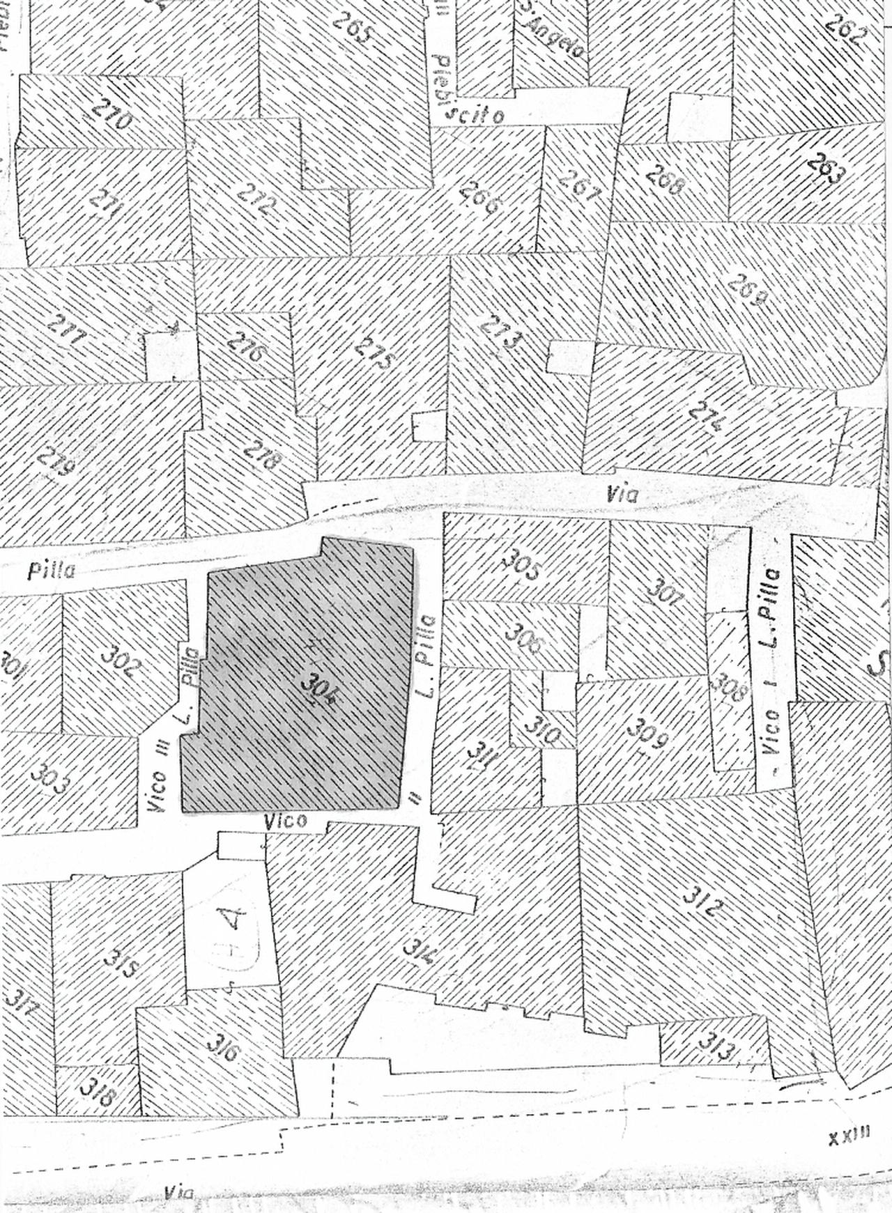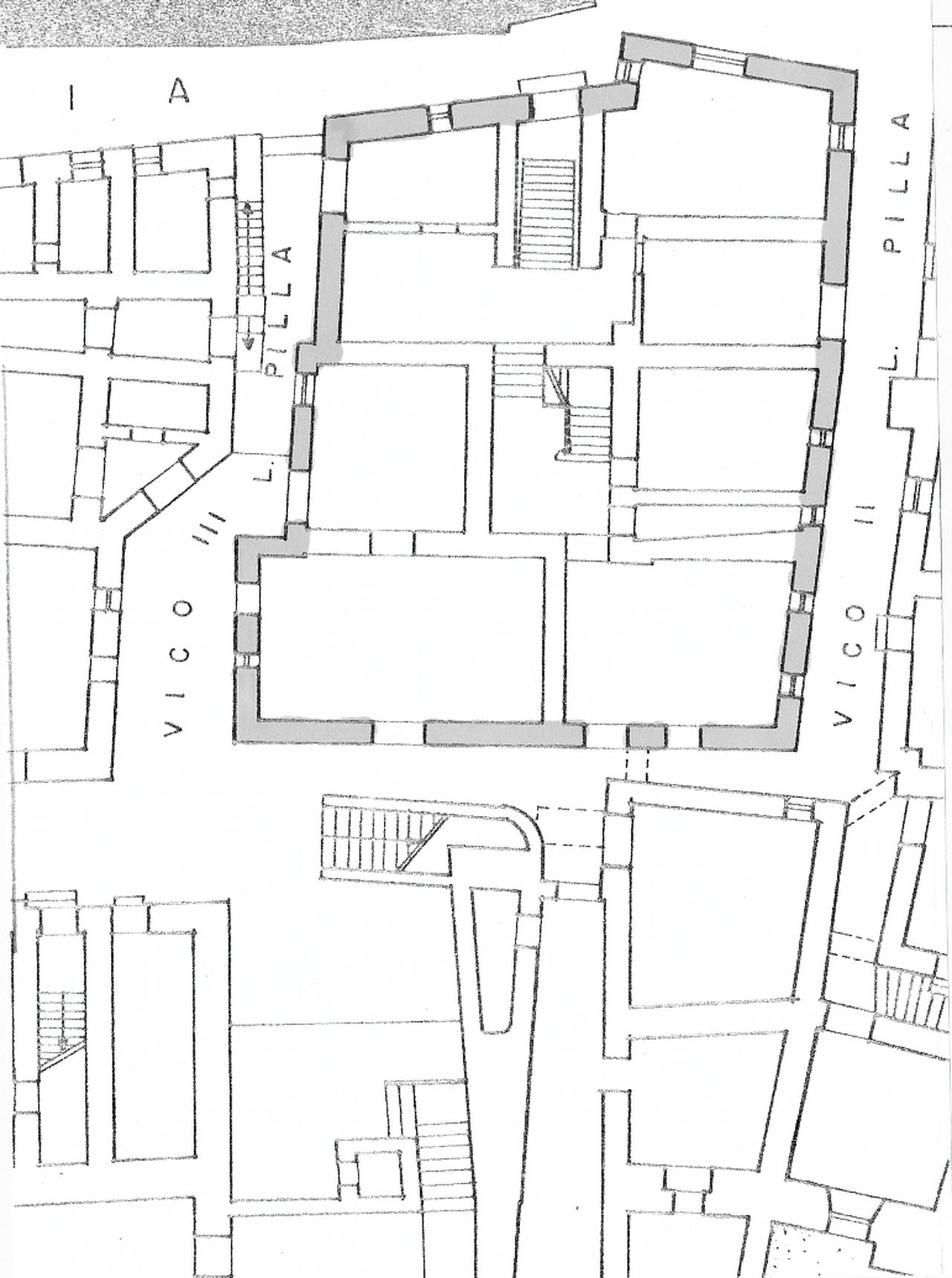 L'edificio si sviluppa su tre livelli nella parte che insiste su via L. Pilla e su quattro su Vico L. Pilla. La pianta ha impianto a blocco chiuso ed è di forma trapezia. La muratura, intonacata, è in pietra calcarea. La copertura è a più falde raccordate a padiglione con manto in coppi alla romana e tegole marsigliesi. All'interno tre abitazioni, due magazzini e due rimesse