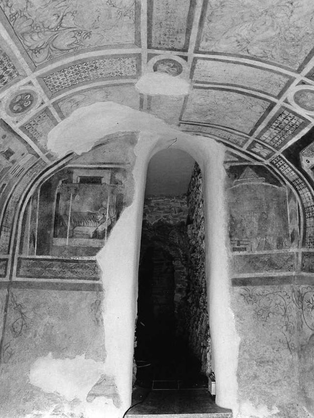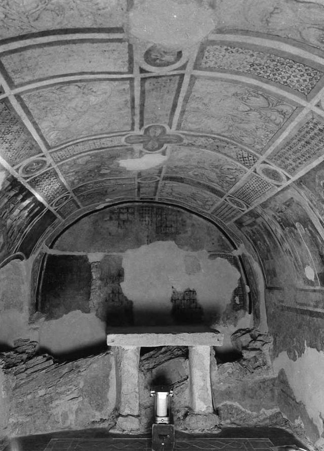 Piccolo ambiente rettangolare coperto da volta a botte, raggiungibile dalla chiesa sovrastante, mediante una scala, ad una quota di mt. -3.50 dal piano di calpestio esterno. Nonostante sia alquanto angusto, presenta una decorazione pittorica ad affresco che si estende sull'intera superficie di pareti e volta anche se la vera e propria rappresentazione figurativa corre sulla fascia di raccordo tra volta e pareti. L'ambiente voltato affrescato è solo una parte degli ambienti sotterranei della chiesa che però non presentano decorazioni o elementi di particolare interesse
