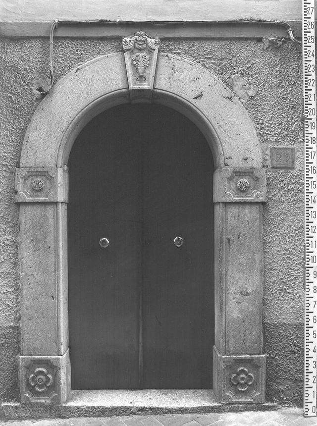 Edificio a pianta quadrata, di tre piani, con muratura in pietra intonacata; portale con arco a tutto sesto in pietra calcarea; mensole e soglie dei balconi in pietra lavorata; orizzontamenti in ferro; cornicione sporgente; copertura a falde con manto in coppi