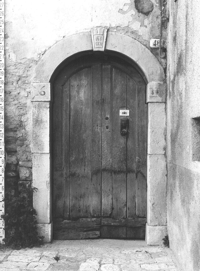 Edificio a pianta rettangolare, di tre piani, con muratura in pietra intonacata; portale con arco a tutto sesto e stipiti in pietra calcarea; orizzontamenti in legno, copertura a due falde con manto in coppi