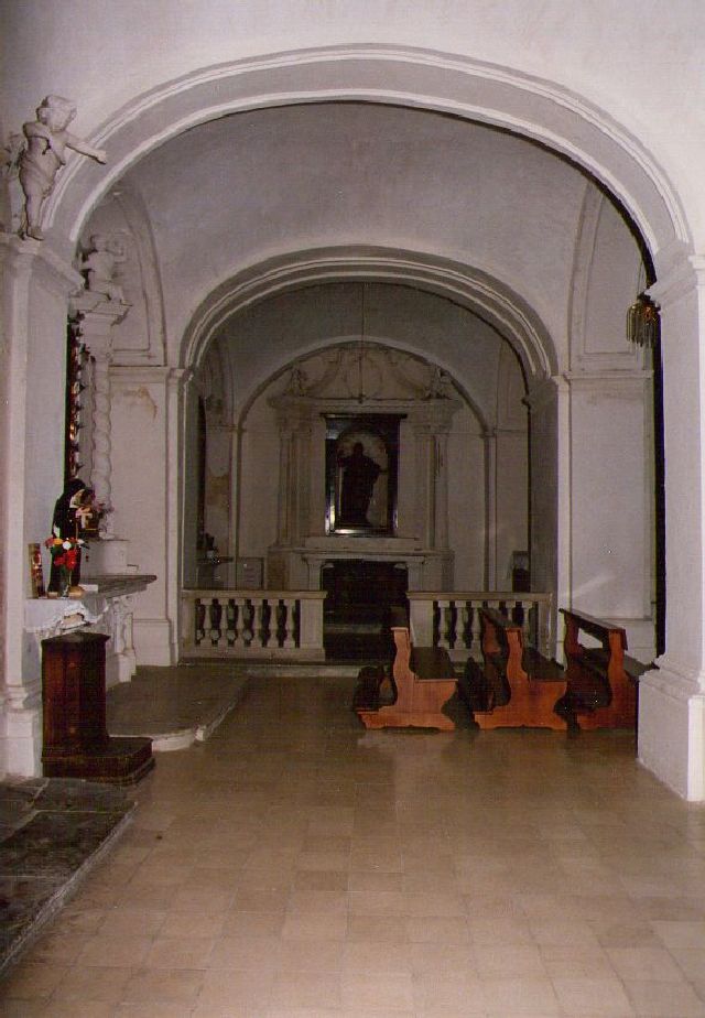La chiesa a croce latina e pianta rettangolare (dim. 19,40x21,60 h. 12mt) è a tre navate asimmetriche con campate voltate a crociera, muratura continua intonacata, poggiantre su un basamento in roccia. Il tetto è a falde e manto in tegole di laterizio. La chiesa presenta facciata a salienti: dal fronte principale caratterizzato da sole tre finestre, si accede ad un sottopasso che conduce all'accesso principale posto sul fronte laterale Sud. Una serie ritmica di finestre, al secondo livello della navata centrale, la illuminano. Nelle navate laterali serie di quattro altari a sinistra e tre a destra, con l'accesso secondario Nord. E' fiancheggiata a Nord da campanile a tre ordini, in muratura di pietra a vista: il primo ordine funge da cavalcavia, questo è sormontato da un balconcino, al di sopra corre una cornice marcapiano, quindi la cella campanaria, con monofore ad arco, concludendosi con cornicione di coronamento e cuspide piramidale