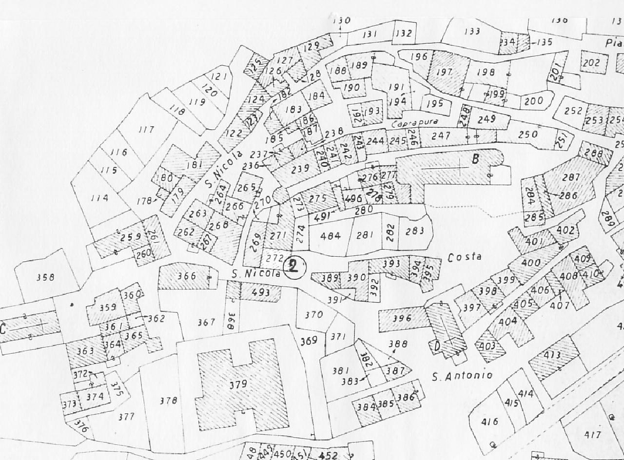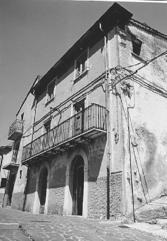 Edificio d'angolo di tre piani fuori terra, di cui uno seminterrato, con scala interna. Rimessa al P.T. ed abitazione ai livelli superiori. Muratura in pietrame intonacato, strutture orizzontali in ferro e laterizi, come la copertura a tetto con manto in coppi. Facciata caratterizzata da due portali al P.T. sormontati da balconata unica; al piano superiore due finestre