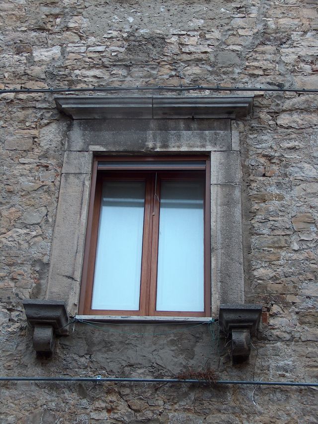 L’edificio in pianta trapezoidale si sviluppa su quattro livelli di piano; la muratura portante è in pietra a corsi irregolari e la copertura del tipo a falde in parte raccordate a padiglione. Sulla facciata principale un portale con arco a tutto sesto e piedritti bugnati a punta di diamante e mensole modanate e concio di volta con doppie volute accartocciate. Le finestre sulla facciata Sud- Ovest presentano cornici in pietra ed alcune di queste hanno davanzali poggianti su mensole modanate. Le facciate terminano con un cornicione con elementi in laterizio del tipo a romanella. Nell'edificio sei unità abitative e tre locali magazzino
