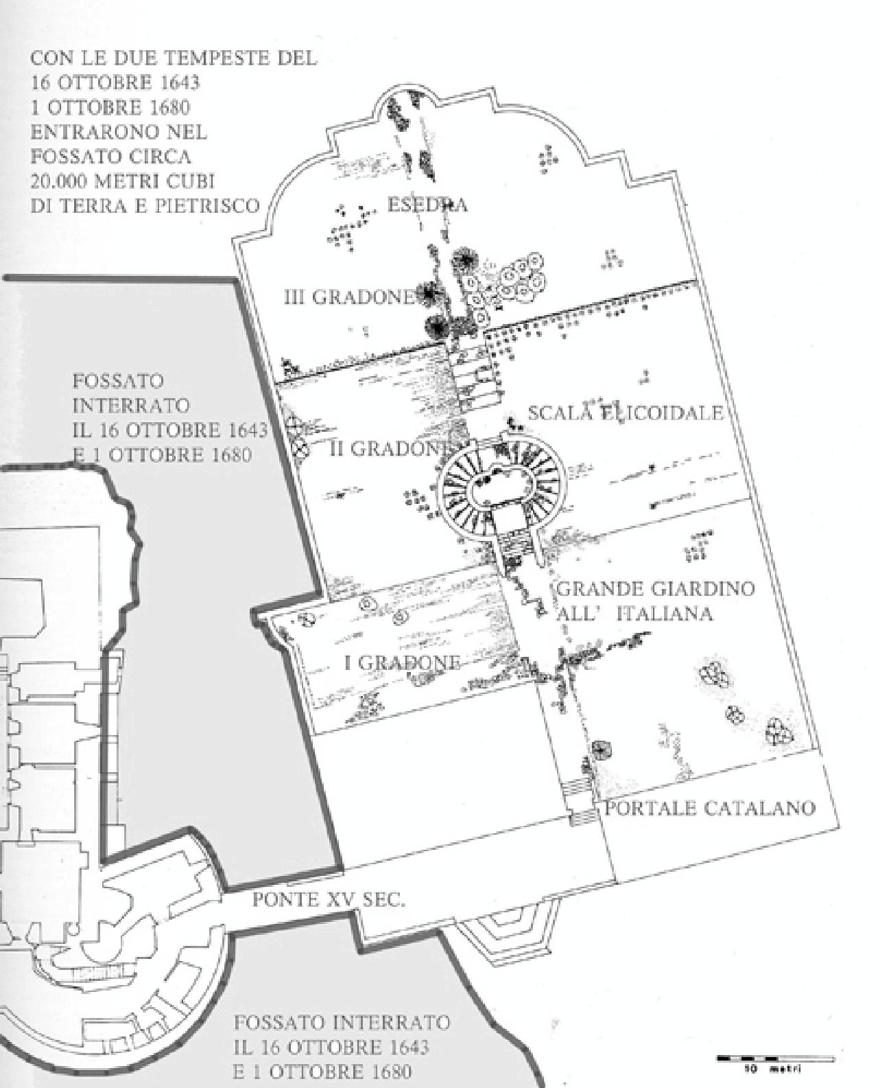 Di forma rettangolare si adagia sul versante della collina, ortogonalmente alle isoipse, secondo un andamento a gradoni. Costituisce un nucleo separato dal Castello Pandone, ma è ad esso collegato mediante un ponte, fronteggiando il castello con il suo lato occidentale. Considerato come una natura in piccolo, il giardino è posto in relazione diretta con la dimora ed in rapporto con lo spazio circostante, concezione paesaggistica in cui la continuità delle scale, dei percorsi e dei terrazzamenti, proietta lo spazio verso il cielo in un prolungamento ideale che coinvolge le montagne circostanti