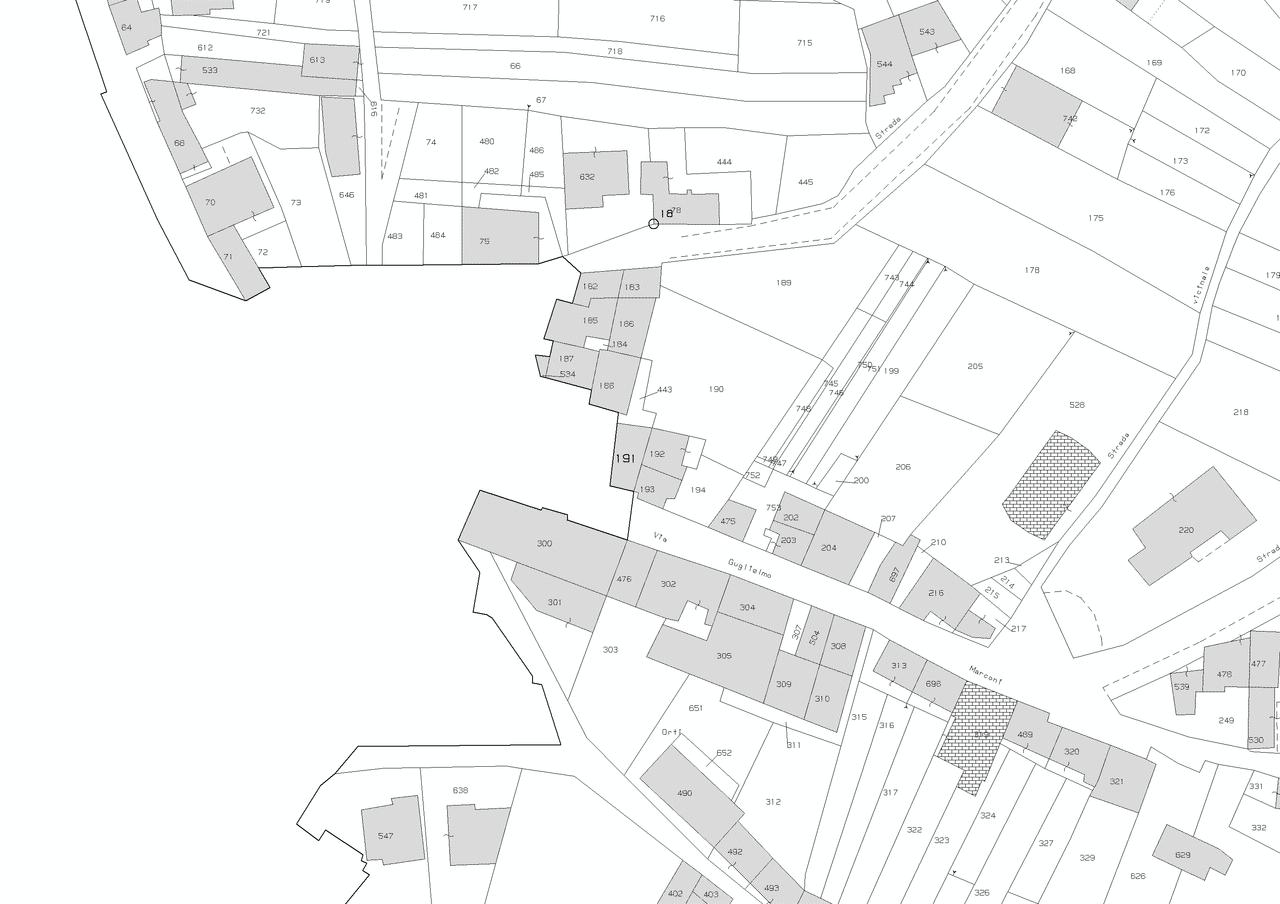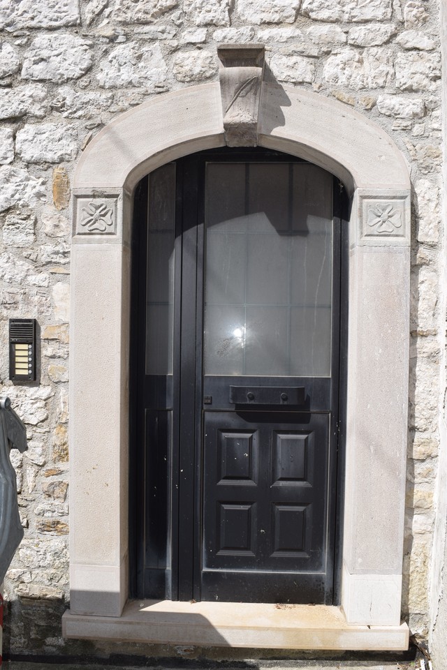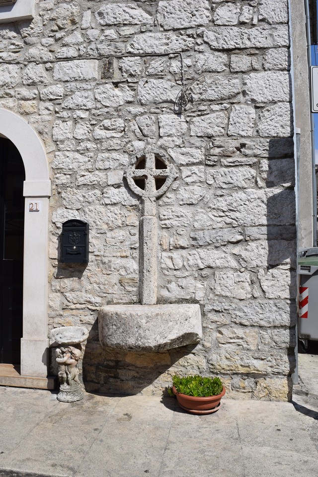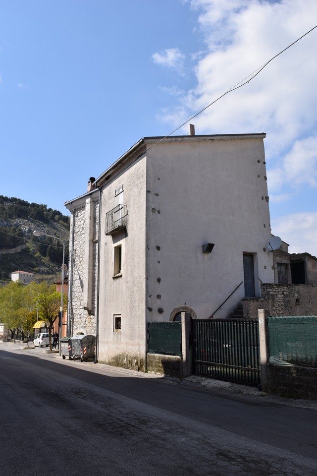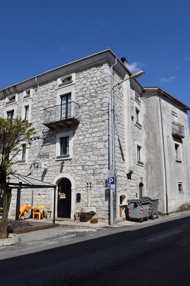 Fabbricato a pianta irregolare con orientamento Est-Ovest a quattro piani fuori terra ed uno seminterrato. La muratura è in pietra, parte a vista e parte intonacata. Il tetto è a falde ed il manto realizzato con coppi. La facciata è caratterizzata da due portali in pietra ad arco a tutto sesto e finestre inquadrate in blocchi di pietra ai piani superiori. Due balconi con ringhiere in ferro battuto sono presenti al secondo piano. Particolare la croce viaria in pietra inglobata nel prospetto principale. Il fabbricato è stato completamente ristrutturato da pochi anni. Nell'immobile tre unità abitative ed un negozio