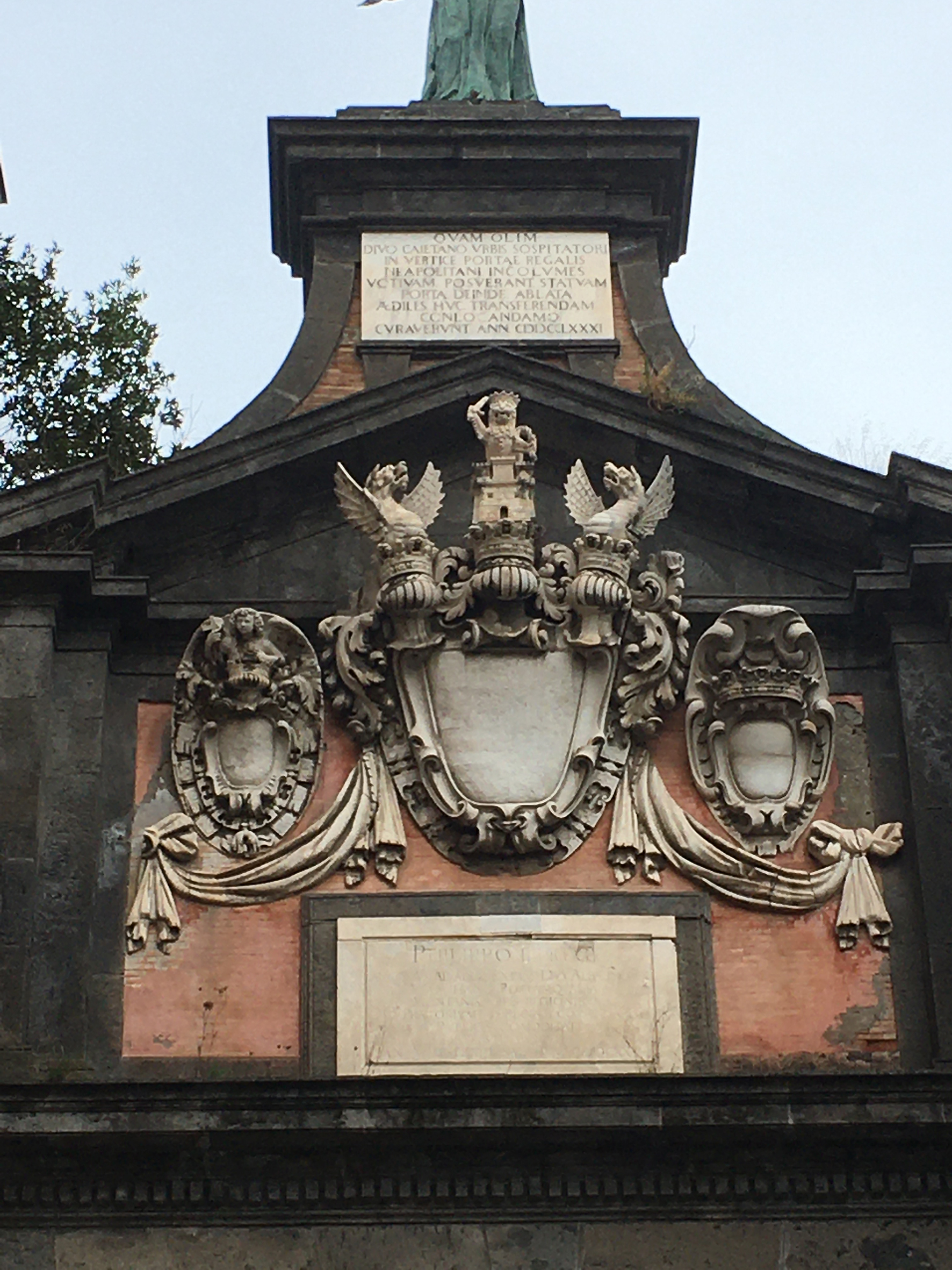 La Porta prospetta su Piazza Dante verso il lato Est. Essa è incastrata tra la parte terminale dell'emiciclo del Liceo Vittorio Emanuele, ex Foro, ed il palazzo che conclude a nord la piazza. Tutta la parte basamentale e centrale della Porta è in conci di piperno a bugne. Da un alto zoccolo si elevano due semicolonne con capitelli dorici e un fregio liscio con gocce. L'edicola superiore è inquadrata da doppie lesene lisce e timpano triangolare. La zona centrale di questa edicola, di muratura di mattoni rossi, contiene tre grossi stemmi marmorei sormontati da torri, aquile e volute ed uniti da un festone marmoreo. Una lapide incorniciata da una cornice in piperno è posta sopra l'architrave.Il coronamento è dato da un pennacchio che si raccorda con volute al timpano sottostante ed una lapide marmorea al centro. Alla sommità è collocata una statua di S. Gaetano. L ‘interno della volta presenta due volte a botte disposte non ortogonalmente all’asse dell’arco dell’ingresso per seguire la direzione della via Porta d’Alba. Il centro della porta è coperto da una semibotte con lucernario cilindrico nella zona sx. Sulla parete di dx portale in piperno di accesso al palazzo contiguo. Sul lato sx balcone dell’edificio che definisce sulla sx la porta