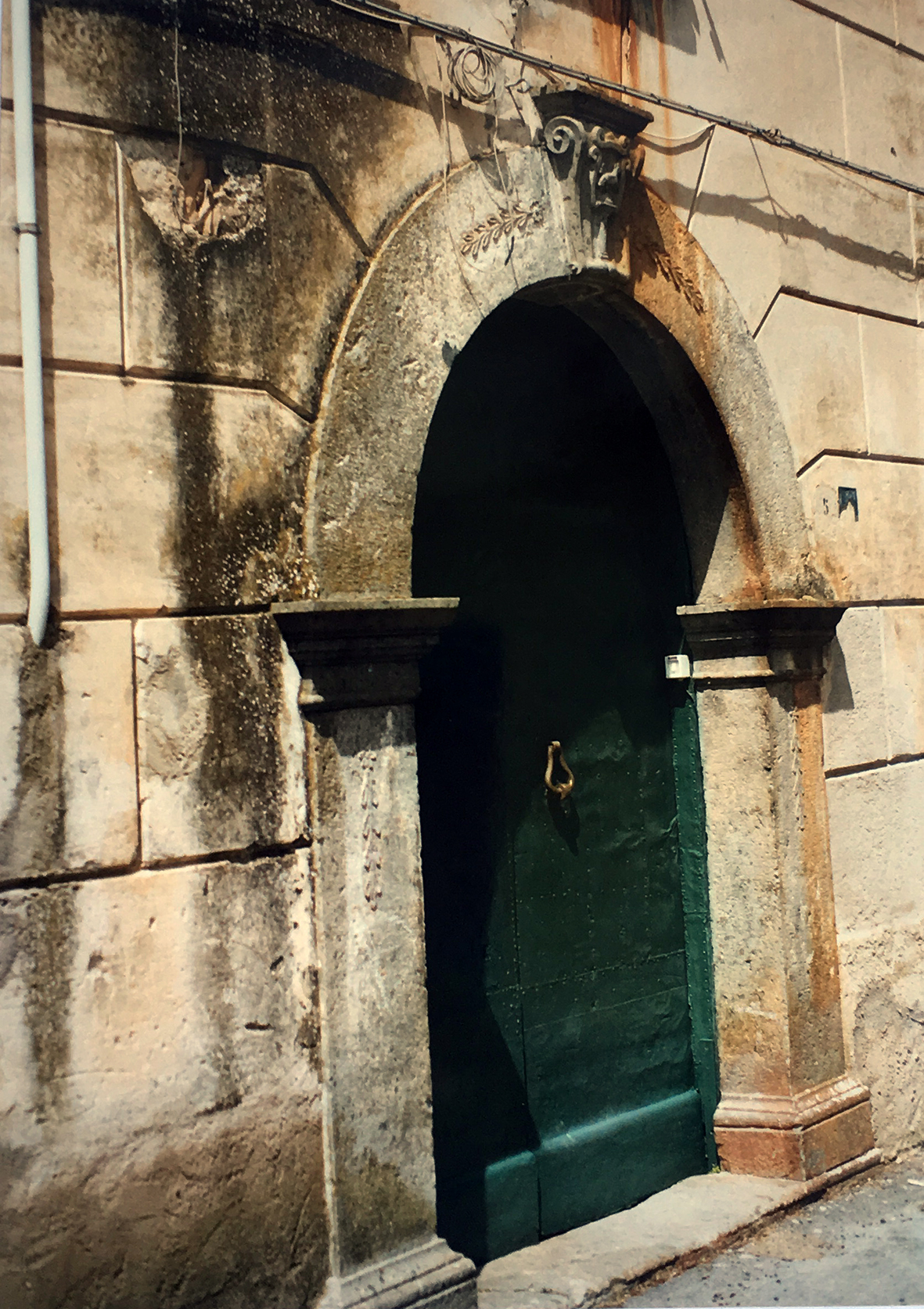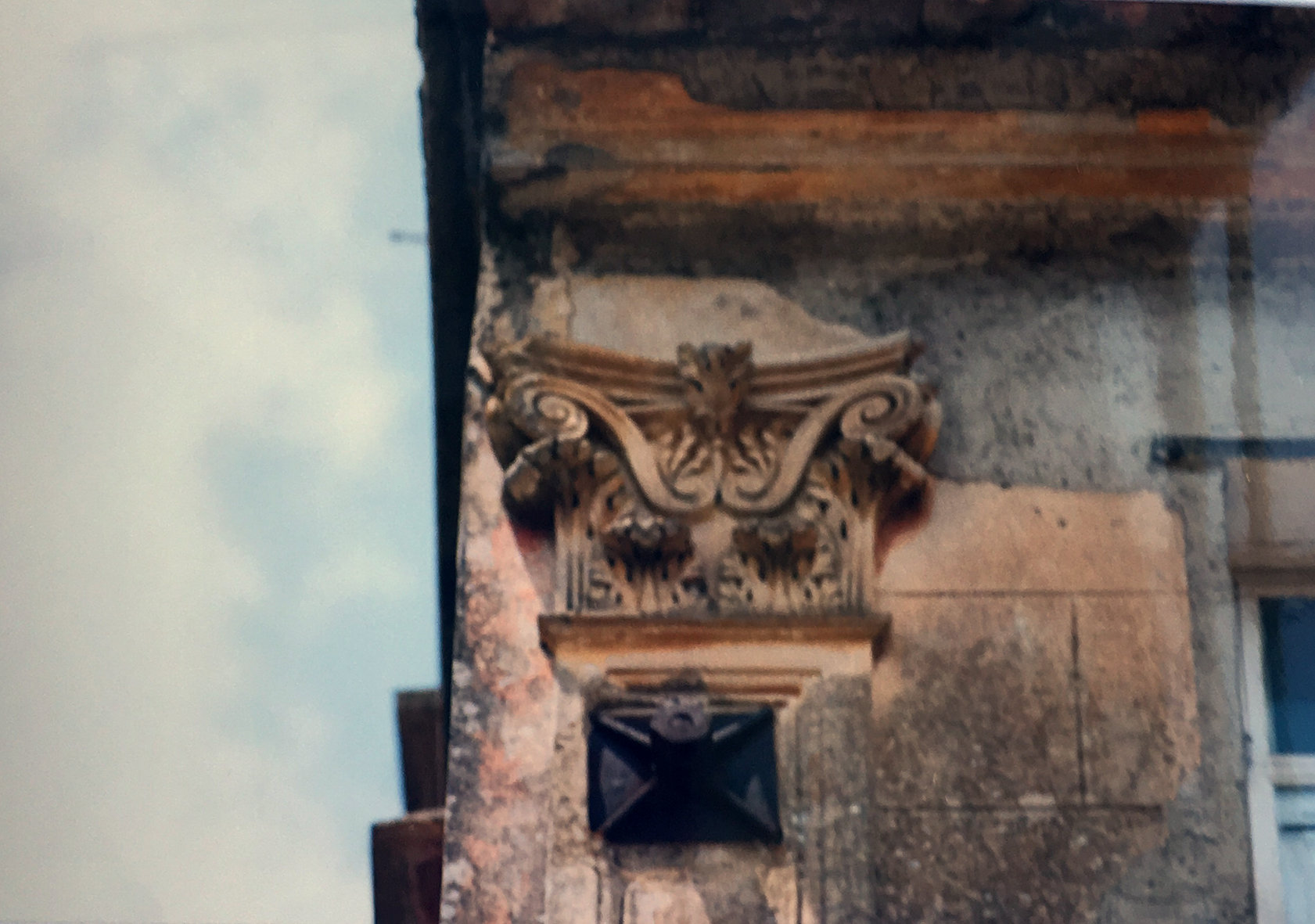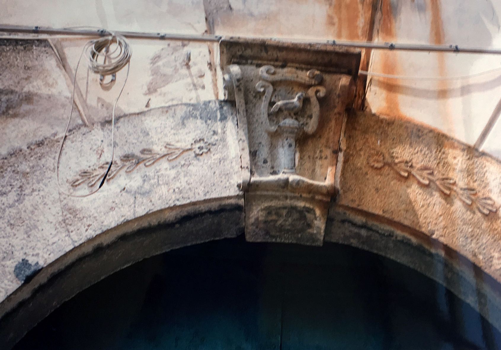 Il primo corpo a forma di torre su base quadrata , composto da due piani furoi terra a livelli continui. la facciata principale del primo corpo è contraddistinta dalla presenza del portale seicentesco, che da l'accesso all'edificio, racchiuso tra due lesene angolari con decorazioni in stucco a motivi floreali, una piccola cornice marcapiano divide il piano terra dal primo, che presenta una finestra in corrispondenza del portale, con una cornice di stucco e un infisso in legno. La facciata termina con un cornicione aggettante retto da mensole con rpofilo mosso a guisa di voluta e coperto da tegole. La copertura è a capanna: due spioventi con colmo parrallelo alla facciata e coppi di argilla in pessima condizione. Il portale citato nel libro di A. Parma con la presenza di una foto con la didascalia "Portale Seicentesco di palazzo Galliano" presenta un arco a tutto sesto in pietra con decorazioni floreali e nella chiave di volta un sistema nobiliare