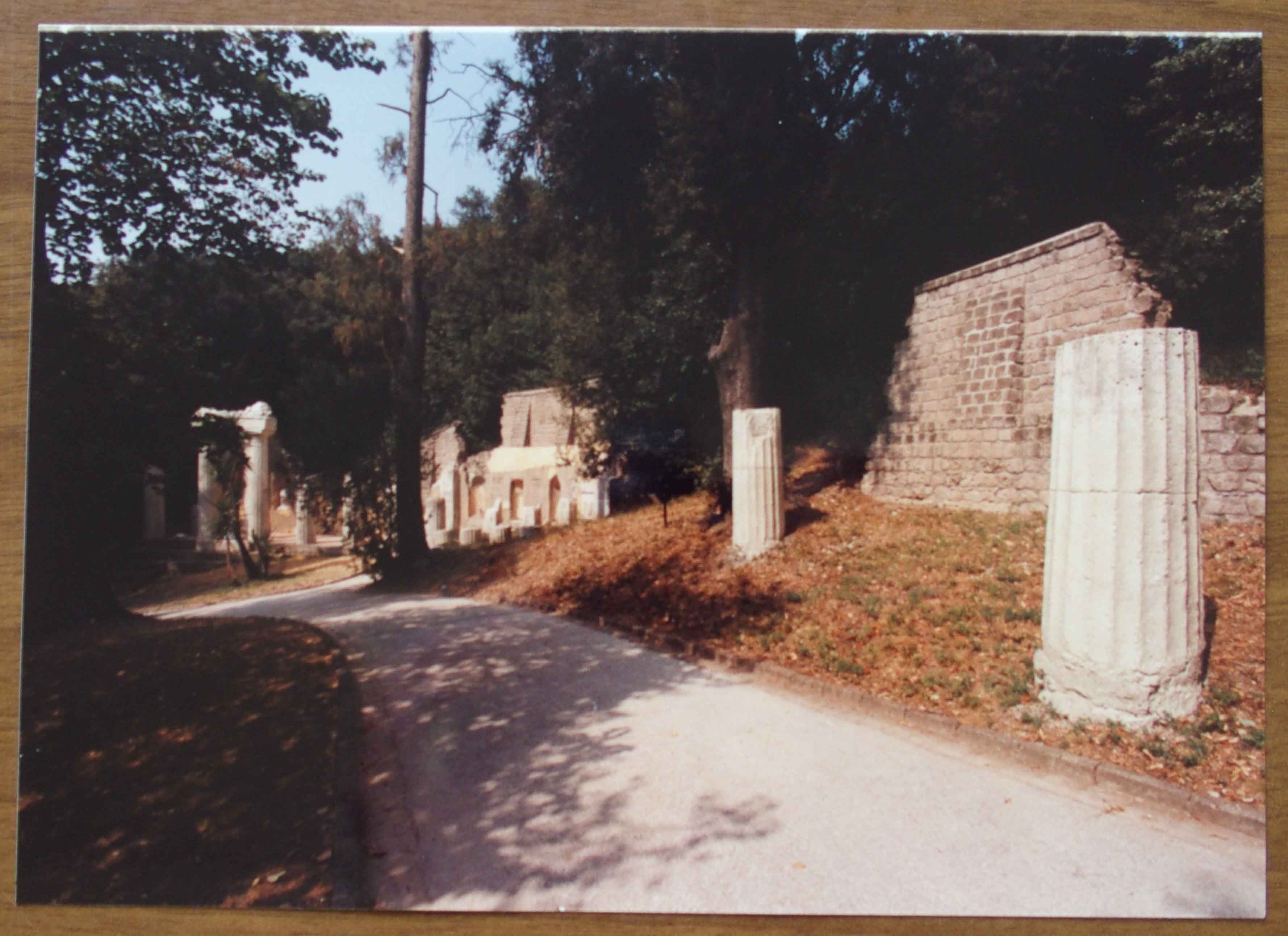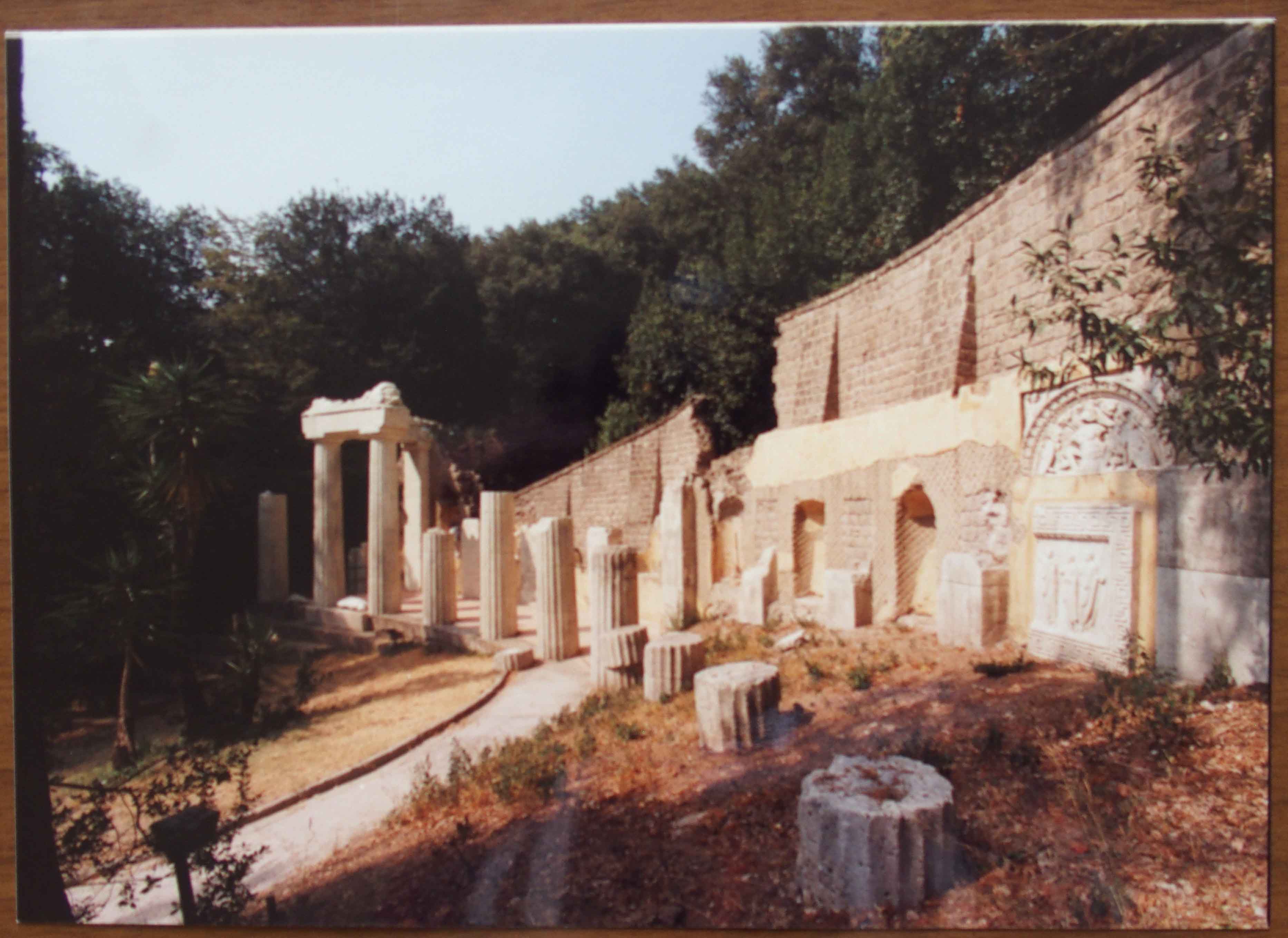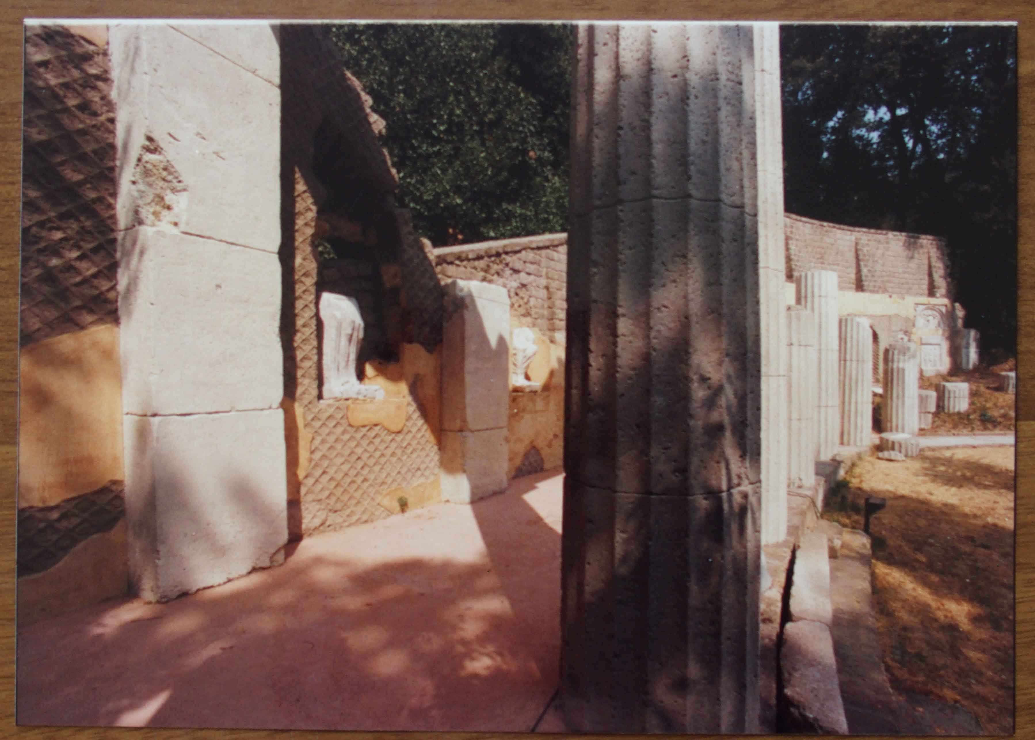 Pianta: isolata, inserita, ad anello, irregolare Numero dei piani: pendìo diagonale, livello continuo, 1 Scale: alto crepidoma decrescente nel pendìo Tenciche costruttive: muratura intonacata, sistema trilitico Pavimenti: battuto di cemento, colorato Decorazioni esterne: frammento trilitico, di ordine dorico Decorazioni interne: nicchie con statue e due bassorilievi marmorei Strutture sotterranee: non rilevabili