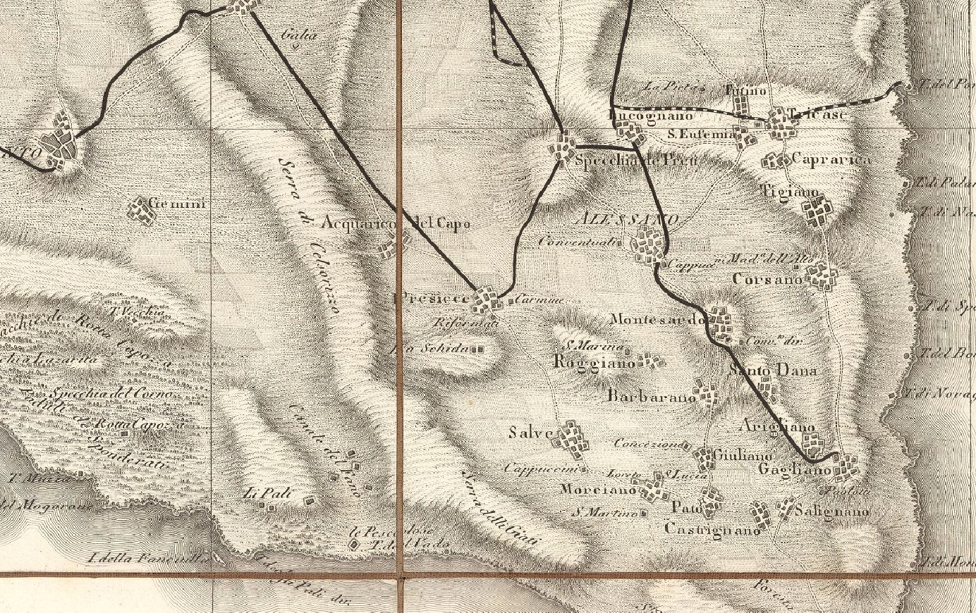 - NOTIZIE STORICO CRITICHE L'origine del centro risale intorno agli inizi del X secolo. Nel 1340 Francesco De Specula concesse il feudo a Giovanni Barrile. Appartenne in seguito a diverse famiglie: nel XV secolo Maria d’Enghien donò Presicce, Acquarica del Capo e Suplessano a Lorenzo Drimi. Nel 1461 Angilberto Orsini del Balzo vendette i feudi di Presicce, Specciano e Pozzo Mauro a Roberto Securo di Lecce. Nel XII secolo sono segnalati due nuclei abitati: uno nei pressi del giardino Cesi (in via Michele Arditi), l’altro a Pozzo Trano, su via Antonio Gramsci. I due nuclei erano collegati dall’antica strada che congiungeva Presicce con Acquarica da un lato, dall’altra Presicce con il distrutto casale di Pozzo Mauro. Il centro non ebbe mai una cinta muraria. Numerosi i trappeti a grotta sorti tra il XIII e il XVIII secolo intorno al Castello, lungo l’asse viario costituito dall’attuale via Arditi, piazzetta Villani, piazza del Popolo, via Gramsci. Dal XVI secolo la signoria di Presicce passò ai Gonzaga, che la acquistarono insieme al contado di Alessano. Alla fine del Cinquecento è barone Filippo Antonio Cito; passa poi ai Bartilotti-Piccolomini di Aragona, principi di Castellaneta; nel 1714 ai De Liguori e, nella seconda metà dell’Ottocento, ai Paternò