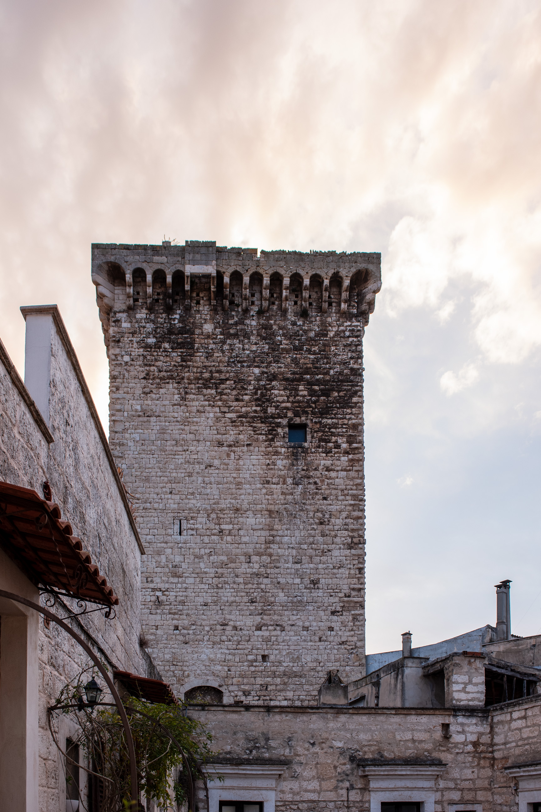 La torre normanna di Rutigliano è tra le più rilevanti torri di guardia edificate in Puglia nel Medioevo. La torre innalzata sulla cima di un colle, ad una altitudine di circa 130 metri, con funzioni di avvistamento e difesa del primitivo borgo, risale probabilmente all’XI secolo. La torre è l’unica rimasta delle quattro che componevano in origine il fortilizio, collegate tra loro da un alto muro di cinta. L’edificazione del castello segnò l’inizio dello sviluppo urbanistico dell’attuale Rutigliano. Alta 34 metri, la torre ha pianta di forma quadrangolare, rivestita in esterno da bugnato in pietra calcarea e termina con un cornicione in tufo con archetti e beccatelli (mensolette), ricostruito verso la metà del Novecento a seguito di alcuni crolli, mentre sui quattro lati si aprono feritoie e piccole finestre. In una sala della torre, forse un tempo adibita a luogo di culto, si conservano affreschi della seconda metà del Quattrocento. Nel cortile, in una nicchia posta alla sommità della scala che conduce ai piani superiori, si conserva una statua in terracotta della prima metà del XVII secolo, raffigurante San Nicola. Anche all’esterno del cortile, si trova un’altra immagine del Santo, un bassorilievo lapideo del XV secolo. La torre è attualmente celata dall’edilizia circostante, con un accesso tramite un cortile raggiungibile da un arco ogivale