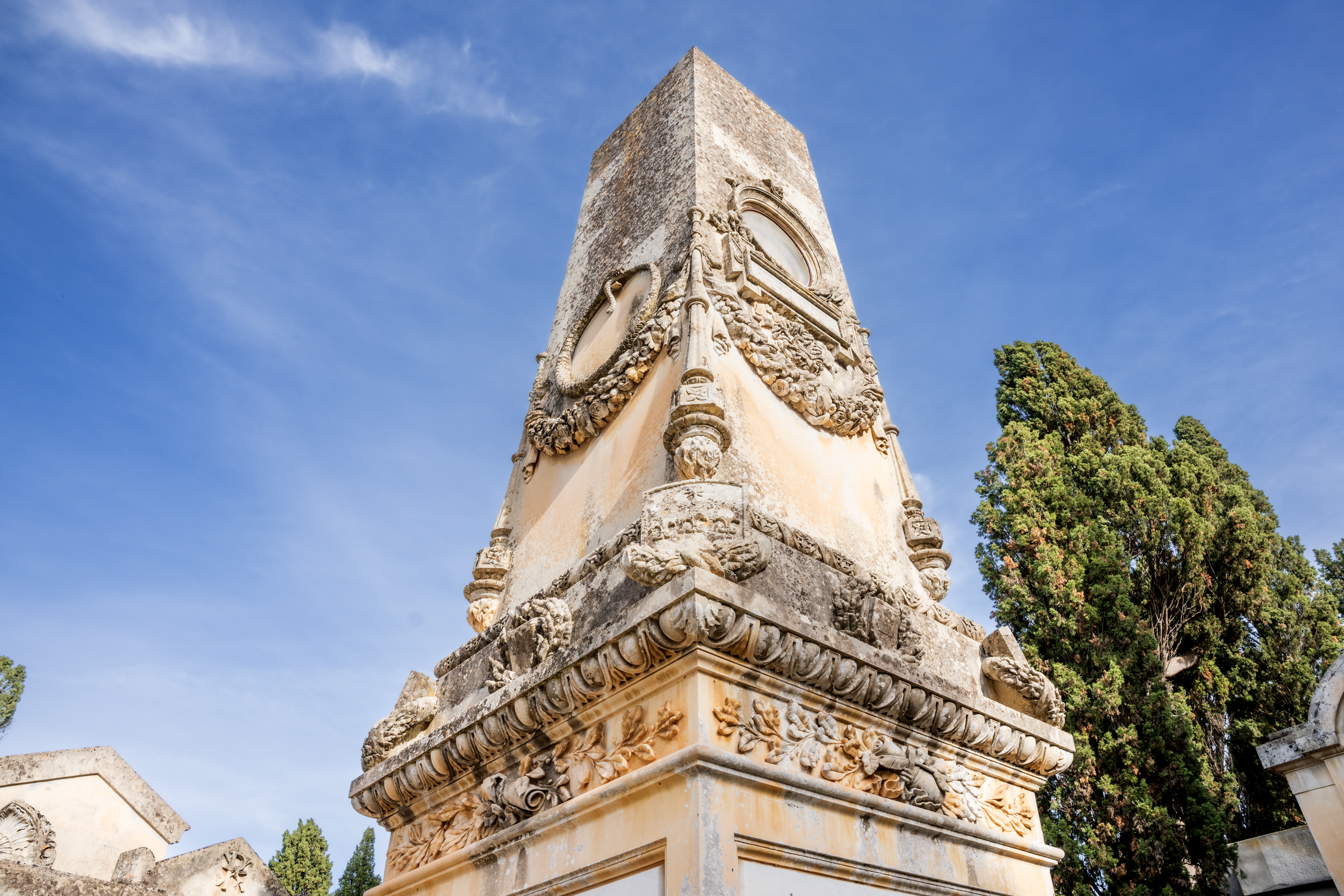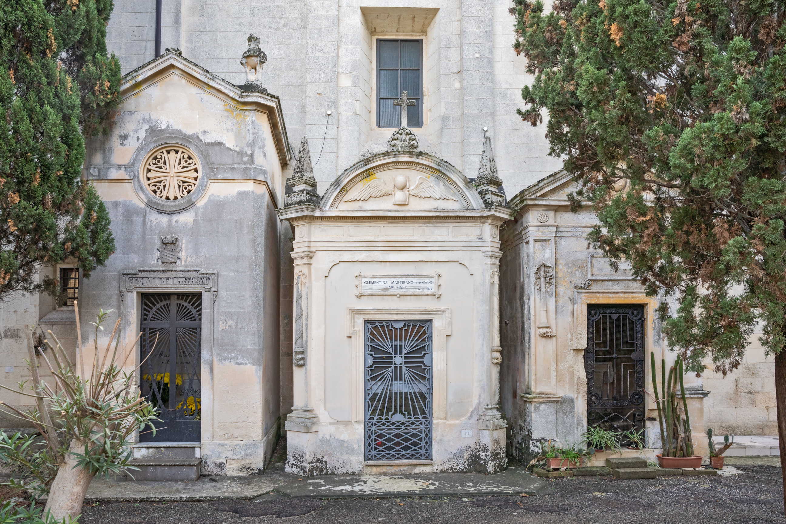 Il Cimitero Monumentale di Lecce, ultimato nel 1845, si struttura come una città nella città, abbellito da vetrate policrome, statue e rilievi in pietra locale e non, architetture orientaleggianti come obelischi, mastaba e piramidi, piccoli “templi” dai profili egiziani e ridotte cappelle romaniche che si mescolano a strutture dal gusto barocco e neoclassico. L’ingresso monumentale del cimitero è collegato alla piazza antistante alla chiesa dei Santi Niccolò e Cataldo da un lungo viale, detto “dei cipressi” perché ornato su ambo i lati da questi mastodontici alberi secolari, che giunge fino alle arcate che anticipano la piazza su cui affaccia la chiesa, oggi ammodernata con la statua dedicata a celebrare i caduti in guerra. Da questa piazza rettangolare si accede al “Giardino funebre” che nel 1897 contava già 600 tombe e costituisce il nucleo più antico del cimitero. L’edificio più antico del complesso cimiteriale resta, però, la chiesa dei Santi Niccolò e Cataldo, eretta nel 1180 per volere di Tancredi d’Altavilla come suo luogo di sepoltura, assieme all’attiguo monastero, non connesso direttamente all’area cimiteriale, dove inizialmente si stabilirono i monaci benedettini e dal 1497 i frati olivetani, che operarono in città fino alla soppressione dell’ordine in Italia meridionale del 1807. Alla sinistra della facciata della chiesa è posto dunque l’ingresso al “Giardino funebre” che si sviluppa entro un’area rettangolare, con vialetti dalle forme irregolari e di diverse dimensioni, dove le tombe si susseguono con le loro peculiarità più disparate e non tutte in buono stato conservativo. Mausolei e cappelle fuori terra creano una maglia irregolare e tortuosa, intervallati solo dal verde di cipressi, oleandri, palme, eucalipti, abeti e vari arbustelli. Si notano anche cappelle in stile neogotico e neoromanico, spesso arricchite da archi decorati con moduli geometrici, colonne tortili, guglie e pinnacoli, sculture dei dolenti e rosoni traforati. Nelle opere neoromaniche qualche capitello ricorda quelli della vicina chiesa dei Santi Niccolò e Cataldo, romanica di fondazione, ma si mostrano in tutta la loro bellezza anche le cappellette dalle facciate policrome, dai colori caldi e quasi surreali. I materiali più utilizzati sono marmi, spesso locali, pietra leccese e carparo, e il ferro battuto secondo le modalità della tradizione locale. Nella zona antica del cimitero si trovano tombe di uomini illustri, come quelle del tenore Tito Schipa, “l’usignolo” di Lecce, del poeta Vittorio Bodini e del matematico Ennio De Giorgi. Oltre al “Giardino funebre”, il cimitero di Lecce comprende altre due zone, “Il Campo Santo” e “Il Campo di pietà o dei poveri”. Le distinzioni sociali continuavano anche oltre la vita, così i templi gentilizi della parte monumentale diventavano le degne case eterne di chi in vita aveva abitato grandi e fastosi palazzi del centro, mentre le “colombaie” delle Confraternite, come venivano chiamate le cappelle pluripiano, erano poste nel “Campo Santo” per accogliere il ceto medio, riproponendo i palazzoni della periferia. Infine, il “Campo di Pietà” era costituito da sepolture a terra, non meno sacrali, dimore dei meno abbienti