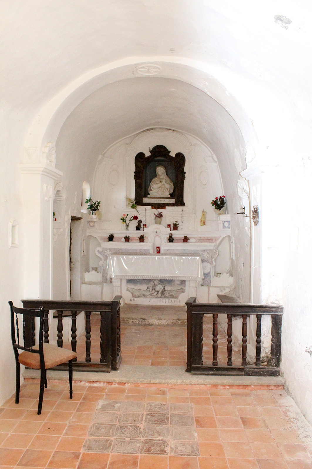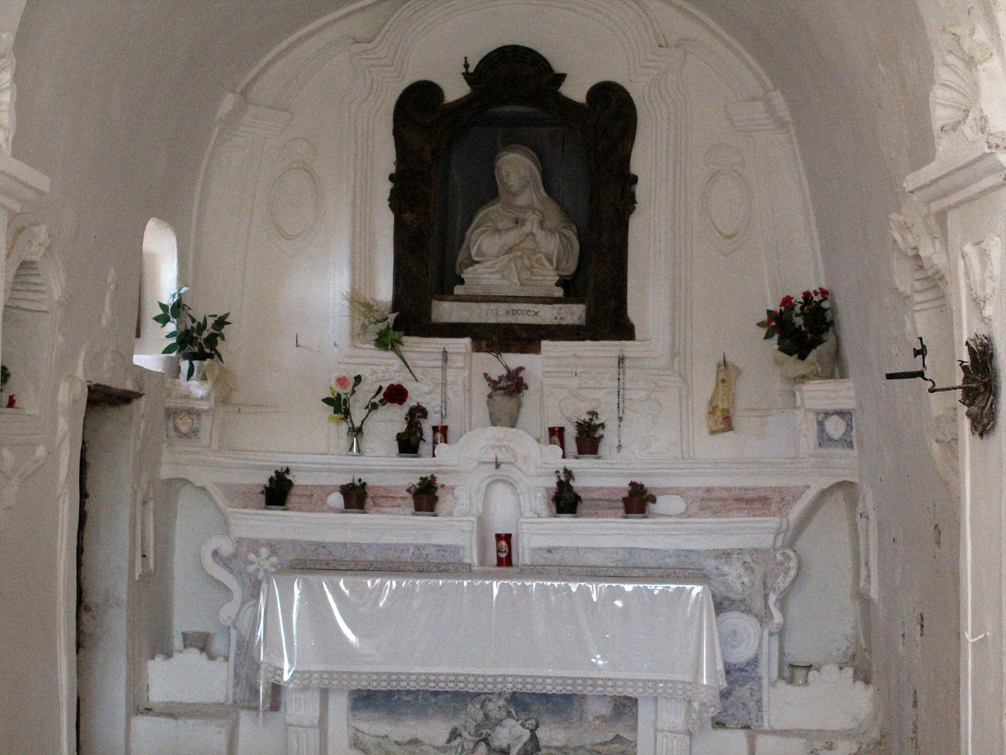Doveva essere un rifugio per monaci itineranti che si spostavano da un cenobio all'altro e che sostavano, abitualmente, in grotte o romitori che trovavano lungo la strada. All’esterno, sulla sinistra, vi è un’edicola con piccole volute, uno stemma, un’epigrafe datata 1809 e una mattonella in ceramica dipinta, del 1814. La facciata a terminazione mistilinea è caratterizzata da un portale di ingresso a tutto sesto, dove è visibile uno stemma coronato datato 1810. La struttura è in muratura portante in pietra con copertura a volta a botte. Dalla sinistra dell'altare si accede, tramite una porticina, ad una scala che porta al livello superiore, dove è posta una camera contenente un camino finemente decorato. L’interno, a navata unica, presenta decorazioni in stucco. Nel presbiterio, sul paliotto dell’altare, è dipinta a tempera la Madonna della Pietà, opera di un pittore meridionale del XIX secolo ignoto. Sull'altare si apre una nicchia che ospita una scultura in marmo raffigurante la Madonna della Pietà del 1810, anch'essa opera di uno scultore meridionale ignoto