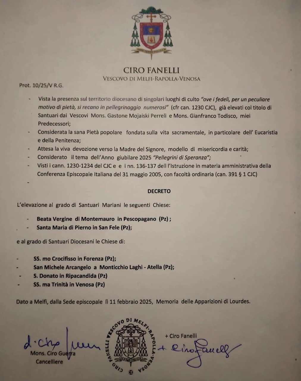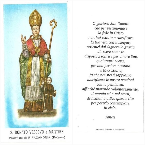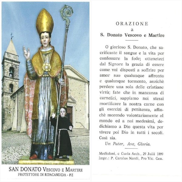 - NOTIZIE STORICO CRITICHE Nella bolla di Eugenio III, indirizzata al vescovo della diocesi di Rapolla, Ruggiero, nel 1152, con la quale il Papa accoglie sotto la diretta protezione pontificia quella diocesi e, precisandone la circoscrizione, ne enumera le chiese e i possedimenti. Non ci sono fonti storiche che riferiscono notizie sulle vicende della Chiesa di San Donato per il periodo che va dal 1152, anno della bolla di Eugenio III, al primo quarto del secolo XIV. Nel 1602, a Terlizzi, si tiene un Capitolo provinciale dei Frati Minori Osservanti della provincia di San Nicola. Vi presiede il Padre Ludovico da Campagna e si istituisce una comunità degli stessi minori a Ripacandida, dove pare che nel 1605 i Francescani fossero già giunti e dessero inizio alla costruzione del convento accanto alla chiesa. A parte il periodo successivo all'apertura del Convento, periodo che pare sia stato pieno di operosità, ed in cui vanno inserite le costruzioni degli altari ancora esistenti sul posto e, probabilmente, anche del Campanile, nei secoli successivi, quella di San Donato dovette essere certamente una comunità molto povera a giudicare dai pochi arredi sacri e dalle suppellettili inventariate nel 1808 dal Delegato dell'Intendenza di Basilicata Decio Lioj; a quell'epoca il convento non ospitava che cinque frati. Con il "Regio Decreto per la Soppressione delle Congregazioni Religiose" del 7 luglio 1866, i dodici i frati che curavano il luogo di culto furono allontanati. In seguito al citato decreto, i conventi, eccetto le chiese, venivano a far parte del Demanio dello Stato, oppure concessi ai Comuni che ne avessero fatta espressa richiesta. L'evacuazione dal convento di San Donato dovette certamente avvenire entro il 31 dicembre del 1866, termine improrogabile per l'esecuzione del Decreto di Soppressione. Il convento, di proprietà del Comune di Ripacandida, venne nel 1894 affidato alle suore Francescane di Gesù Bambino, che lo abitano tuttora e che hanno in custodia il Santuario Diocesano di San Donato