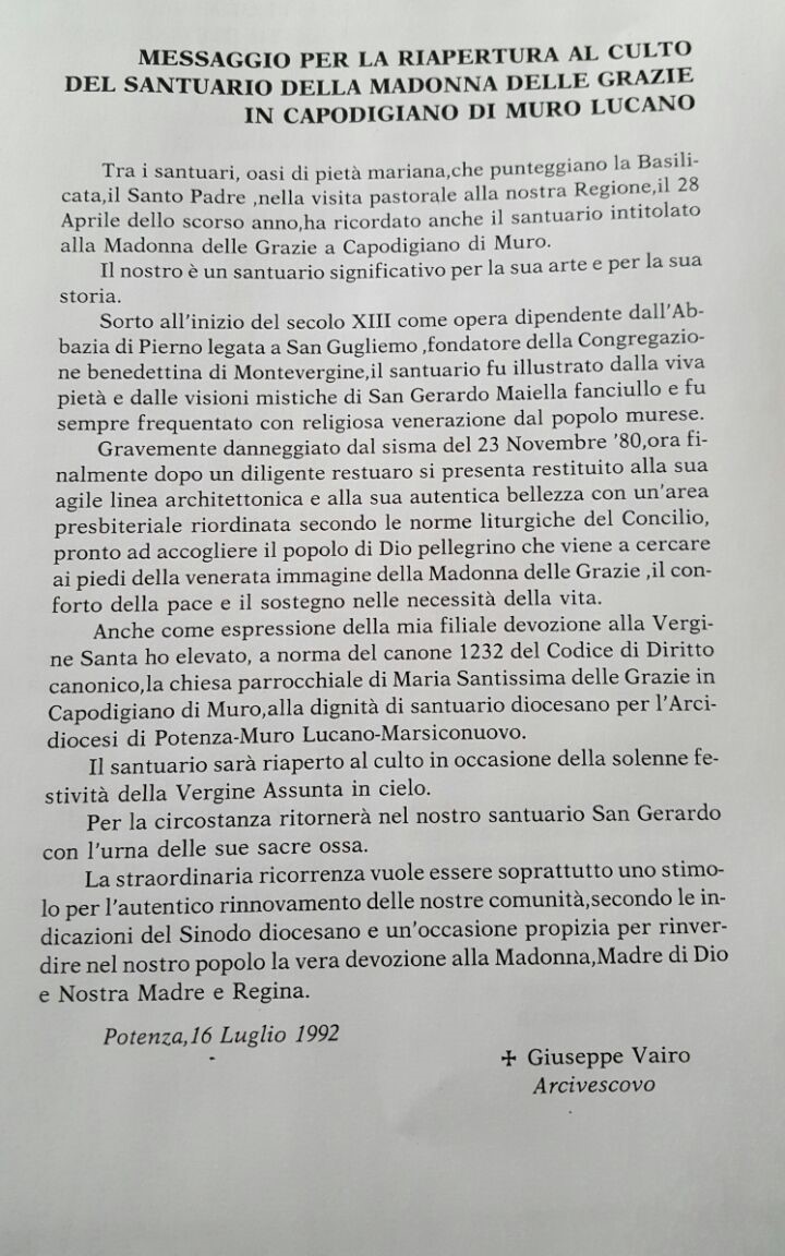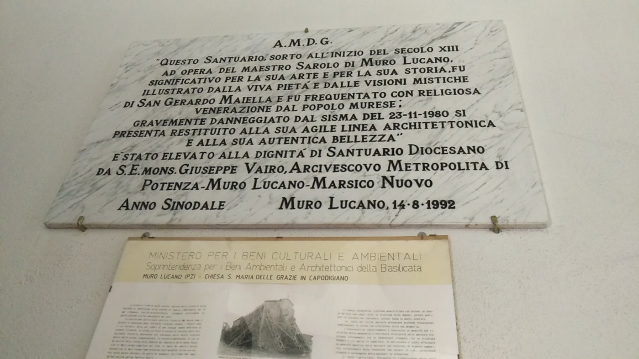 Tra i Santuari, oasi di pietà mariana, che punteggiano la Basilicata, il Santo Padre Giovanni Paolo II, nella visita pastorale in Basilicata, il 28 aprile 1991, ha ricordato anche il Santuario intitolato alla Madonna delle Grazie a Capodigiano di Muro. Il luogo di culto è sorto all’inizio del secolo XIII come opera dipendente dall’abbazia di Pierno legata a San Guglielmo, fondatore della Congregazione benedettina di Montevergine, il Santuario fu illustrato dalla viva pietà e dalle visioni mistiche di san Gerardo Maiella fanciullo e fu sempre frequentato con religiosa venerazione dal popolo murese. Gravemente danneggiato dal sisma del 23 novembre 1980, fu riaperto al culto il 15 agosto 1992, in occasione della solenne festività della Vergine Assunta in Cielo, e dopo un diligente restauro si presenta restituito alla sua agile linea architettonica e alla sua autentica bellezza con un’area presbiterale riordinata secondo le norme liturgiche del Concilio, pronto ad accogliere il popolo di Dio pellegrino che viene a cercare ai piedi della venerata immagine della Madonna delle Grazie, il conforto della pace e il sostegno nelle necessità della vita. Il 16 luglio 1992 l’arcivescovo mons. Giuseppe Vairo ha elevato la chiesa parrocchiale di Maria Santissima delle Grazie in Capodigiano di Muro Lucano, alla dignità di Santuario Diocesano, a norma del canone 1232 del Codice di Diritto Canonico, per l’arcidiocesi di Potenza -Muro Lucano-Marsico Nuovo (Cfr. Messaggio per la riapertura al culto del Santuario della Madonna delle Grazie in Capodigiano di Muro Lucano in Giustina Aceto, Classificazione e Decreti dei Santuari della Basilicata, Città del Vaticano, Libreria Editrice Vaticana, 2019, p. 51)