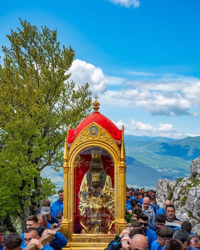 Il luogo sacro è ubicato, ad una altitudine di circa 1725 metri s.l.m, in un paesaggio mozzafiato nel Parco Nazionale dell’Appennino Lucano Val d’Agri Lagonegrese, ad una dozzina di chilometri da Viggiano. Il percorso è carrabile fino ad un certo punto, arrivati alla Piana Bonocore inizia il sentiero da percorrere a piedi, fatta eccezione per eventi straordinari in cui il clero è autorizzato a guidare dei veicoli, che si sviluppa per circa 2 km di tornanti. Nella prima domenica di maggio, come da tradizione secolare, una processione porta la statua lignea dalla chiesa di Viggiano, elevata da Paolo VI alla dignità di Basilica Minore l’11 dicembre 1965 con la bolla “Lucanae genti”, al Santuario sulla vetta del Monte (chiamato “Sacro Monte della Madonna di Viggiano”). All’interno del tempietto è custodita la buca dove, secondo la leggenda, sarebbe stata ritrovata, miracolosamente intatta, la scultura raffigurante la Madonna. Nella prima domenica di settembre, con un percorso inverso, la sacra effigie torna nella Basilica. Il primo accenno ad una cappella dedicata a “Santa Maria del Monte” si trova in una pergamena del 1393, la costruzione della chiesa e del campanile risalgono al XIV secolo. Distrutta da vari terremoti, la Basilica si presenta oggi con un impianto fondamentalmente settecentesco: una lapide ne ricorda la consacrazione il 31 maggio del 1735 ad opera del vescovo di Marsico mons. Alessandro Puoti. Agli inizi del XVI secolo i pontefici Giulio II e Paolo V riconoscevano personalità giuridica al Santuario al Monte, autorizzando l’erezione di un ospedale e di una confraternita presso la chiesa situata nel paese di Viggiano. Sotto il pontificato di Clemente XII, il 12 giugno 1740, il Santuario veniva affiliato alla Basilica Papale di Santa Maria Maggiore. Il 4 settembre 1892 mons. Tiberio Durante, vescovo di Marsico e Potenza, su decreto di Papa Leone XIII e del Capitolo di San Pietro, incoronò la sacra effigie. Il 28 aprile 1991, Papa Giovanni Paolo II incoronò nuovamente la Vergine: «Il sacro Monte di Viggiano mi porta spiritualmente al Santuario di Jasna Góra nella mia terra natale. La sacra immagine che si venera a Viggiano, e alla quale è particolarmente legata la vostra pietà popolare, si trova oggi qui tra noi. Poc’anzi ho benedetto le preziose corone e le ho offerte a nome vostro a Maria, Madre e Regina. “Salve Regina, Madre di Misericordia”, ricorda una nota e suggestiva antifona mariana. Madre misericordiosa è la Vergine, sostegno dei credenti e consolatrice degli afflitti. Madre soprattutto di chi soffre, degli ammalati, dei non vedenti, dei disabili e degli anziani» (Cfr. Giovanni Paolo II, Visita Pastorale in Basilicata: Regina Coeli, Area industriale di «Tito Scalo», Potenza, Domenica, 28 aprile 1991 - https://www.vatican.va/content/john-paul-ii/it/angelus/1991/documents/hf_jp-ii_reg_19910428.html). L’8 dicembre 1995, nel trentennale dell’elevazione del Santuario a Basilica, l’arcivescovo mons. Ennio Appignanesi, su richiesta e approvazione del consiglio comunale, conferiva a Viggiano il titolo di “Città di Maria”. L’8 dicembre dell’Anno Santo 2000 l’arcivescovo metropolita di Potenza-Muro Lucano-Marsico Nuovo mons. Ennio Appignanesi e gli arcivescovi e i vescovi della Provincia Ecclesiastica della Basilicata, visto il canone 1230 del Codice di Diritto Canonico, hanno conferito il titolo di ″Regina della Lucania″ alla venerata immagine della ″Beatissima Vergine Maria del Monte di Viggiano″ (Cfr. G. Aceto, Classificazione e Decreti dei Santuari della Basilicata, Città del Vaticano, Libreria Editrice Vaticana, 2019, p. 53). Dal 2008, il luogo sacro di Viggiano è gemellato con quello spagnolo di “Santa Maria de Montserrat”. In piazza Giovanni XXIII, a Viggiano, è possibile ammirare il monumento in bronzo a grandezza naturale, secondo per dimensioni in Basilicata solo al Cristo Redentore di Maratea, dedicato ai dodici portatori della statua della Madonna Nera, e di un tredicesimo fedele che indica ai portatori la strada verso il Santuario, realizzato nel 2016 dall’artista Felice Lovisco