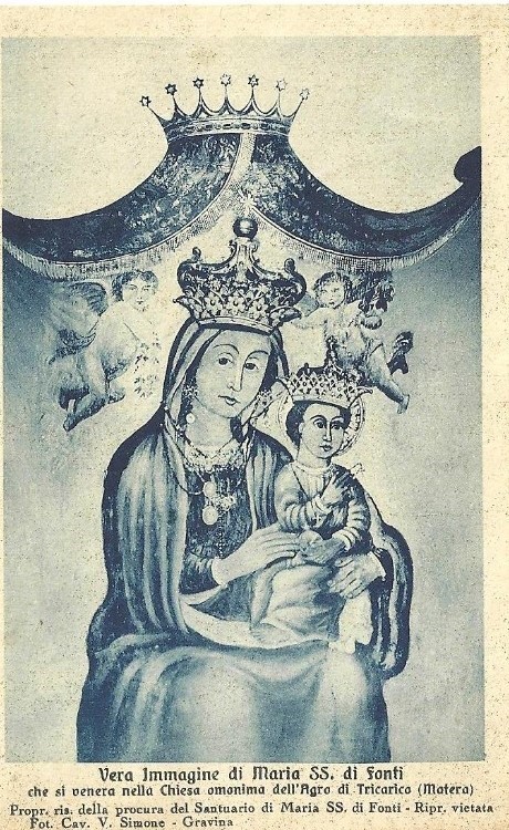 - NOTIZIE STORICO CRITICHE Il culto della Madonna di Fonti affonda le sue origine in una leggenda di fondazione: “Dove ora sorge la chiesa un tempo eravi un roveto impenetrabile, intorno al quale pascolavano gli armenti. Un mandriano, avendo smarrito una delle sue migliori vacche, si mise a cercarla per tutto il bosco. Ed ecco che, dopo tanto affannarsi, la ritrova, piegata sulle gambe posteriori ed intenta a fissare con i suoi glauchi occhi la Immagine della Vergine, dipinta sullo scorcio di un muricciuolo diruto e corroso. Di tale scoverta dette avviso ai compagni, e la notizia si divulgò ben presto fra il clero ed il popolo”. La prima attestazione di un edificio cristiano nel territorio di Tricarico denominato "chiesa di Santa Maria delle Fonti" risale ai secoli XII-XIII ed è collegata alla fondazione di chiese verginiane, site nel cuore più montuoso della Basilicata, lungo entrambe le sponde del medio Basento. Al pari di tutte le altre essa sarebbe stata, infatti, dipendente dall’abbazia di Montevergine e strettamente connessa al monastero di Santa Maria di Cognato, che dovette avere un particolare valore affettivo per i verginiani, essendo legato al ricordo della dimora di San Guglielmo in quel remoto angolo della Basilicata, che coincide ancor oggi con la foresta di Gallipoli Cognato. Numerose bolle pontificie attestano la grande spiritualità alla Vergine di Fonti, la prima esplicita menzione della chiesa di Santa Maria delle Fonti è nella bolla emanata da Innocenzo III nel 1209; ulteriori testimonianze provengono dalla bolla di Alessandro IV (1261), ove si fa più netta la distinzione tra i possedimenti in San Chirico e le chiese di San Giovanni e di Santa Maria degli Angeli in diocesi di Tricarico: “In tenimento Sancti Clerici ecclesiam Sanctae Mariae de Angelis, homines, vineas et alias possessiones, quas ibidem habetis” ed ancora “In comitatu Tricaricensi ecclesiam Sanctae Margaritae, ecclesiam Sanctae Mariae de Oliva, ecclesiam Sancti Iconij, ecclesiam Sanctae Mariae de Funtis, ecclesiam Sanctae Helenae et ecclesiam Sanctae Mariae de Angelis cum hominibus, molendinis et omnibus pertinentiis suis” ed ancora “In diocesis Tricarici: ecclesias Sancti Johannis et Sanctae Mariae de Angelis, homines, redditus et possessiones quas habetis in Sancto Clerico et pertinentiis eius”. La bolla di Urbano IV (1264) cita per l’ultima volta la chiesa “Sanctae Mariae de Fonte cum domibus et possessionibus suis”, mentre un diploma di Federico II del dicembre 1220 accenna vagamente a tutte queste chiese ubicate fuori dagli abitati, specificando che il monastero di Montevergine possedeva “quasdam ecclesias et triginta casatas villanorum in Sancto Clerico de Tricarico”. In una relazione "ad limina" del 1661 del vescovo Pier Luigi Carafa junior, è identificata per la prima volta come Santuario per la devozione di genti provenienti da tutta la Basilicata. Dalla relazione di Potito Antonio della Ratta, vicario capitolare durante la vacanza della diocesi tricaricese negli anni 1805-1819, con cui egli ricostruisce gli eventi miracolosi legati al Santuario in un periodo particolarmente critico per la Chiesa tricaricese, fortemente avversata dal contesto storico e ideologico dell’età giacobina e del decennio francese, durante il quale il luogo sacro ed il bosco di Fonti divennero teatro di scontri fra truppe francesi e filo-borboniche e il culto della Vergine di Fonti fu dai francesi sottoposto - nell’interpretazione anti-giacobina del Della Ratta - a tentativi di distruzione. Per tre anni vennero sospesi i pellegrinaggi a causa dell’incendio e del saccheggio della chiesa e per l’insicurezza di quei luoghi boscosi esposti pure al brigantaggio (1809); nel maggio 1813 una serie di prodigiose lacrimazioni della Vergine, di cui restano tracce significative, affiancate da molti miracoli di “storpi raddrizzati, ciechi illuminati, paralitici risanati, infermi guariti”, rinvigorì quella devozione mariana, rafforzata anche dall’assunzione di particolari indulgenze. Su questi fatti si esprimeva Bonaventura Ricotti: “[...] Quindi in gran fama per fervor di divozione veniva un santuario della Madonna di Fonte, chiesetta collocata in una foresta tricaricense. Gran concorso di circonvicini paesi trae colà per ottener medela ai mali di questa valle di lagrime alla miracolosa immagine di nostra Donna per virtù di prodigio rinvenuta, e che ha venerazione nella prima domenica di maggio, ove il clero di Tricarico preseduto da un canonico va a salmodiare, con molta cura celebrando riti religiosi, e raccogliendo non poche votive offerte, che la pietà de’ devoti offre nelle mani del sacerdozio di Tricarico. La immagine itera i suoi prodigi, e la moltitudine accorrente guarda da quella scaturir sudore, che goccia in liquido [...]”. Le fonti narrative d’inizio Novecento forniscono molte informazioni sulla chiesa, ipotizzando che in origine dovette trattarsi solo di una “cappelluccia” nel bosco di Tricarico, o non altro che un “muricciuolo” grossolanamente costruito, come parve al muratore Francesco Paolo Grassi, allorché al vecchio altare fu sostituito, nel 1898, l’attuale in marmo. Si avanzò anche l’ipotesi che la chiesa potesse essere opera di Sarolo, valente mastro costruttore e lapicida di Muro Lucano (Biscaglia Carmela, Il Santuario di Santa Maria di Fonti. Fasi storiche e costruttive in «Basilicata Regione Notizie», XXVII, 2002, pp. 47-64)