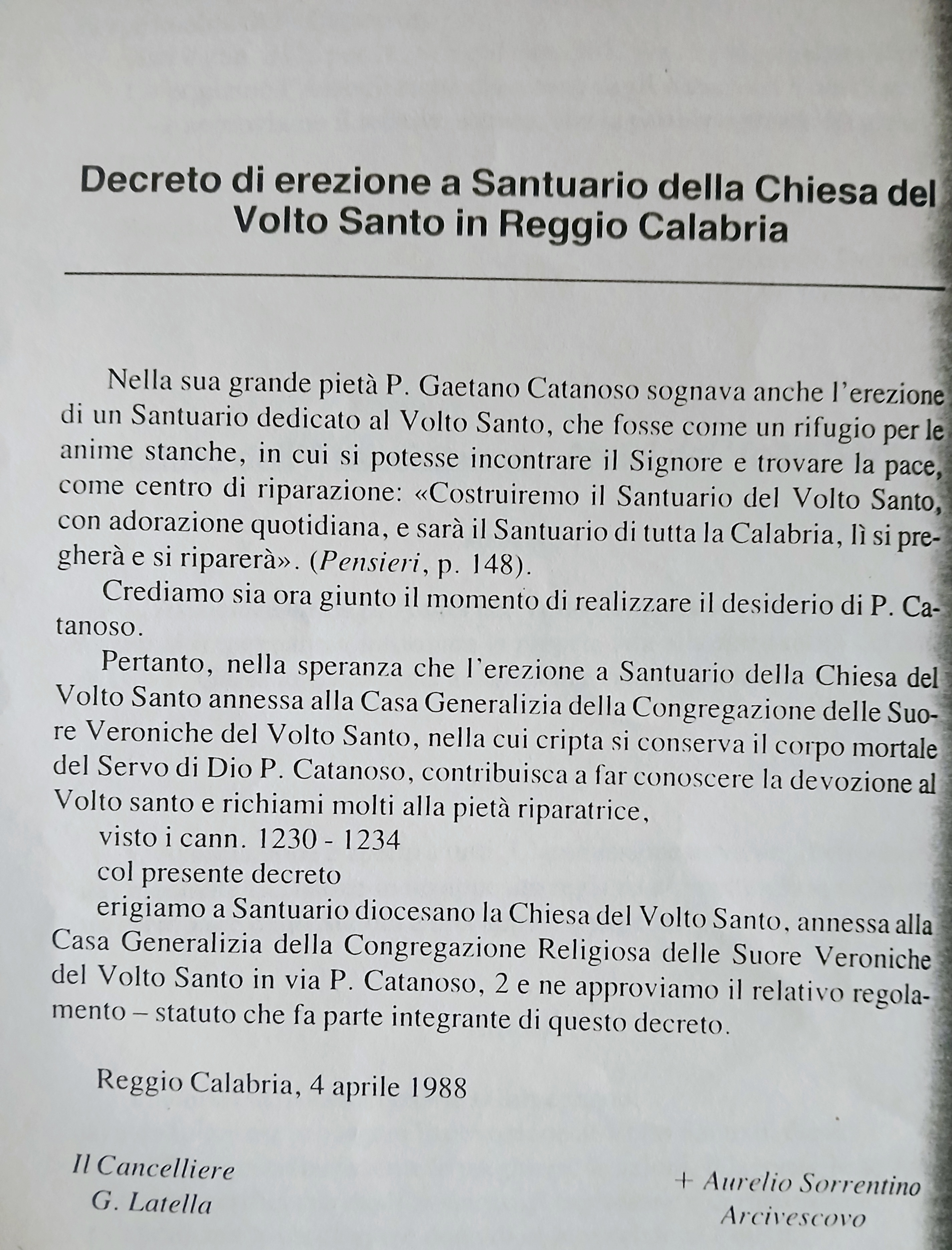 Il Santuario del Volto Santo fu ideato da San Gaetano Catanoso con lo scopo di istituire l’adorazione eucaristica riparatrice. La prima cappella dedicata al Volto Santo fu costruita nel 1940 e rimase fino al 1957. In seguito fu demolita per costruire l’attuale santuario. Nel 1961 Padre Catanoso acquistò il terreno e nel 1962 iniziarono i lavori di costruzione, su progetto della scuola d’arte cristiana Beato Angelico di Milano. La prima pietra fu benedetta da mons. Giovanni Ferro il 4 aprile 1966. Il 12 aprile 1969 l’arcivescovo Ferro benedì la cripta. Il 2 gennaio 1972 fu completata e consacrata la chiesa del Volto Santo. L’interno è ad unica navata. La parte absidale è ricoperta da un mosaico, realizzato il 24 aprile 1982 da Padre Ambrogio Fumagalli dei Padri Benedettini Olivetani, eseguito dalla “Domus Dei” di Roma, e rappresenta in alto Cristo in croce e ai suoi piedi la Veronica che tiene in mano, il Volto Santo di Gesù. La salma del santo Catanoso fu traslata dal cimitero di Reggio Calabria nella cripta del santuario il 22 aprile 1972. Il 21 marzo 1997 Padre Gaetano venne riesumato dalla cripta e trasferito all’entrata del santuario in un’urna. Dopo trentaquattro anni dalla sua morte fu trovato "mummificato", intatto e riconoscibile. Mons. Aurelio Sorrentino ha elevato la chiesa del Volto Santo a Santuario Diocesano il 4 aprile 1988. Nel decreto mons. Sorrentino afferma: «Nella sua grande pietà Padre Gaetano Catanoso sognava anche l'erezione di un Santuario dedicato al Volto Santo, che fosse come un rifugio per le anime stanche, in cui si potesse incontrare il Signore e trovare la pace, come centro di riparazione: "Costruiremo il Santuario del Volto Santo, con adorazione quotidiana, e sarà il Santuario di tutta la Calabria, li si pregherà e si riparerà». La festa principale viene celebrata il 6 agosto. Altre occasioni festive: - 4 febbraio: Santa Veronica protettrice delle Suore Veroniche del Volto Santo; - 19 settembre: Madonna de La Salette; - 20 settembre: San Gaetano Catanoso. Il Santuario dispone di una cripta attrezzata con proiettore per convegni ed incontri. Nel retro del santuario si possono visitare le due prime stanze che hanno ospitato il santo Catanoso negli ultimi anni della sua vita