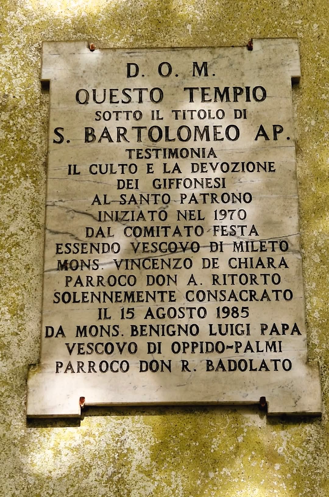 Il Santuario dedicato a San Bartolomeo, patrono di Giffone, è posto in contrada "Contura" presso il monte Locarni. Fu costruito negli anni 1960/70 grazie allo zelo della comunità di Giffone e dai parroci don Antonio Ritorto e don Rosario Badolato. Nelle vicinanze del Santuario venne costruita anche la "fontana di Lu Mustazzolaru" oggi "fonte San Bartolomeo" per prelevare l’acqua da utilizzare per la costruzione del luogo sacro e oggi divenuto punto di ritrovo per i devoti pellegrini. All’interno si ammira il mosaico raffigurante la scorticazione di San Bartolomeo. Il 10 novembre 1997 (Prot. N. 550/97E) mons. Domenico Crusco ha elevato la chiesa dedicata a San Bartolomeo a Santuario diocesano sotto il titolo di San Bartolomeo Apostolo. La festa principale si svolge il 24 agosto con processione per le vie cittadine di Giffone. Il 23 agosto si svolge la processione eucaristica. Il 14 agosto, dopo la celebrazione eucaristica, la statua lignea di San Bartolomeo Apostolo, in pellegrinaggio a piedi, viene portato dalla parrocchia di Maria SS.ma di Soccorso, dove è custodita, al Santuario in contrada Contura. Il 16 agosto il simulacro ritorna, accompagnata da un corteo di devoti, nella parrocchia di appartenenza