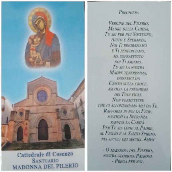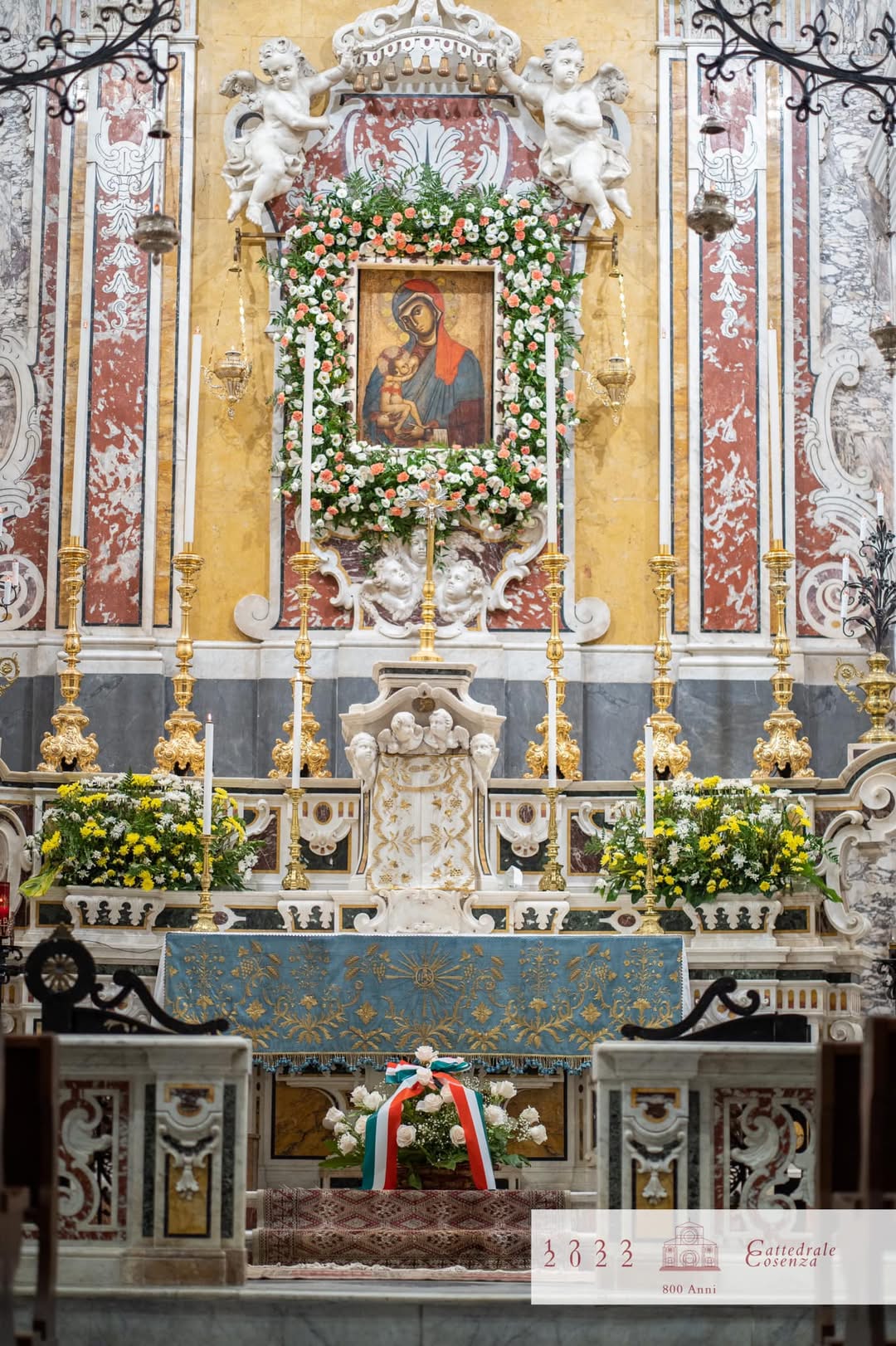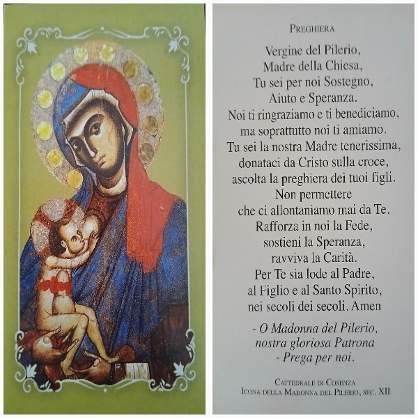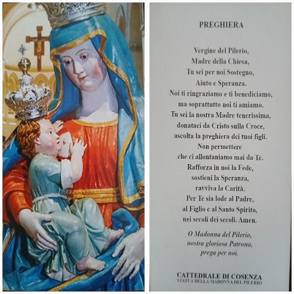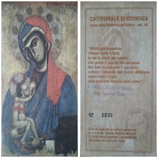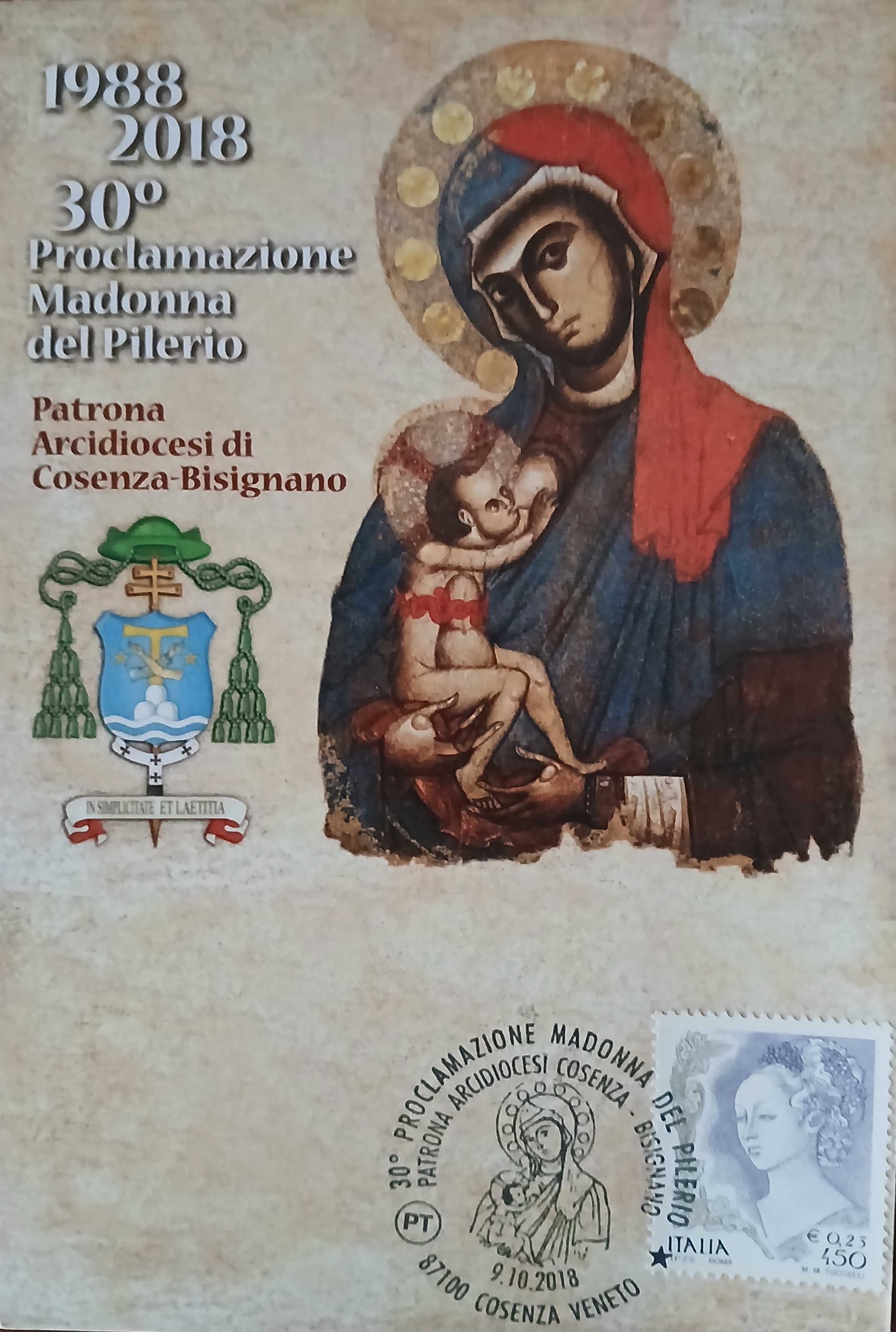 - NOTIZIE STORICO CRITICHE L'inizio del culto della Madonna del Pilerio si fa tradizionalmente risalire al 1576, al cosiddetto miracolo della peste; in quell'occasione la Madonna venne elevata a Patrona della Città di Cosenza. La leggenda narra che la peste imperversava sulla città ed un fedele, in preghiera, si rese conto della miracolosa apparizione sul volto della Vergine di quello che sembrava essere un "bubbone pestifero". Il fenomeno venne constato dalle autorità ecclesiastiche del tempo e da una moltitudine di fedeli che vide, in quel simbolo, la salvezza della città dalla pestilenza. Il dipinto divenne oggetto di venerazione da parte dei cosentini che iniziarono ad indicarlo come "quadro divino". La figura della Madonna del Pilerio è immersa su di uno sfondo d'oro che simboleggia la gloria dei cieli, la sua veste marrone, indica l'umanità della Madonna, il blu del manto rappresenta il suo rapporto privilegiato con la trascendenza, il bianco esprime la sua purezza, il velo rosso indica il suo essere ricoperta dalla grazia divina. Maria è dunque una creatura figlia dell'uomo (marrone), concepita senza macchia (blu) e l'ha riempita di grazia (rosso) per donare il Salvatore, Gesù Cristo (Cfr. Opuscolo "La Cattedrale di Cosenza"; Tuoto Giacomo, La Cattedrale di Cosenza, Cosenza, Pellegrini, 2022)