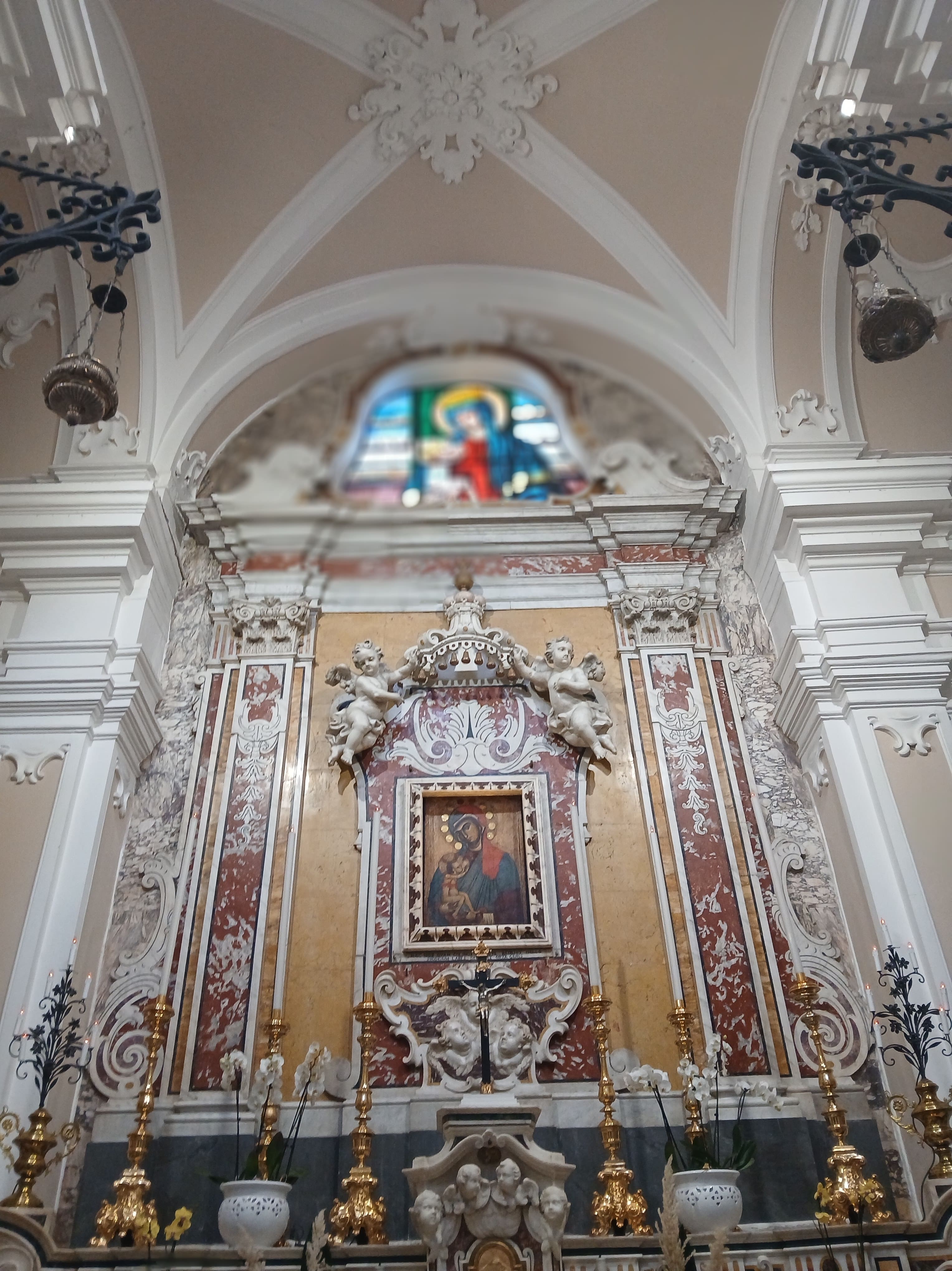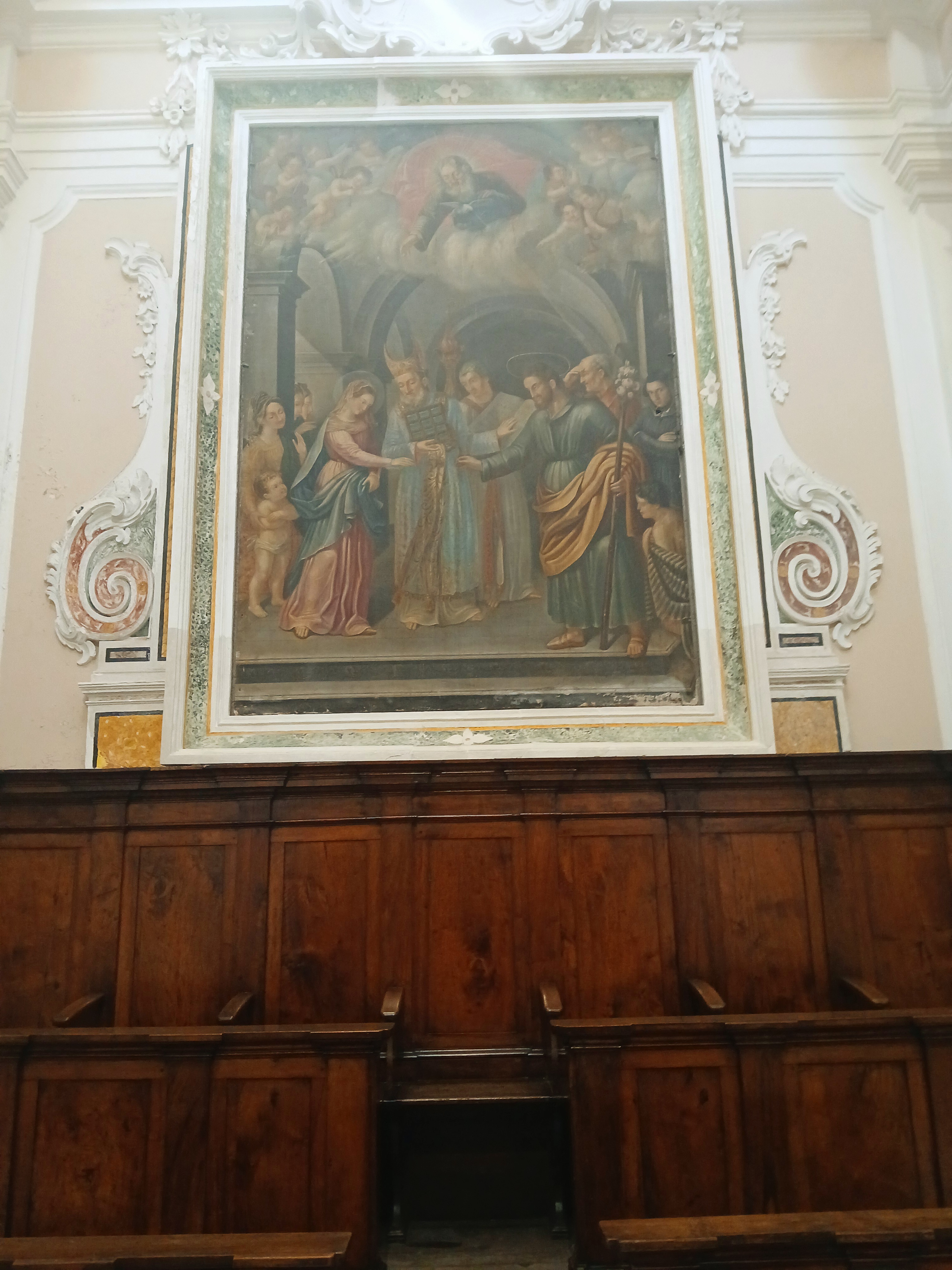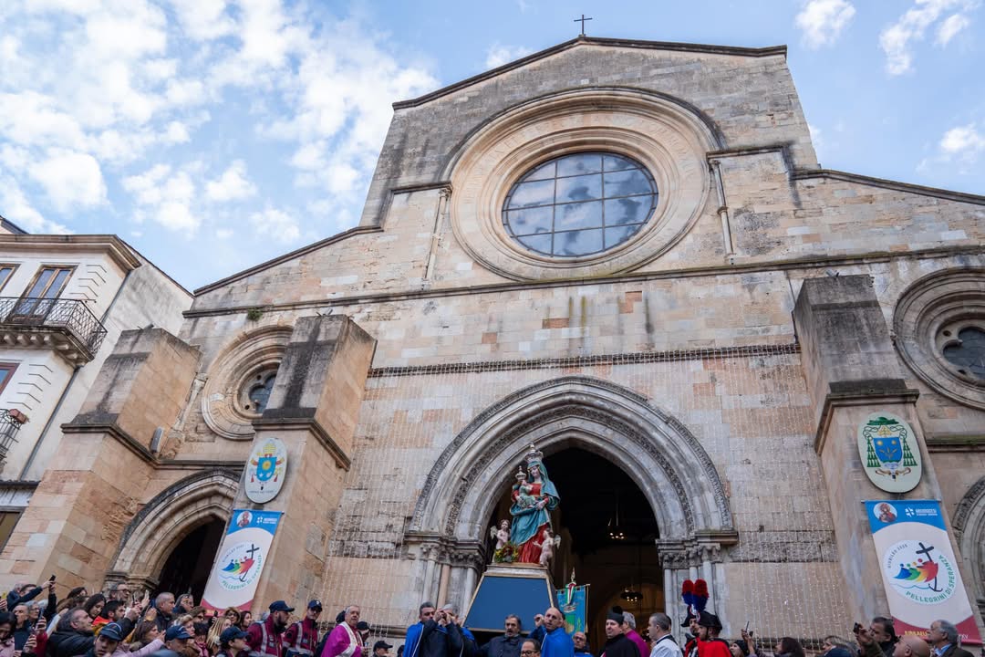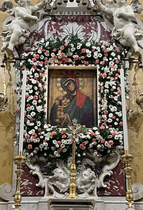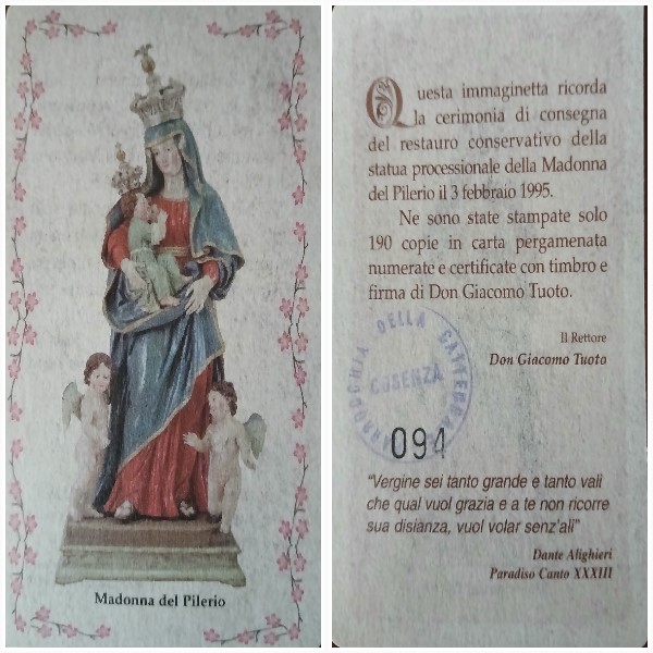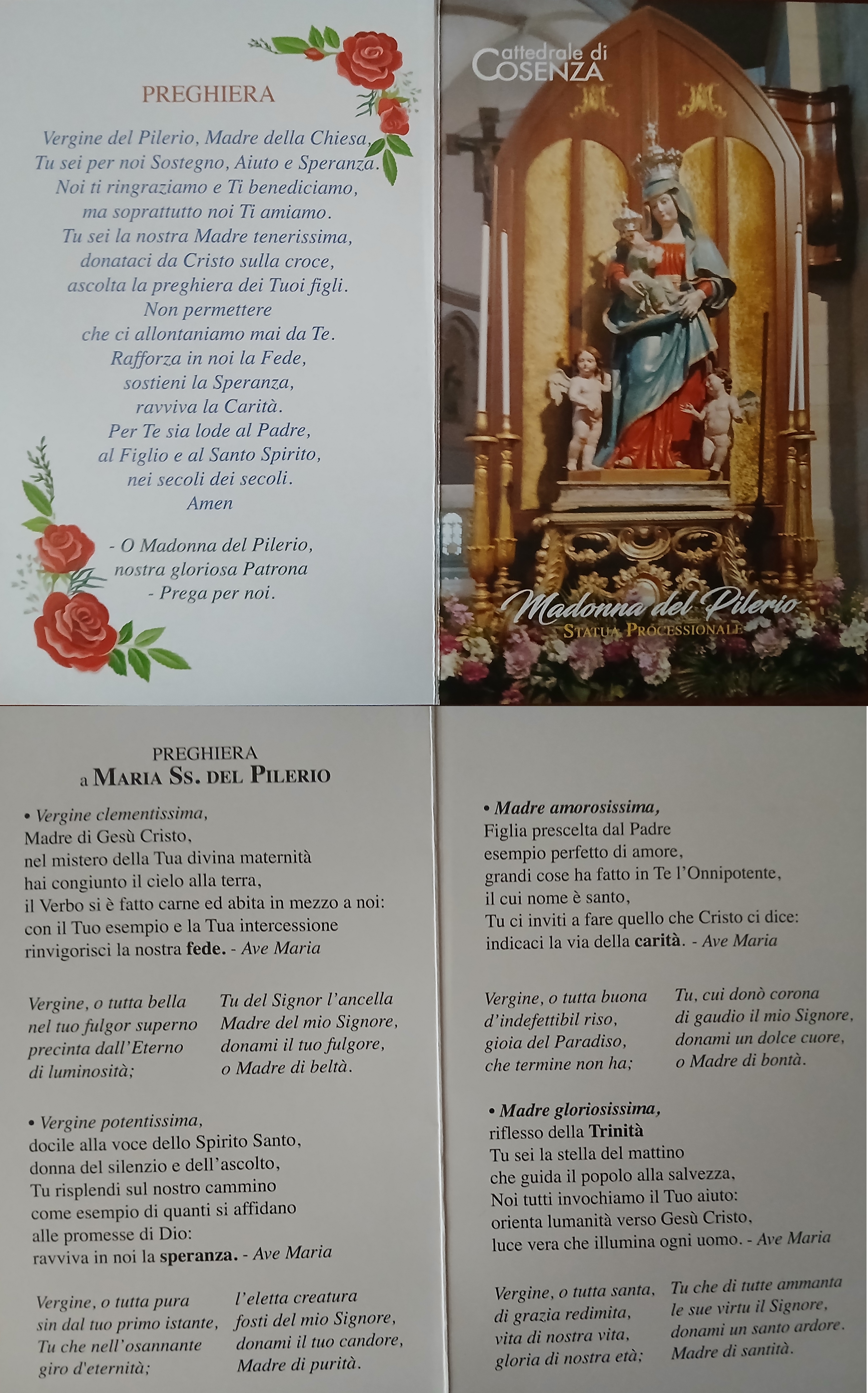 - NOTIZIE STORICO CRITICHE L'inizio del culto della Madonna del Pilerio si fa tradizionalmente risalire al 1576, al cosiddetto miracolo della peste; in quell'occasione la Madonna venne elevata a Patrona della Città di Cosenza. La leggenda narra che la peste imperversava sulla città ed un fedele, in preghiera, si rese conto della miracolosa apparizione sul volto della Vergine di quello che sembrava essere un "bubbone pestifero". Il fenomeno venne constato dalle autorità ecclesiastiche del tempo e da una moltitudine di fedeli che vide, in quel simbolo, la salvezza della città dalla pestilenza. Il dipinto divenne oggetto di venerazione da parte dei cosentini che iniziarono ad indicarlo come "quadro divino". La figura della Madonna del Pilerio è immersa su di uno sfondo d'oro che simboleggia la gloria dei cieli, la sua veste marrone, indica l'umanità della Madonna, il blu del manto rappresenta il suo rapporto privilegiato con la trascendenza, il bianco esprime la sua purezza, il velo rosso indica il suo essere ricoperta dalla grazia divina. Maria è dunque una creatura figlia dell'uomo (marrone), concepita senza macchia (blu) e l'ha riempita di grazia (rosso) per donare il Salvatore, Gesù Cristo (Cfr. Opuscolo "La Cattedrale di Cosenza"; Tuoto Giacomo, La Cattedrale di Cosenza, Cosenza, Pellegrini, 2022)