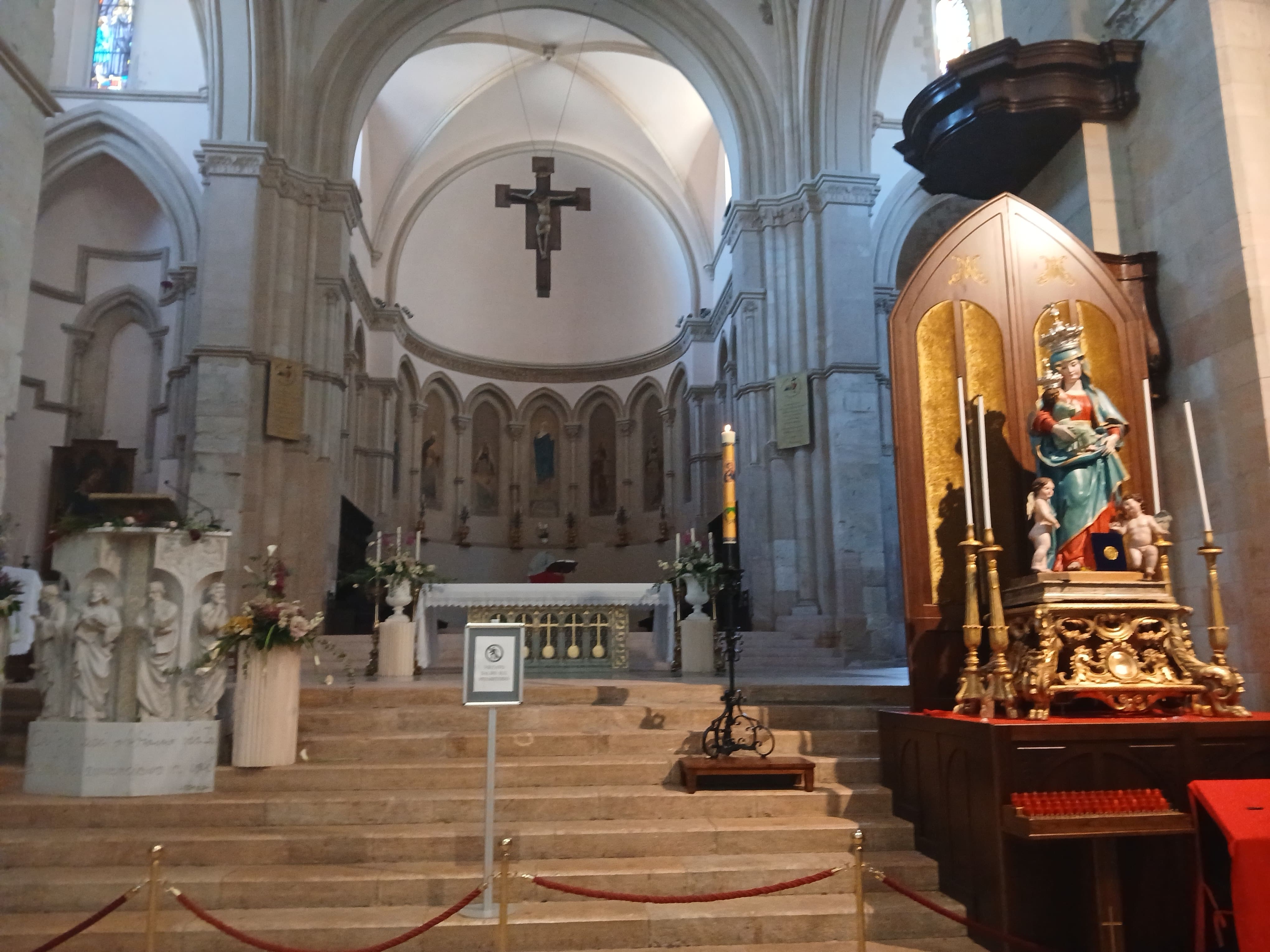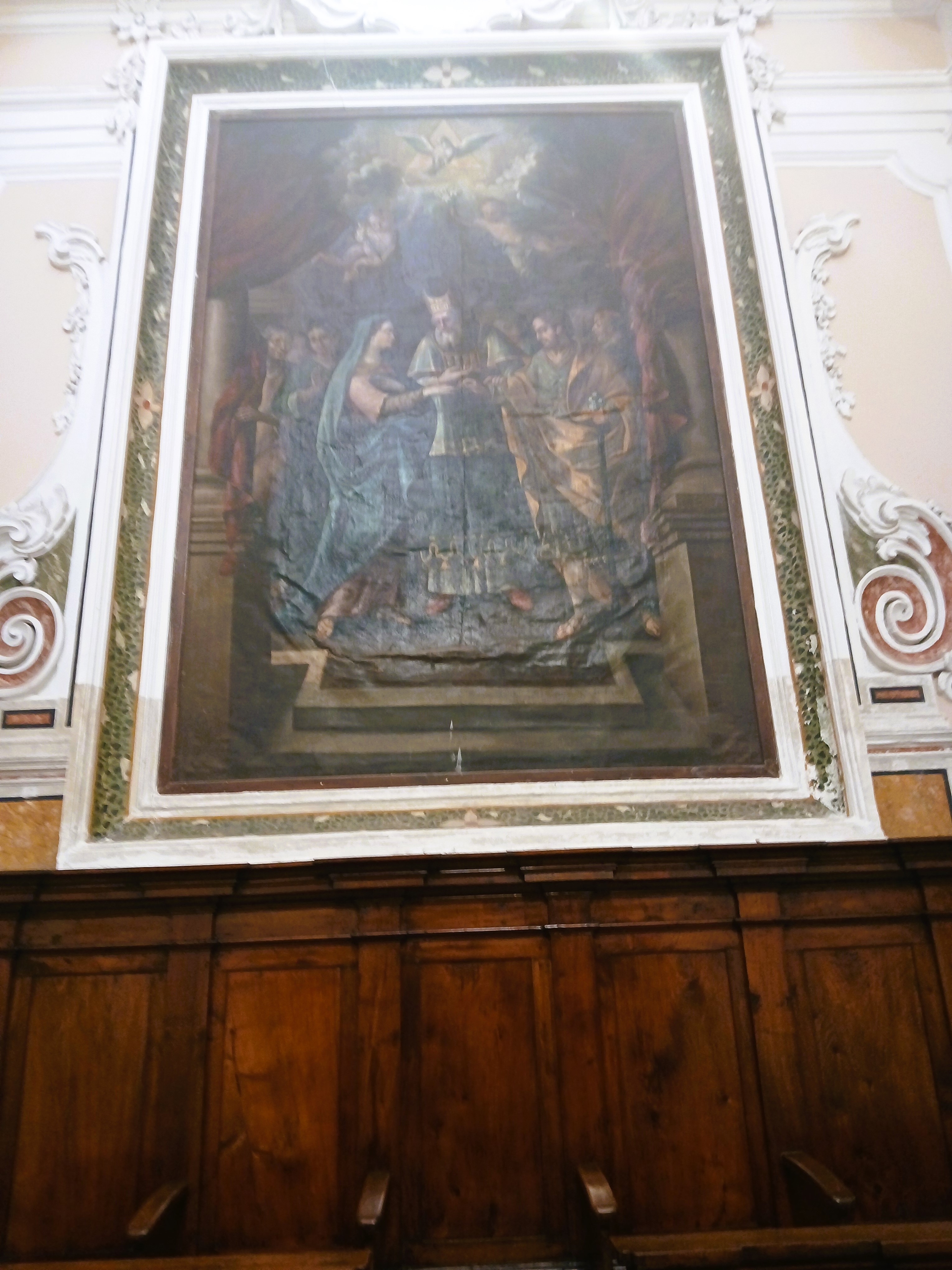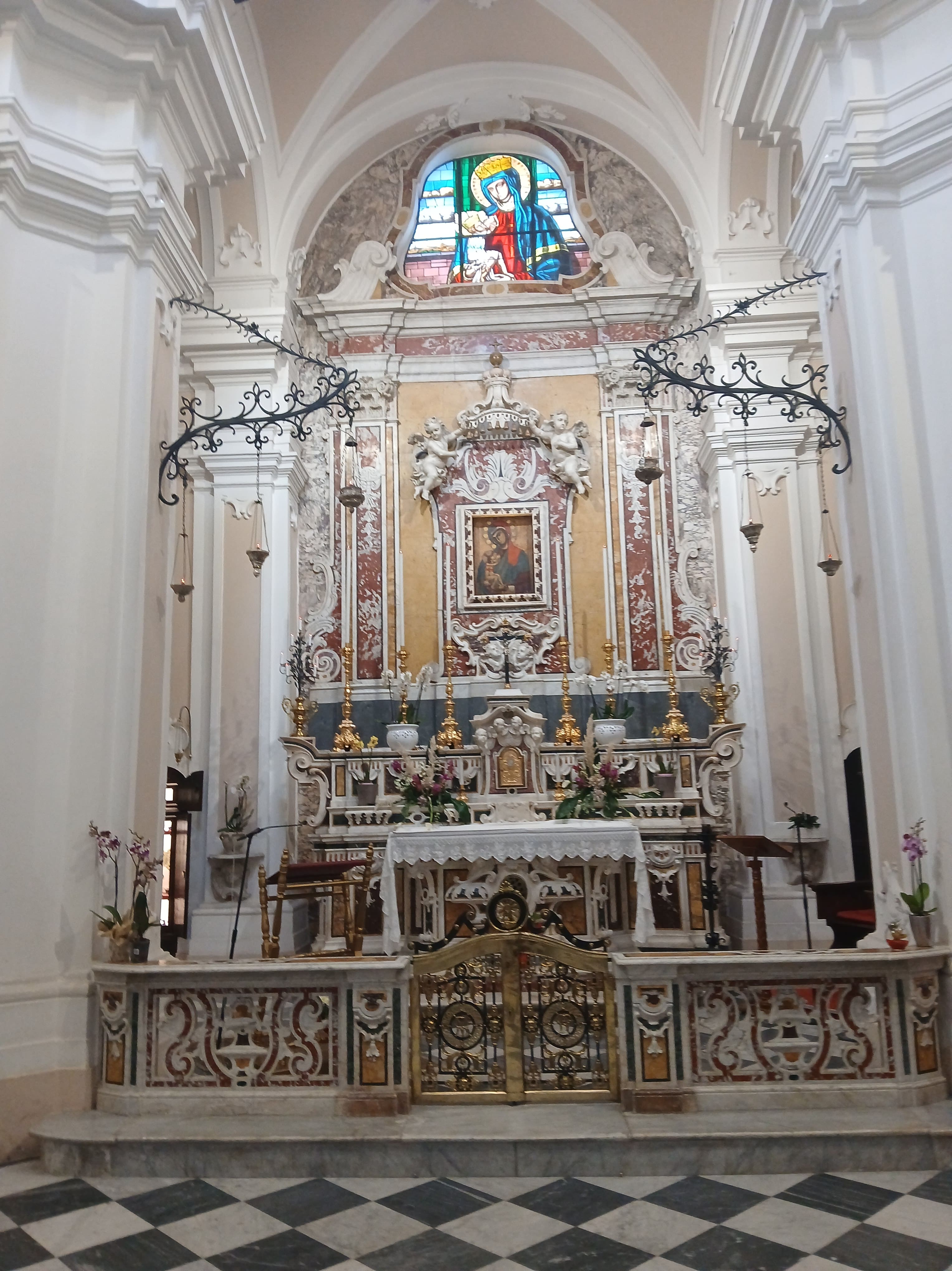 - NOTIZIE STORICO CRITICHE L'inizio del culto della Madonna del Pilerio si fa tradizionalmente risalire al 1576, al cosiddetto miracolo della peste; in quell'occasione la Madonna venne elevata a Patrona della Città di Cosenza. La leggenda narra che la peste imperversava sulla città ed un fedele, in preghiera, si rese conto della miracolosa apparizione sul volto della Vergine di quello che sembrava essere un "bubbone pestifero". Il fenomeno venne constato dalle autorità ecclesiastiche del tempo e da una moltitudine di fedeli che vide, in quel simbolo, la salvezza della città dalla pestilenza. Il dipinto divenne oggetto di venerazione da parte dei cosentini che iniziarono ad indicarlo come "quadro divino". La figura della Madonna del Pilerio è immersa su di uno sfondo d'oro che simboleggia la gloria dei cieli, la sua veste marrone, indica l'umanità della Madonna, il blu del manto rappresenta il suo rapporto privilegiato con la trascendenza, il bianco esprime la sua purezza, il velo rosso indica il suo essere ricoperta dalla grazia divina. Maria è dunque una creatura figlia dell'uomo (marrone), concepita senza macchia (blu) e l'ha riempita di grazia (rosso) per donare il Salvatore, Gesù Cristo (Cfr. Opuscolo "La Cattedrale di Cosenza"; Tuoto Giacomo, La Cattedrale di Cosenza, Cosenza, Pellegrini, 2022)